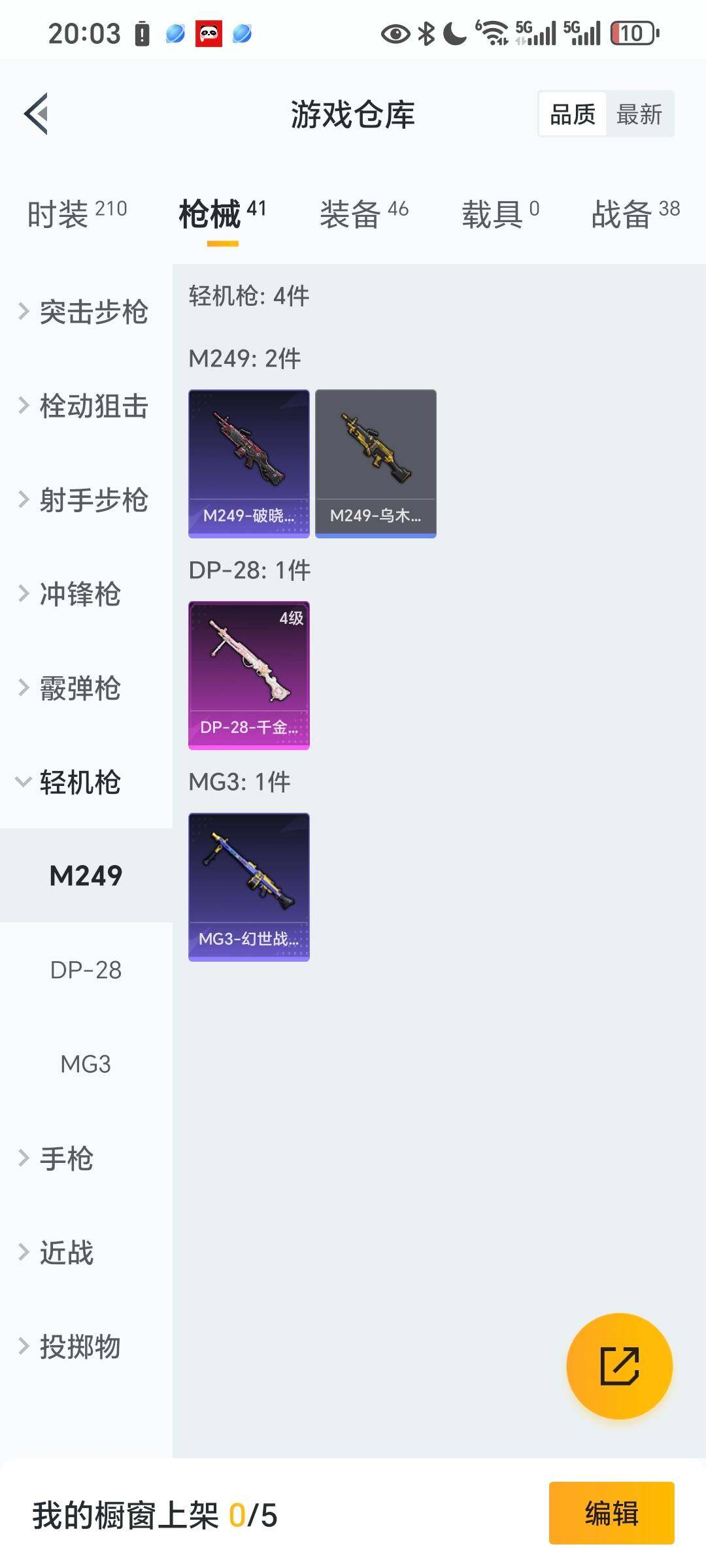 44套装/枪械2/装备46/战备38/热力值13882/五级Kar98K-巳巳如意/四级DP-28-千金淑猫/Kar98K-巳巳如意/DP-28-千金淑猫/春暖花开降落伞/炫紫旋律降落伞/千金淑猫降落伞/巳巳如意/AKM-PEL轰鸣竞梦者/AKM-玉龙/AKM-生命誓言/AKM-虎虎生威/AKM-霓虹街区/M16A4-红色方程式/SCAR-L-生命誓言/M416-蓝色火焰/QBZ-洛神天依/M7