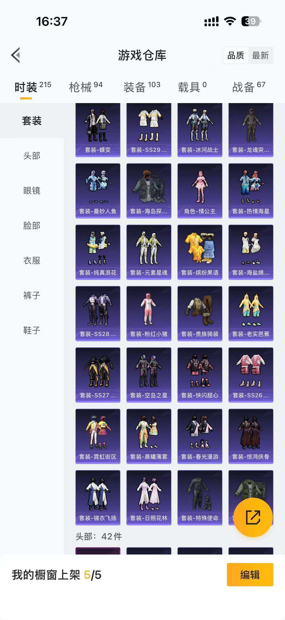 56套装/枪械3/装备103/战备67/王牌印记1/热力值24267/五级M416-电玩时刻/五级Kar98K-巳巳如意/五级DP-28-豹影疾电/套装-粉红小猪/金丰海韵/M416-电玩时刻/Kar98K-巳巳如意/DP-28-豹影疾电/闲梦青缨降落伞/创世·救赎降落伞/忍者神龟降落伞/临安公主降落伞/绯穹魔姬降落伞/巳巳如意/套装-糖糖葫芦/套装-青团波波/套装-棉花软糖/角色-许七安/角色