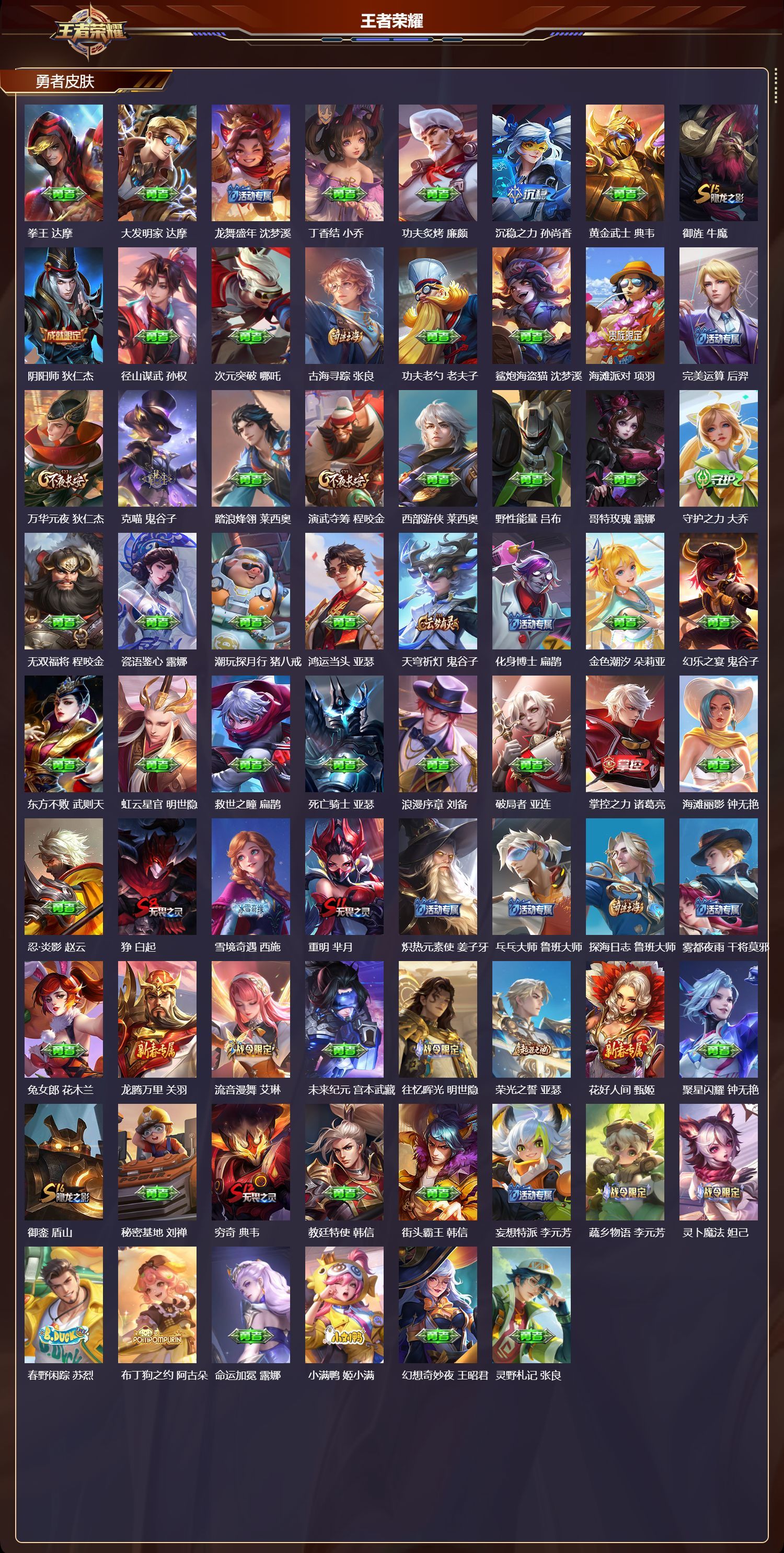 安卓QQ/无双王者/196皮肤/126英雄/1典藏/0珍品无双/0无双/2珍品传说/6传说/59史诗