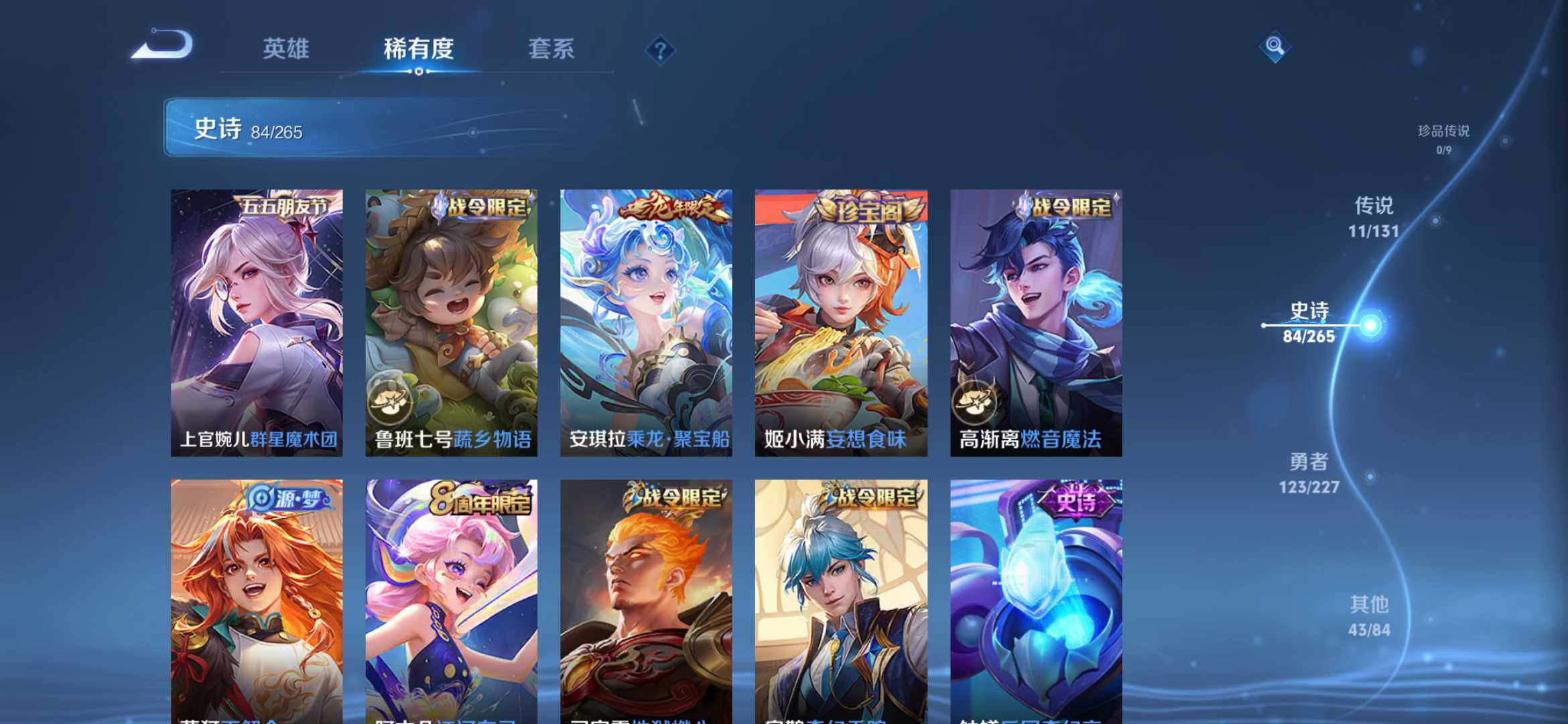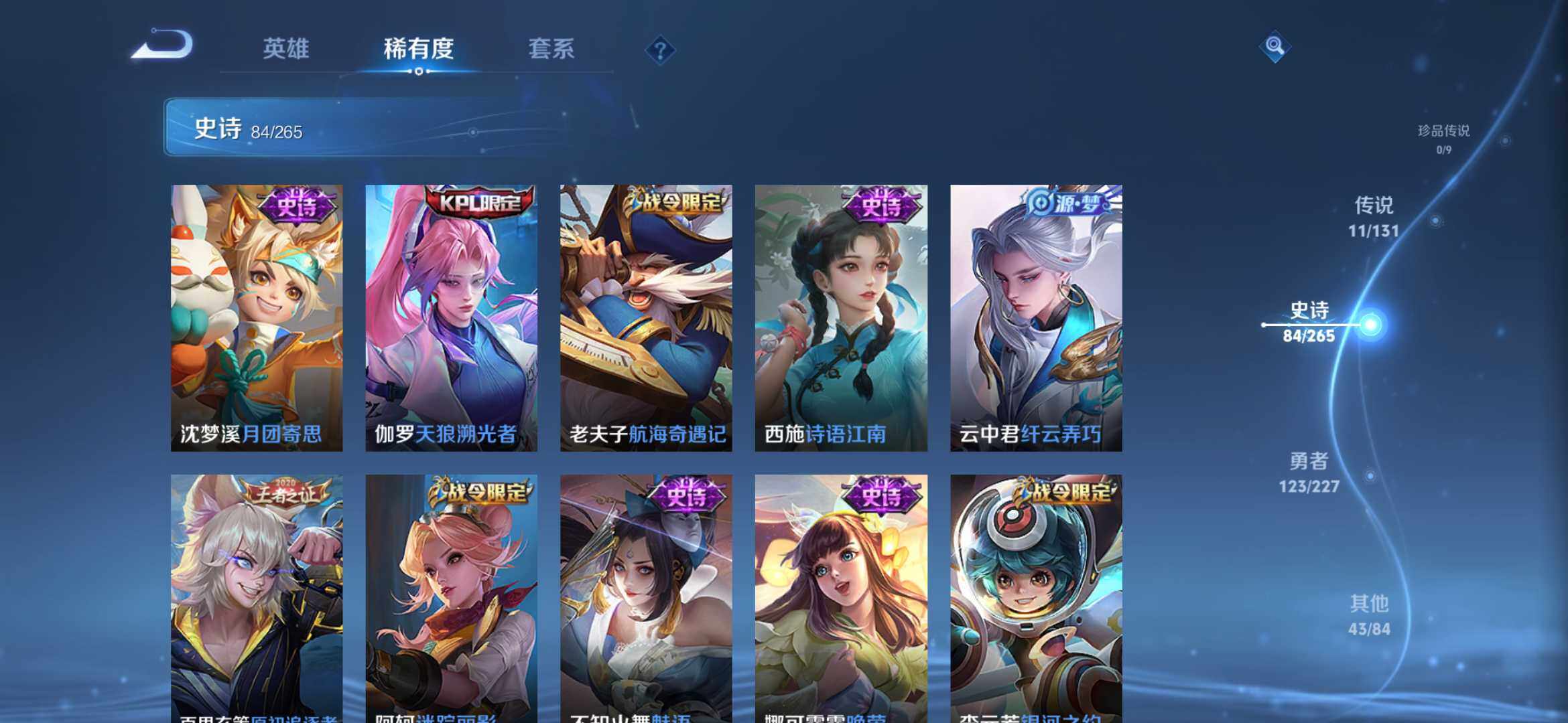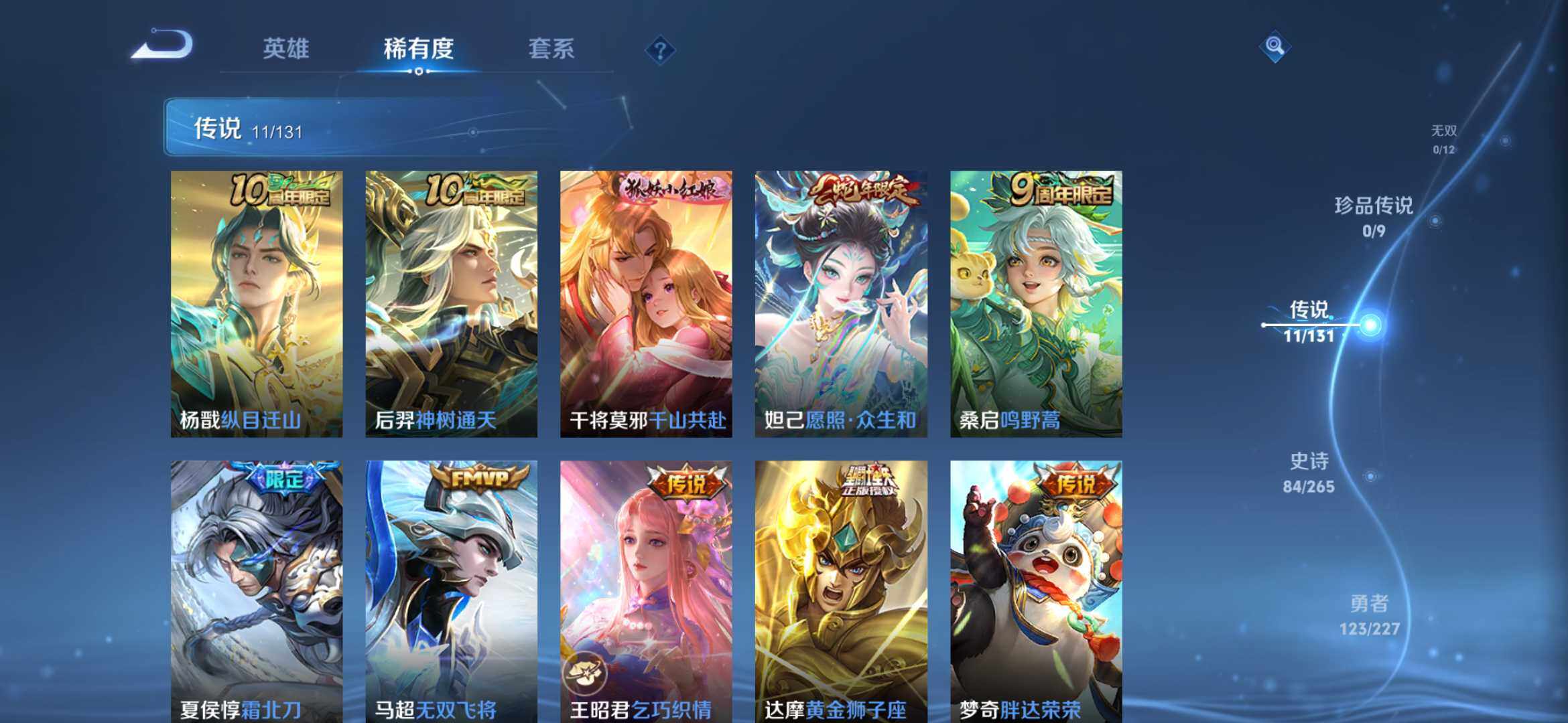 【传说皮肤】:杨戬纵目迁山,后羿神树通天,干将莫邪千山共赴,妲己愿照众生和,桑启鸣野蒿,夏侯惇霜北刀,马超无双飞将,王昭君乞巧织情,达摩黄金狮子座,梦奇胖达荣荣,宫本武藏地狱之眼