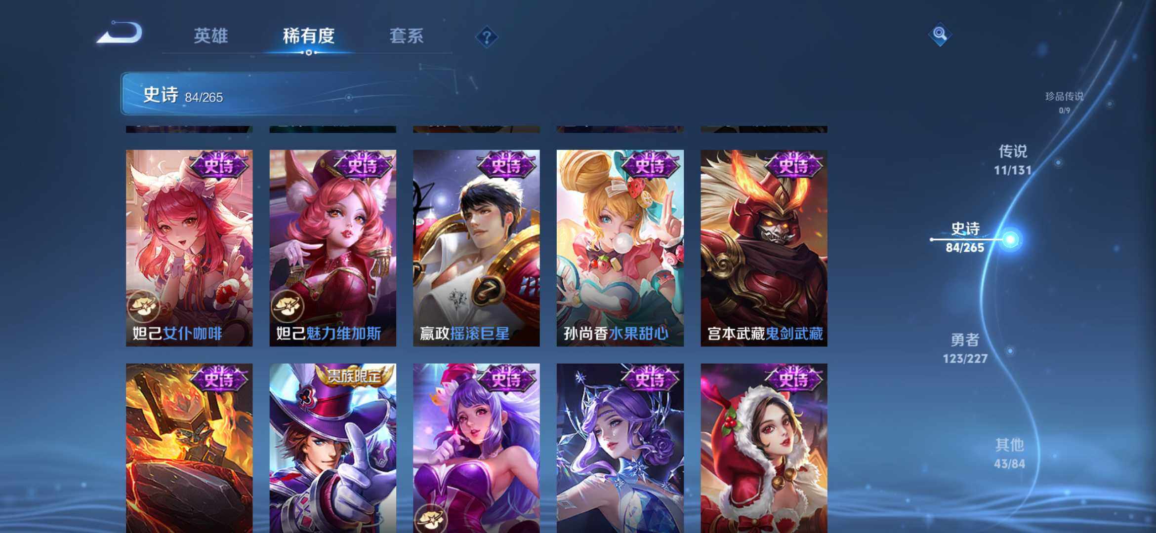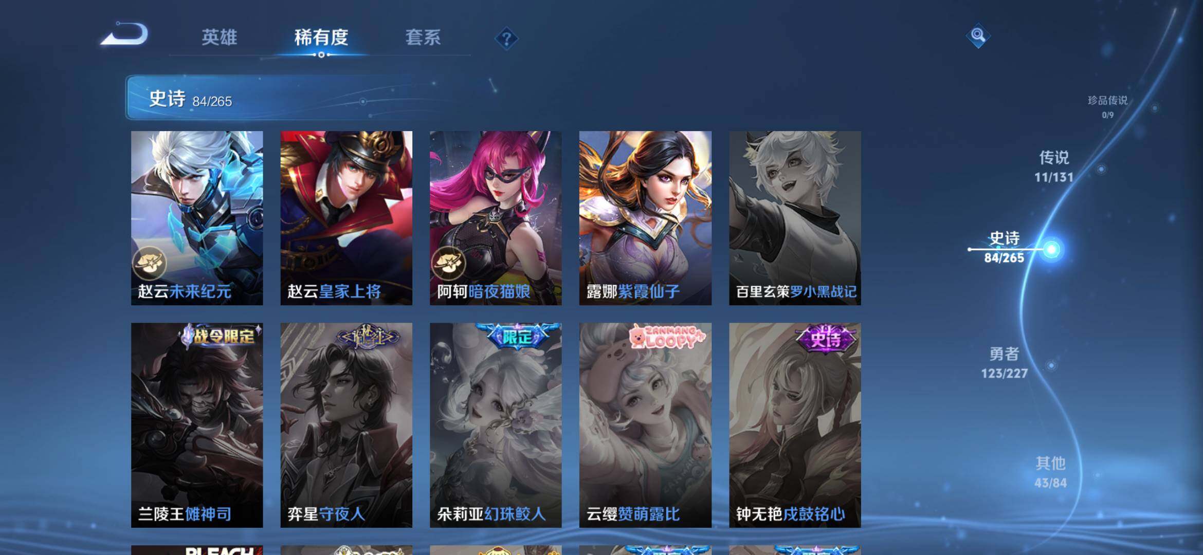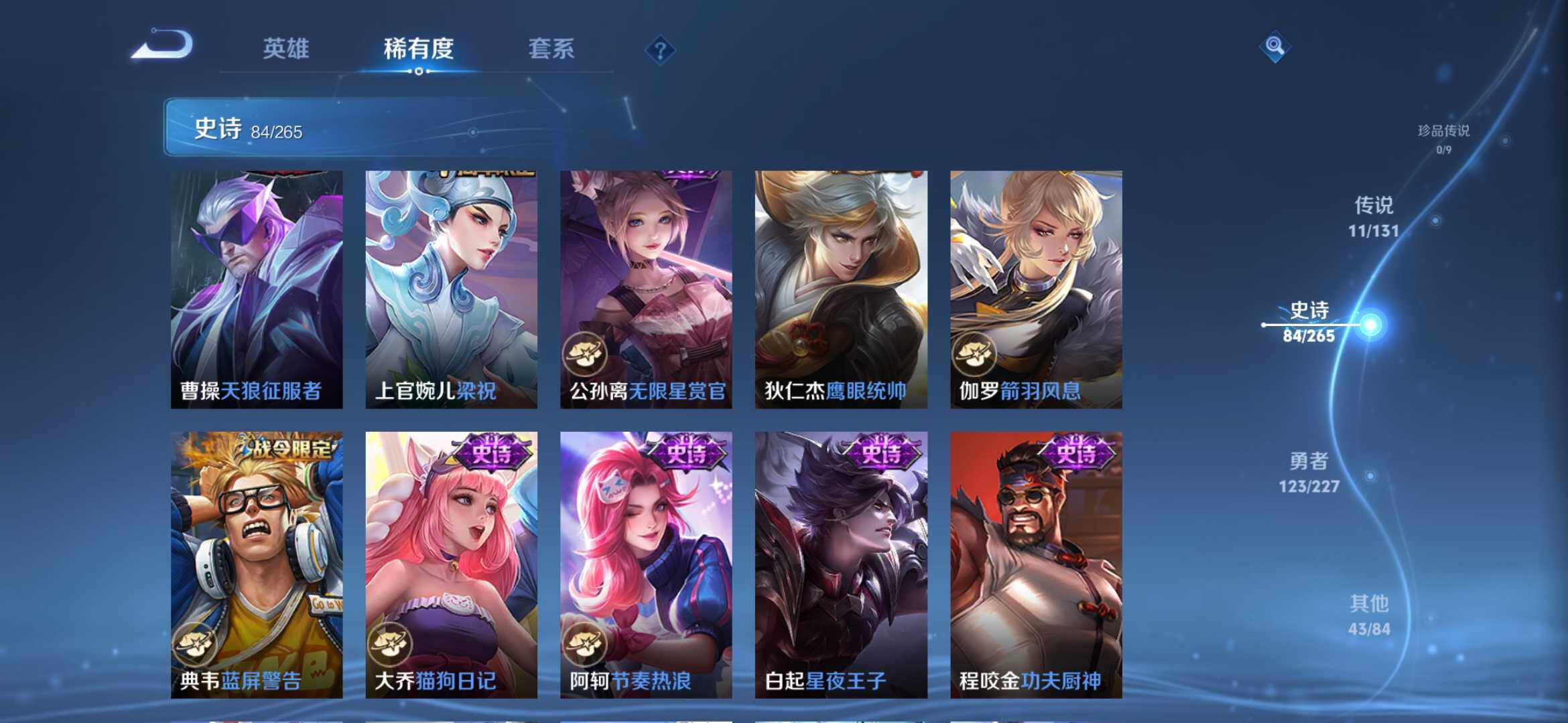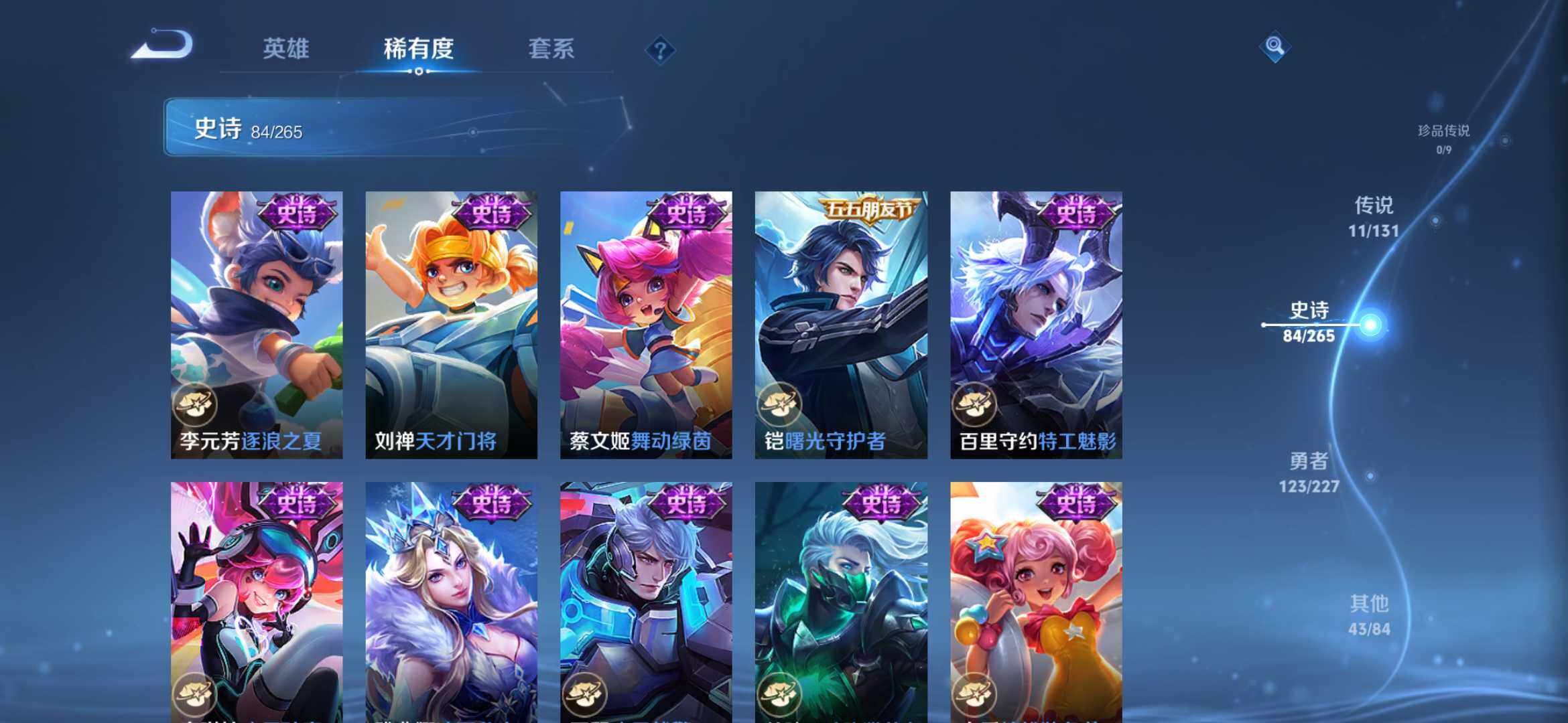 【传说皮肤】:杨戬纵目迁山,后羿神树通天,干将莫邪千山共赴,妲己愿照众生和,桑启鸣野蒿,夏侯惇霜北刀,马超无双飞将,王昭君乞巧织情,达摩黄金狮子座,梦奇胖达荣荣,宫本武藏地狱之眼