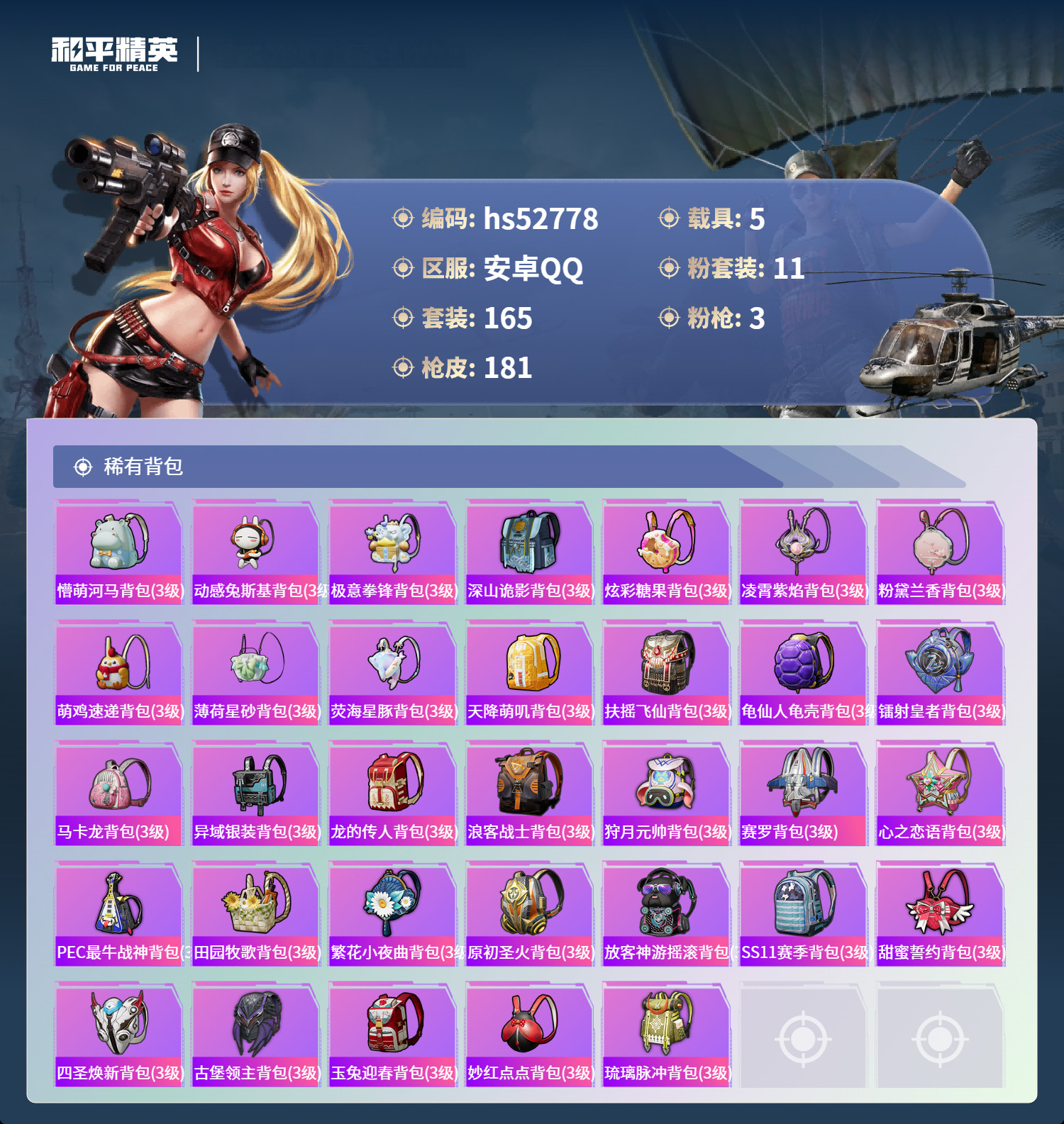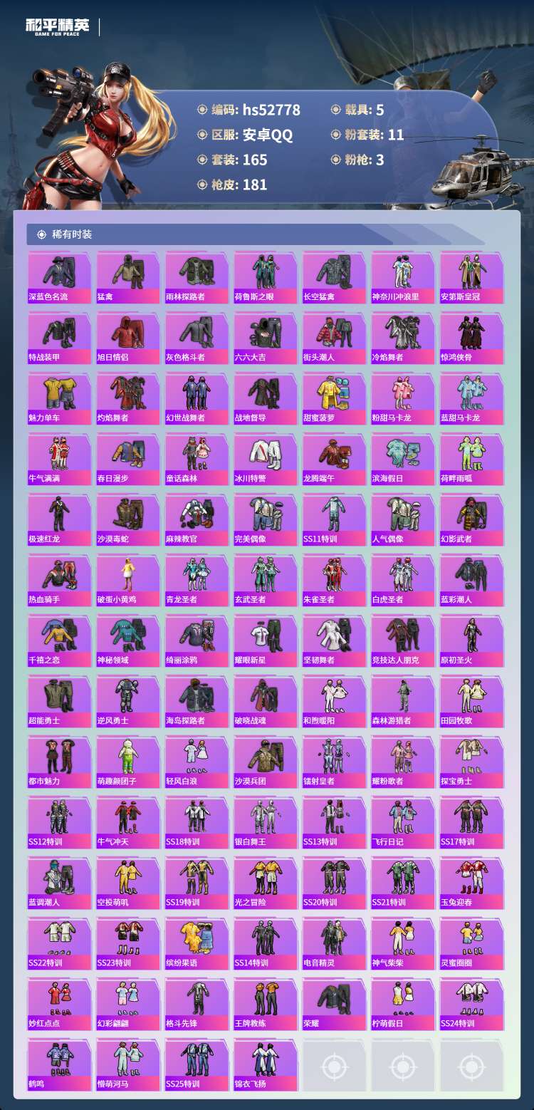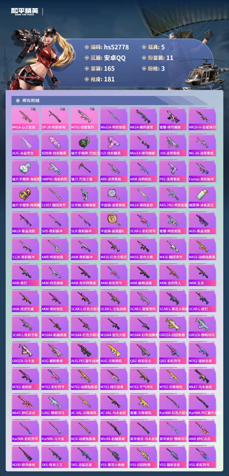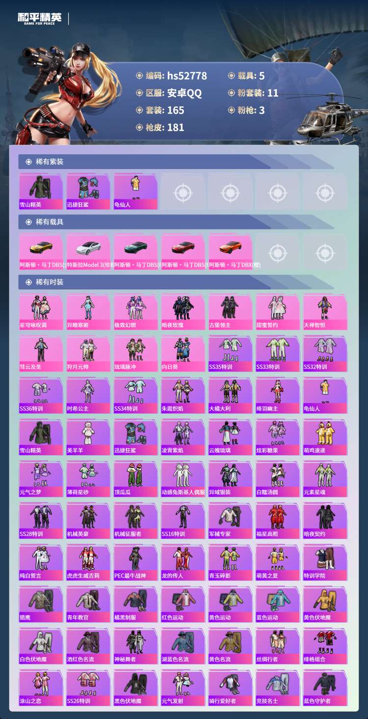 hs52778 安卓手Q-8王牌印记-11粉装-3特效枪-5载具-69075热力值-165套装-18