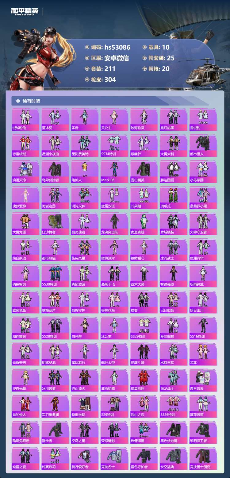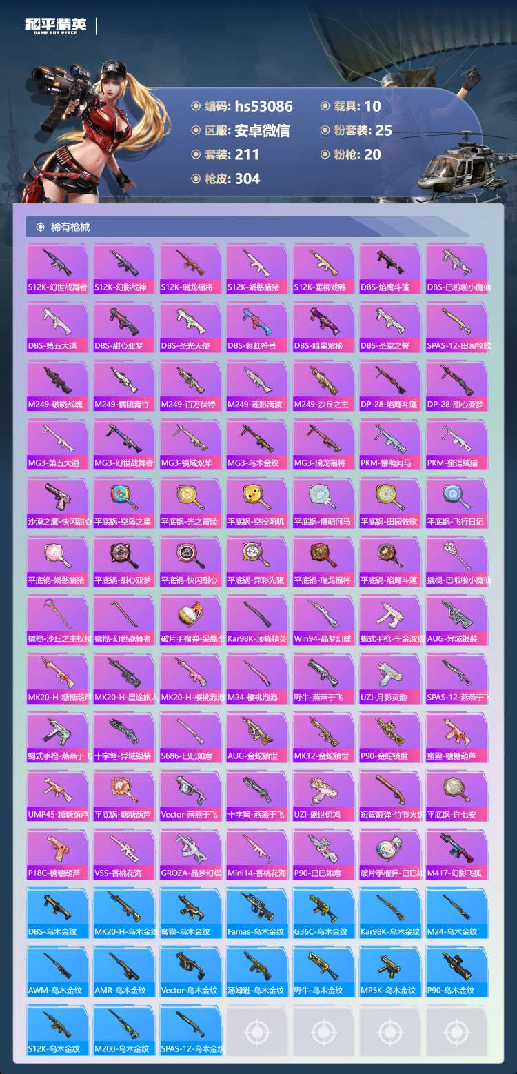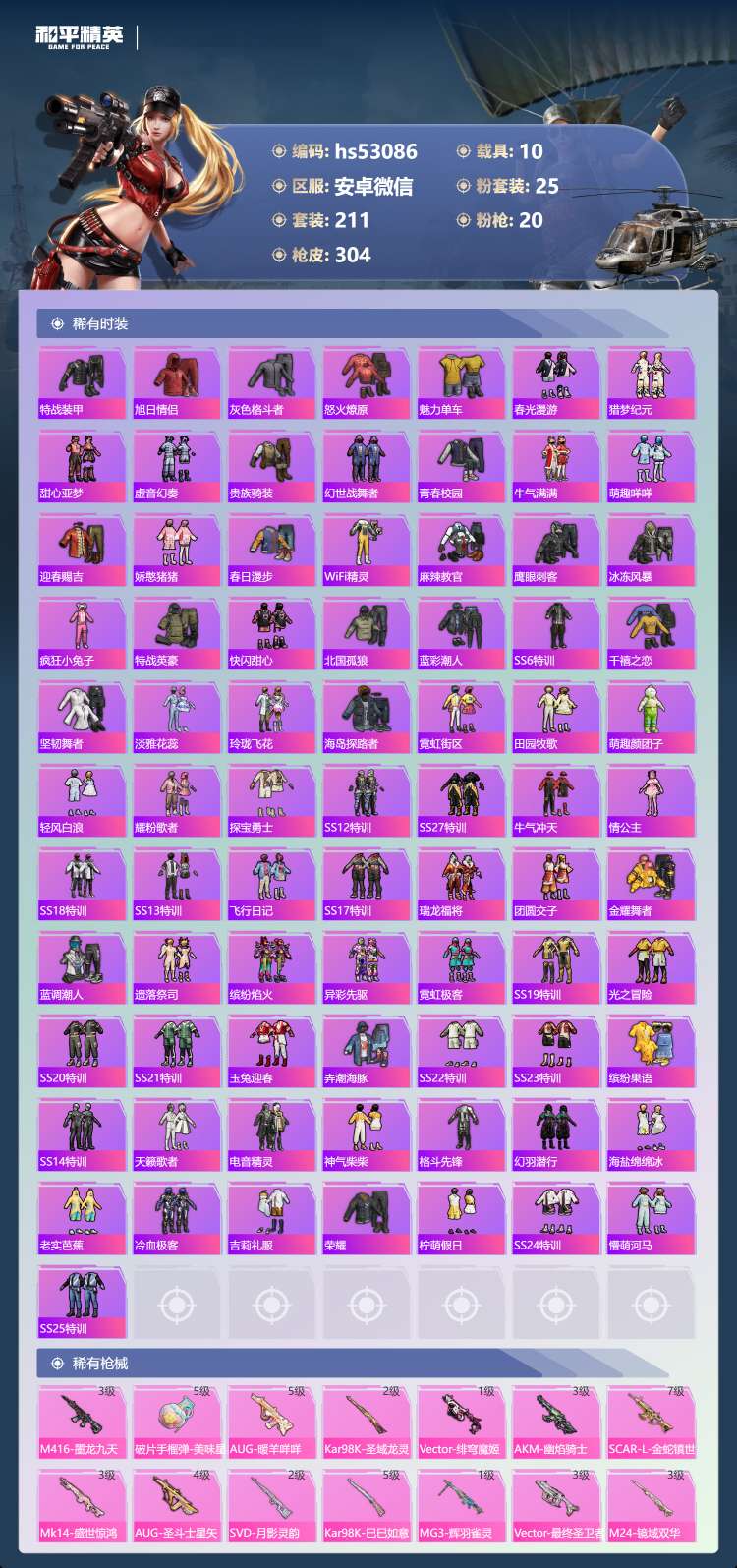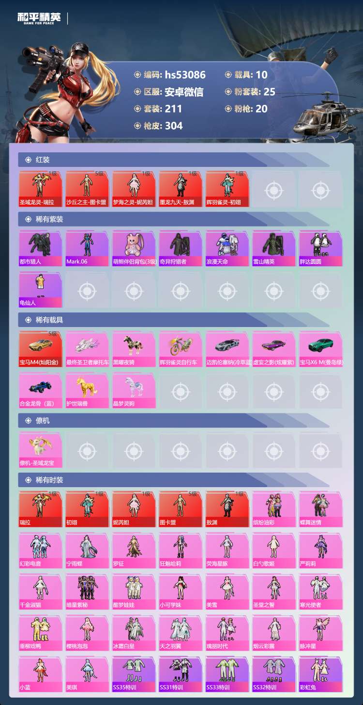 hs53086 安卓微-12王牌印记-5红装-25粉装-20特效枪-10载具-134872热力值-