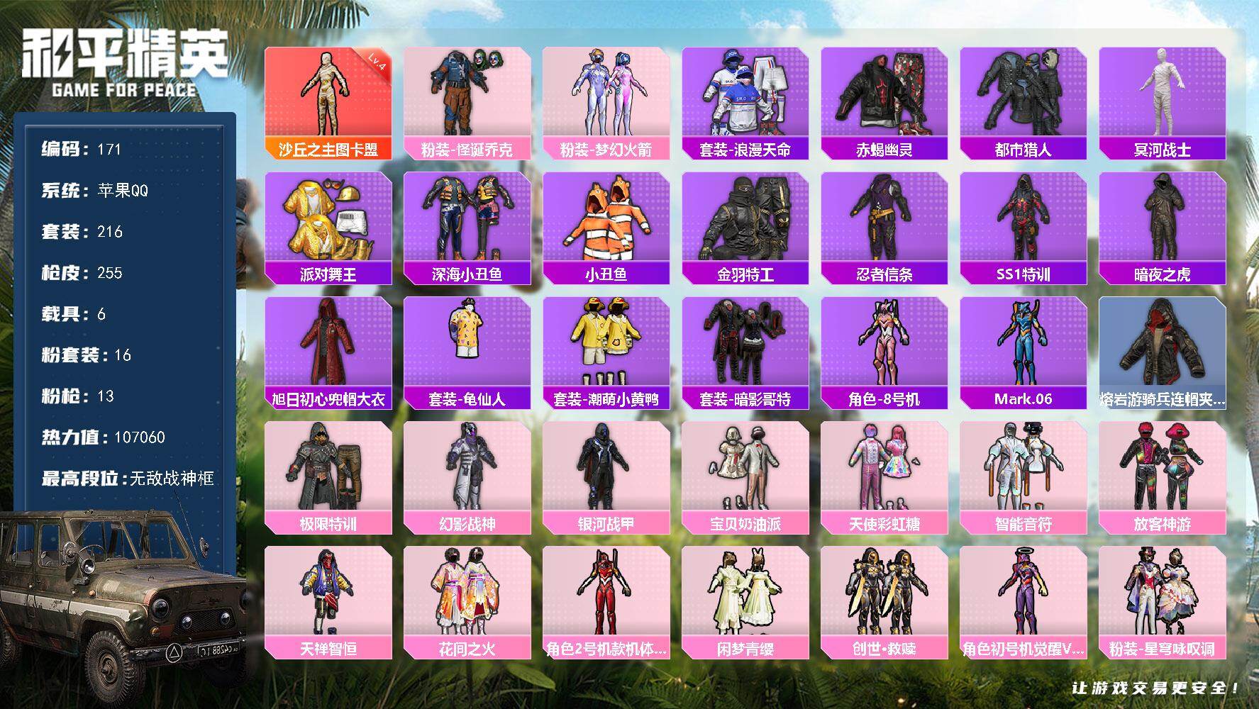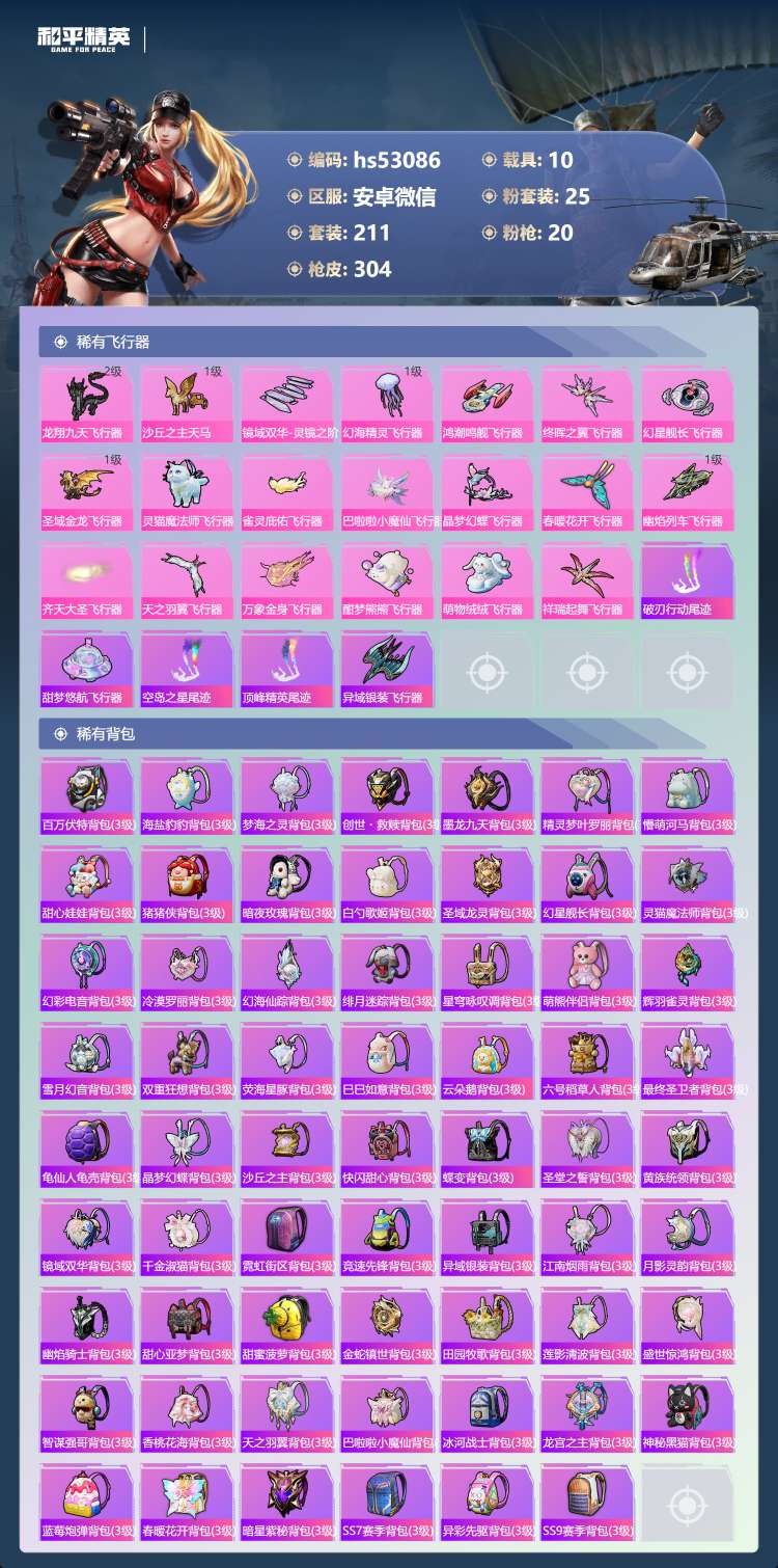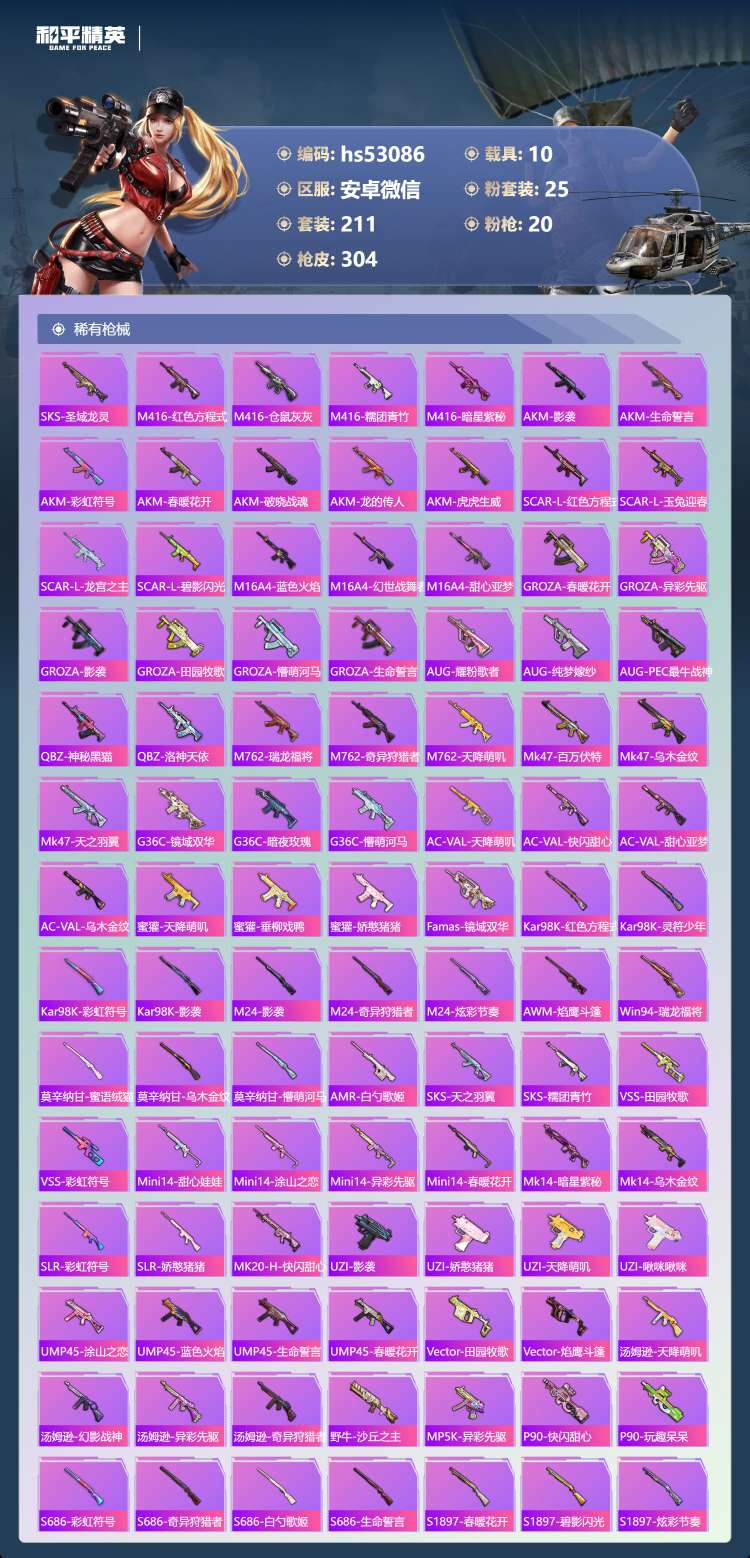 hs53086 安卓微-12王牌印记-5红装-25粉装-20特效枪-10载具-134872热力值-