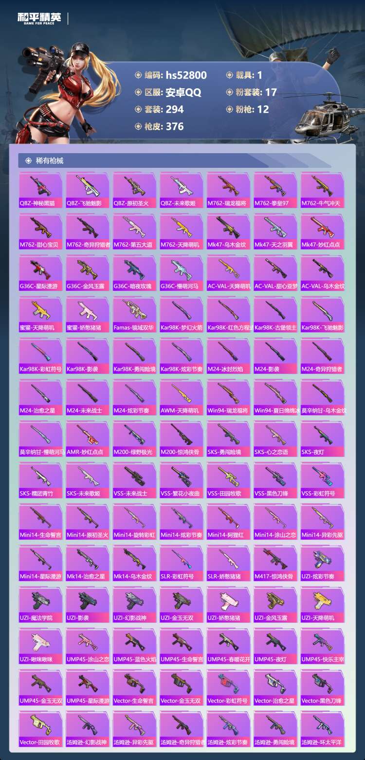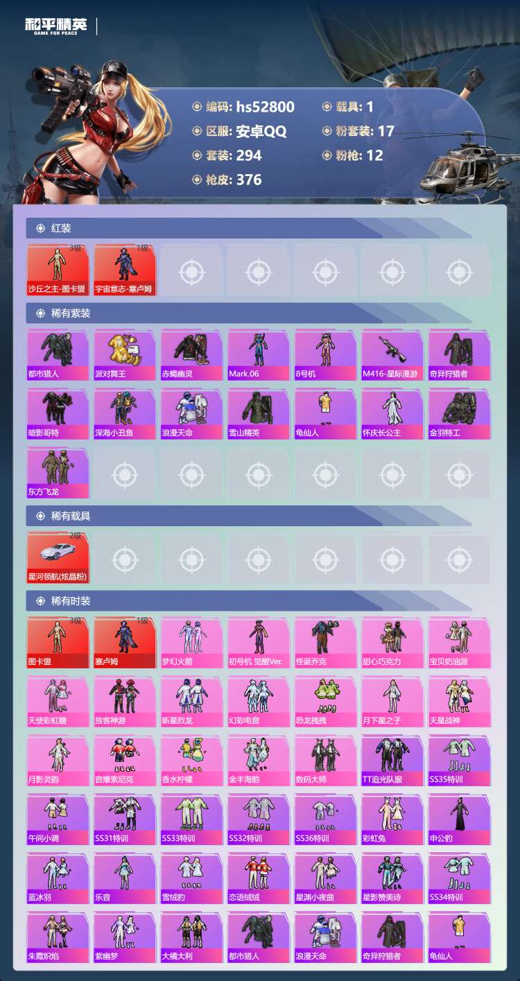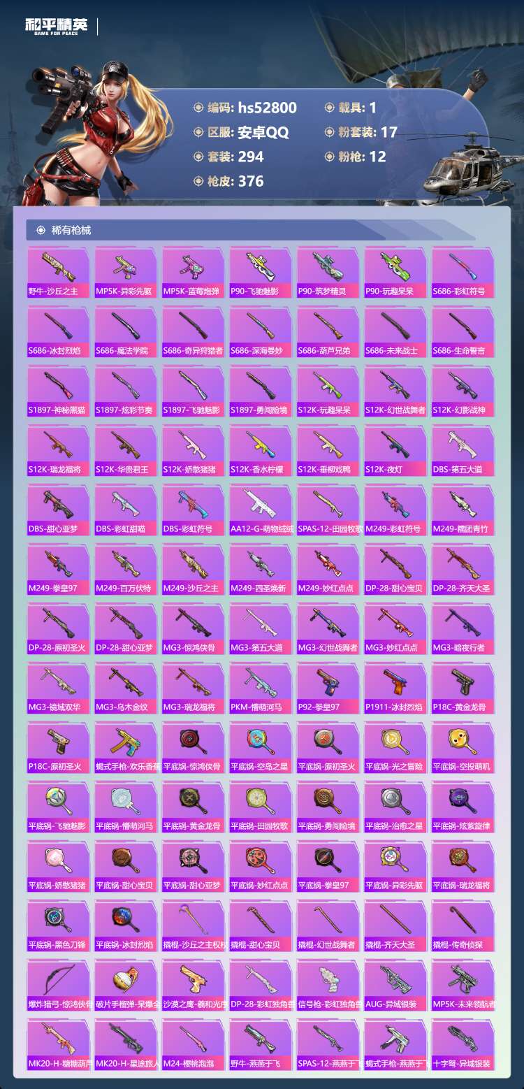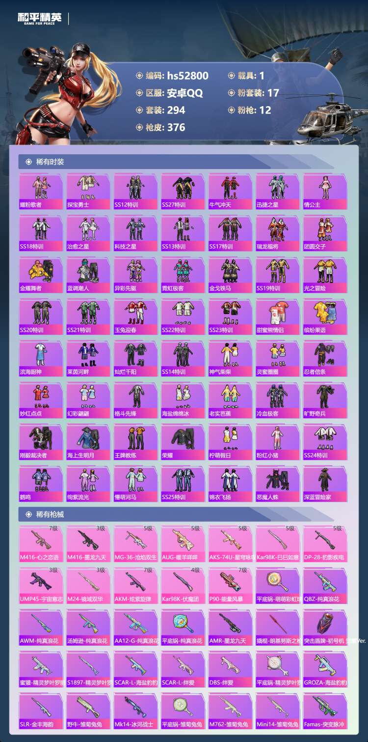 hs52800 安卓手Q-17王牌印记-2红装-17粉装-12特效枪-1载具-134235热力值-2