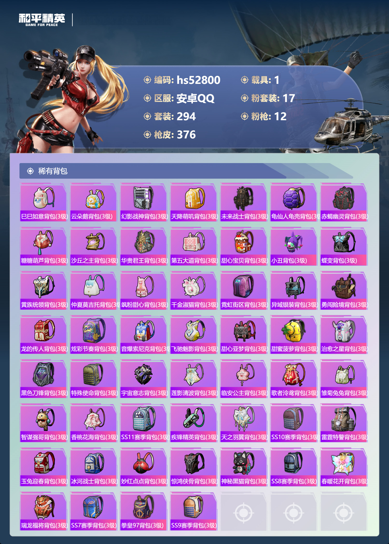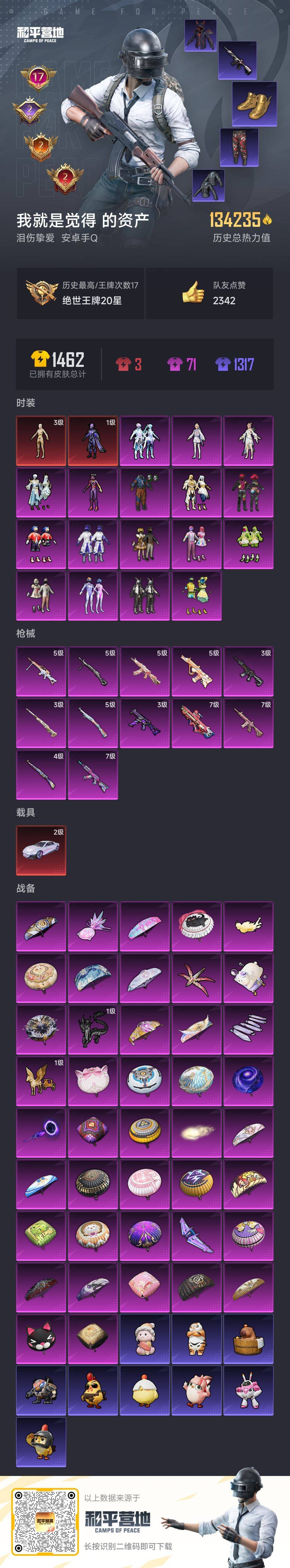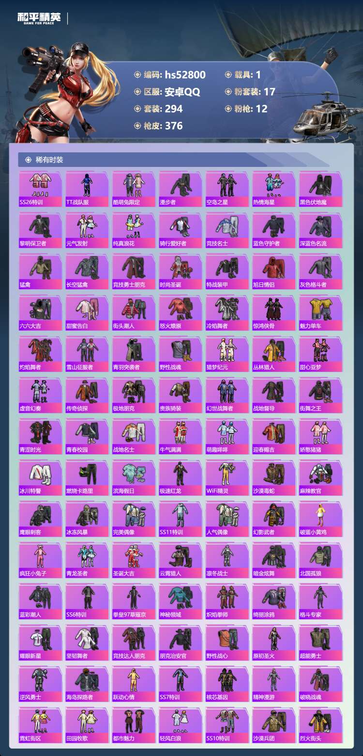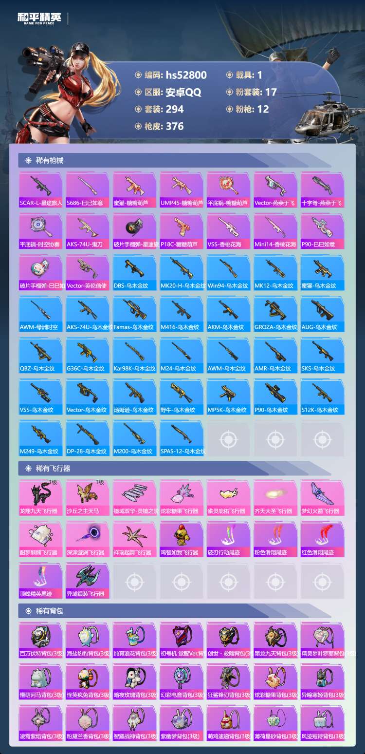 hs52800 安卓手Q-17王牌印记-2红装-17粉装-12特效枪-1载具-134235热力值-2