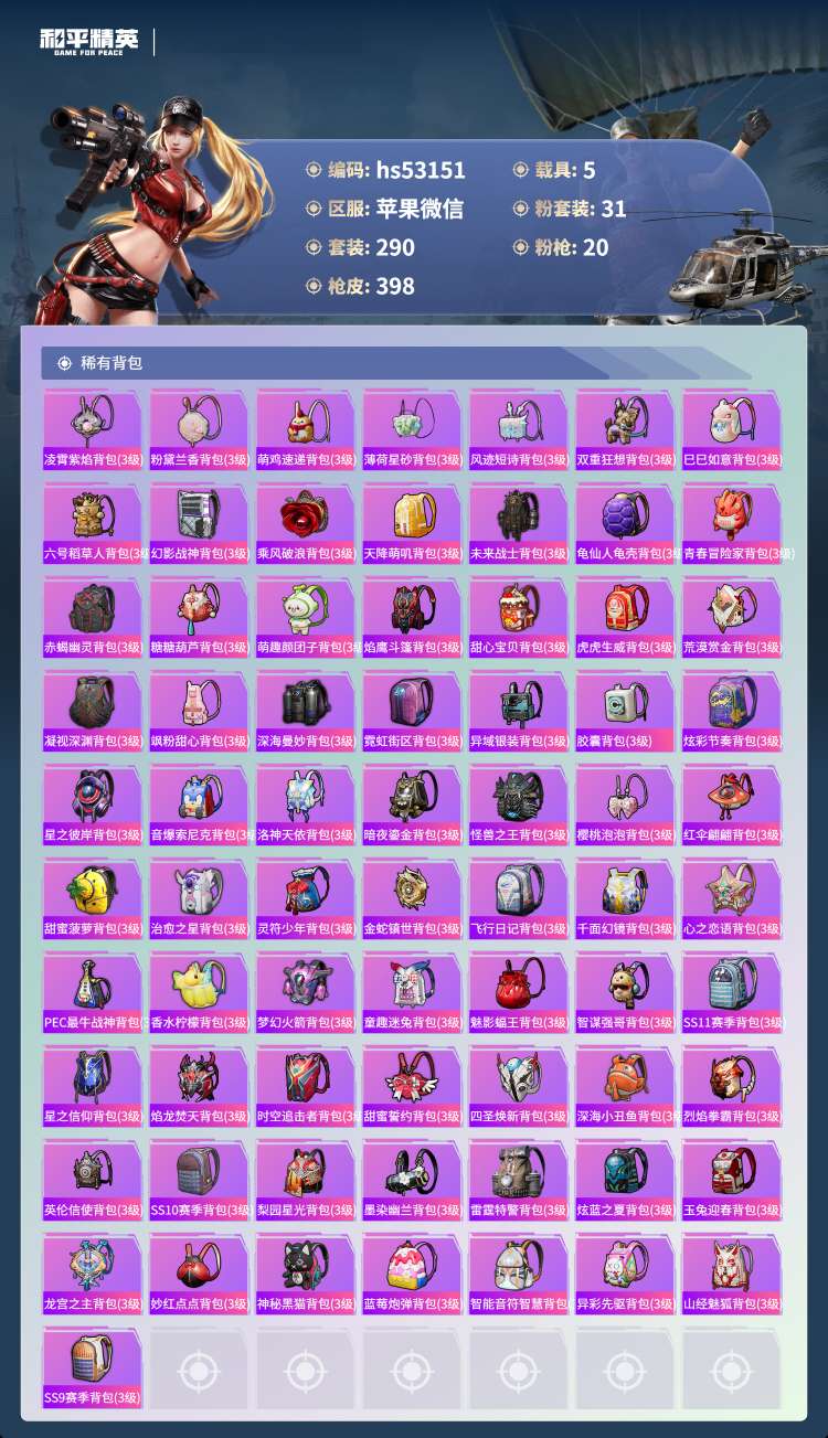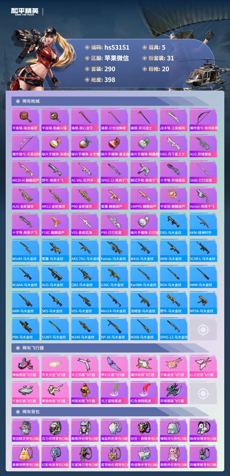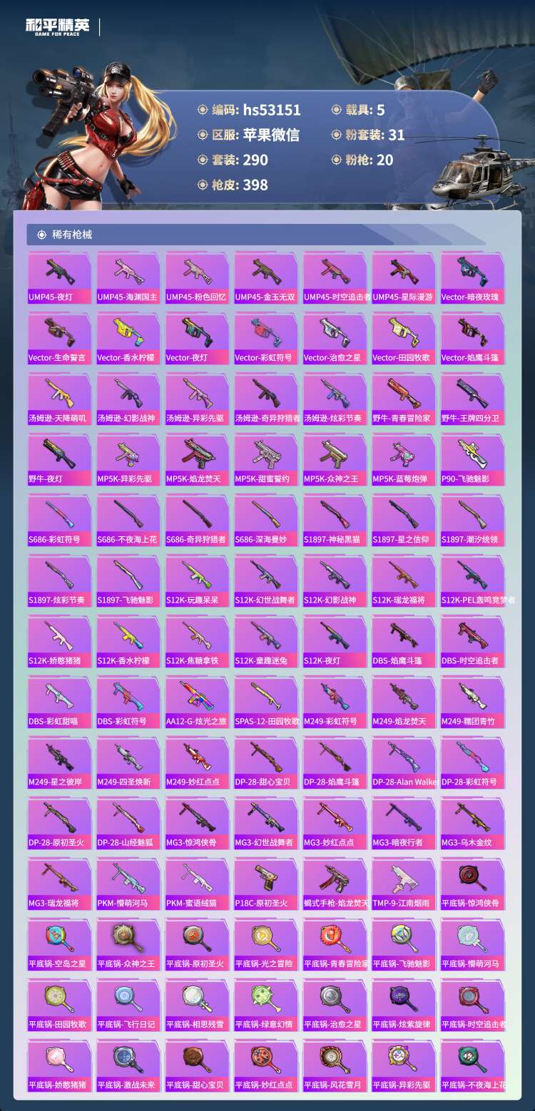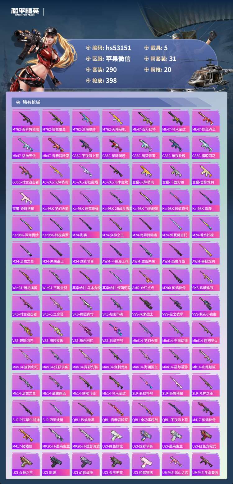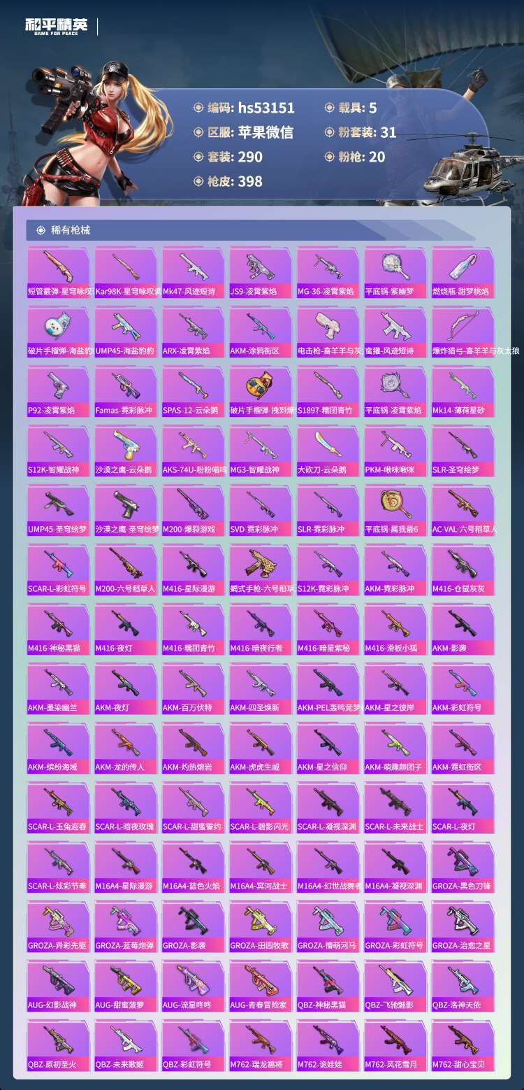hs53151 苹果v-23王牌印记-1红装-31粉装-20特效枪-5载具-149633热力值-2