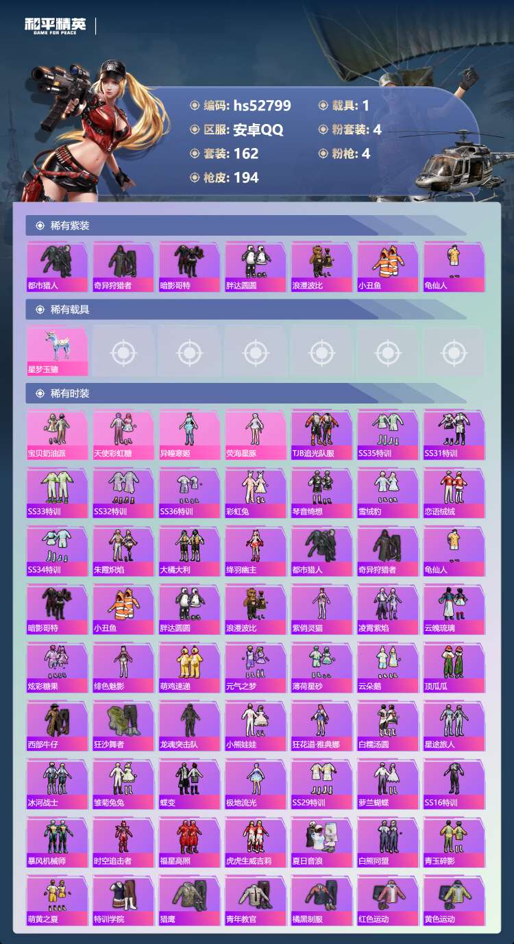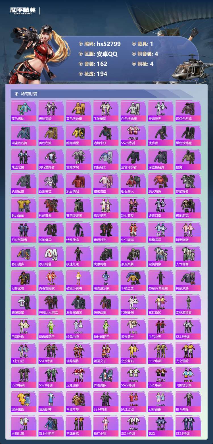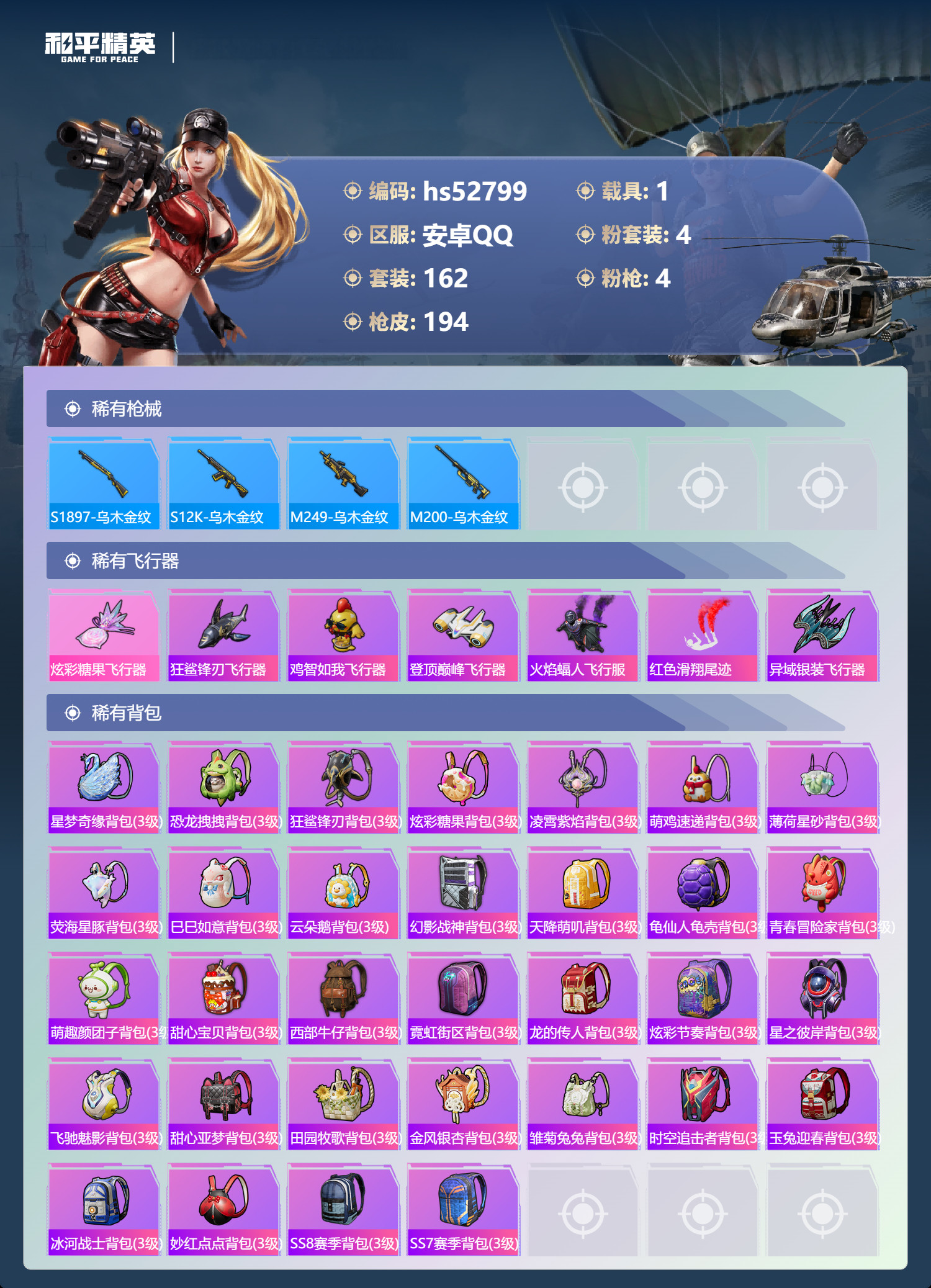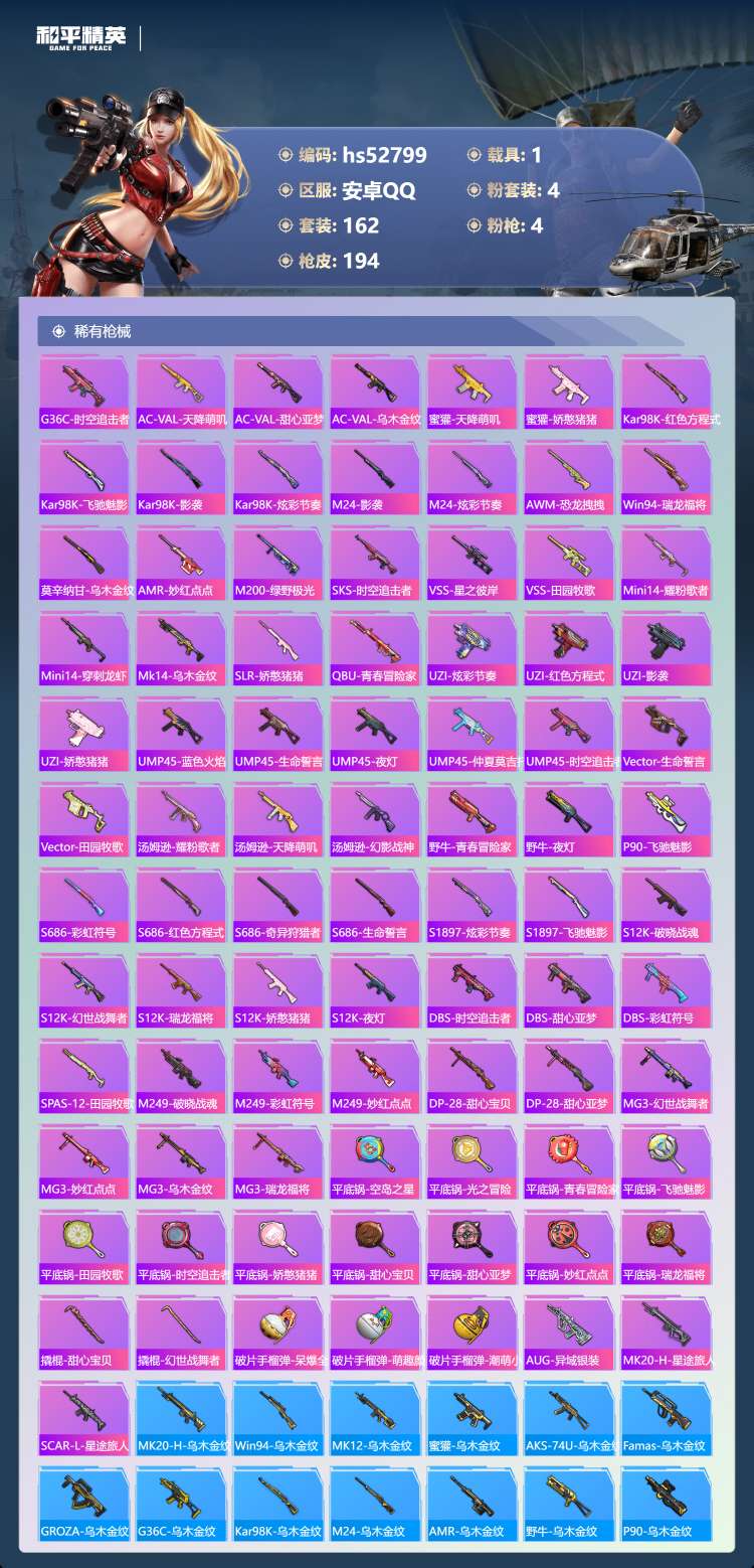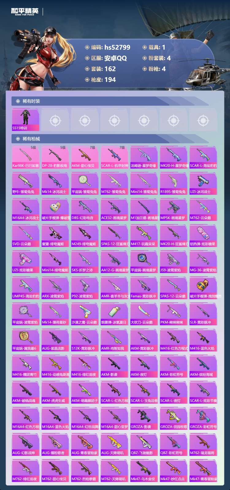 hs52799 安卓手Q-10王牌印记-4粉装-4特效枪-1载具-59034热力值-162套装-19