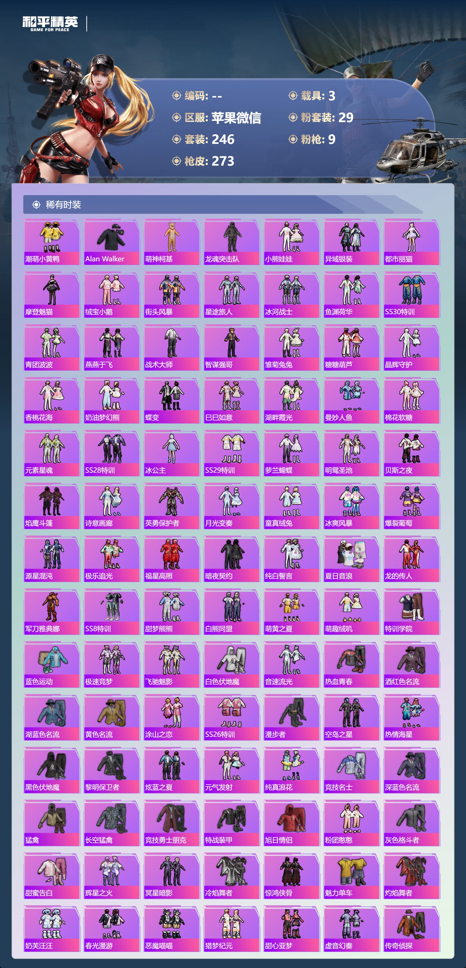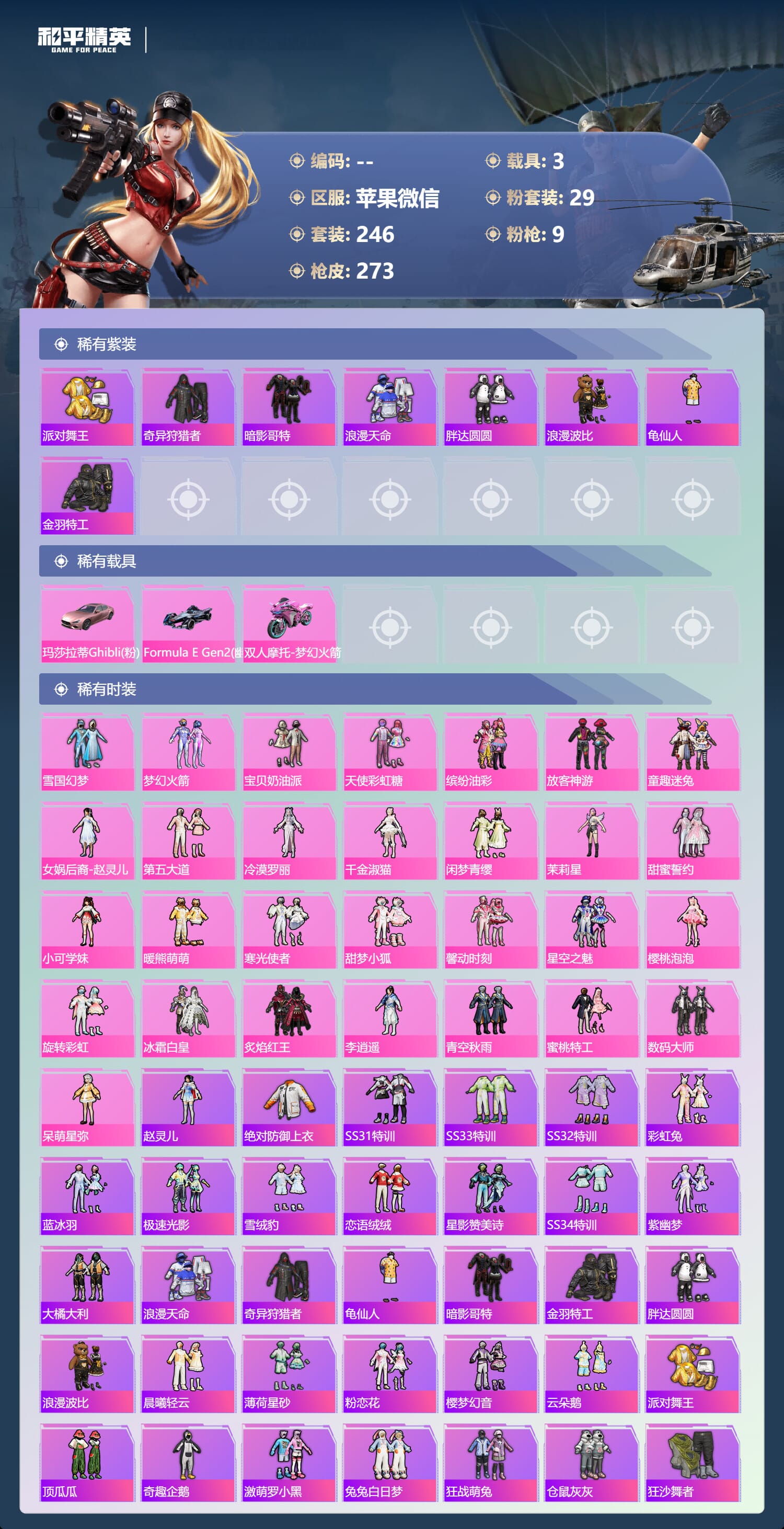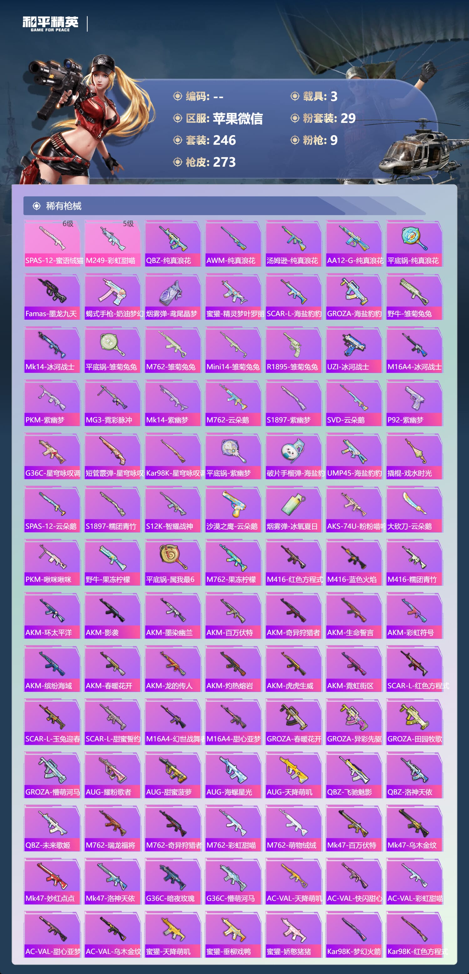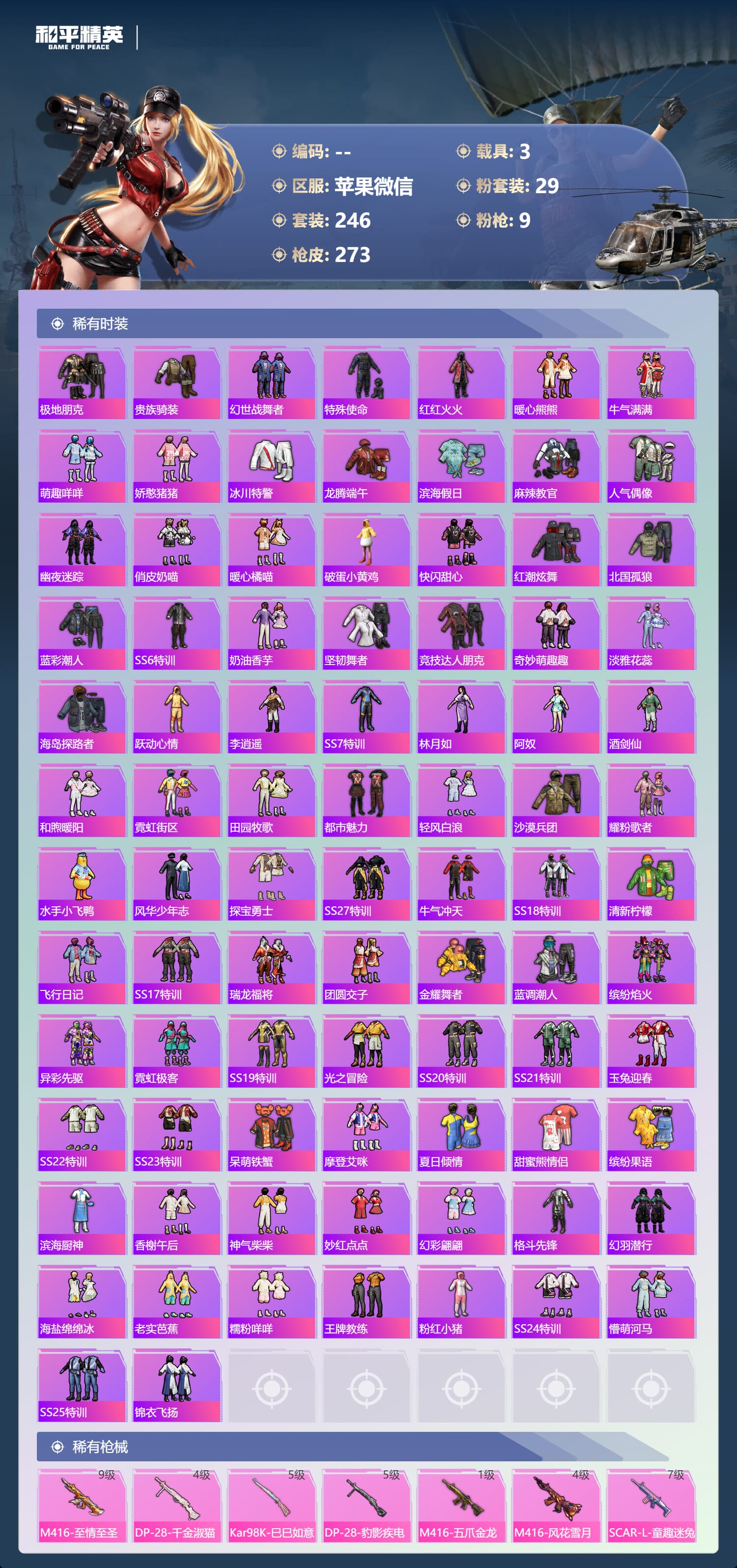 a3885/苹果v/-17王牌印记-29粉装-9特效枪-3载具-106545热力值-246套装-2