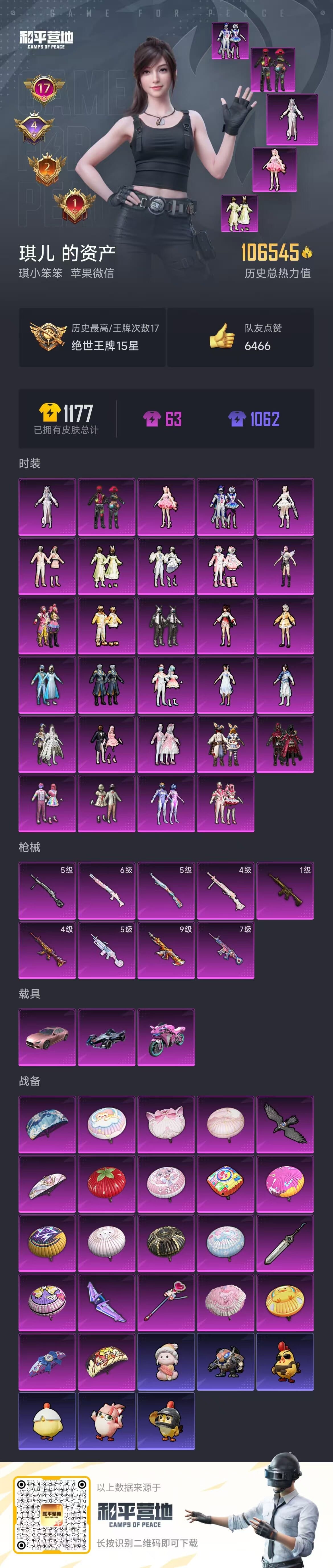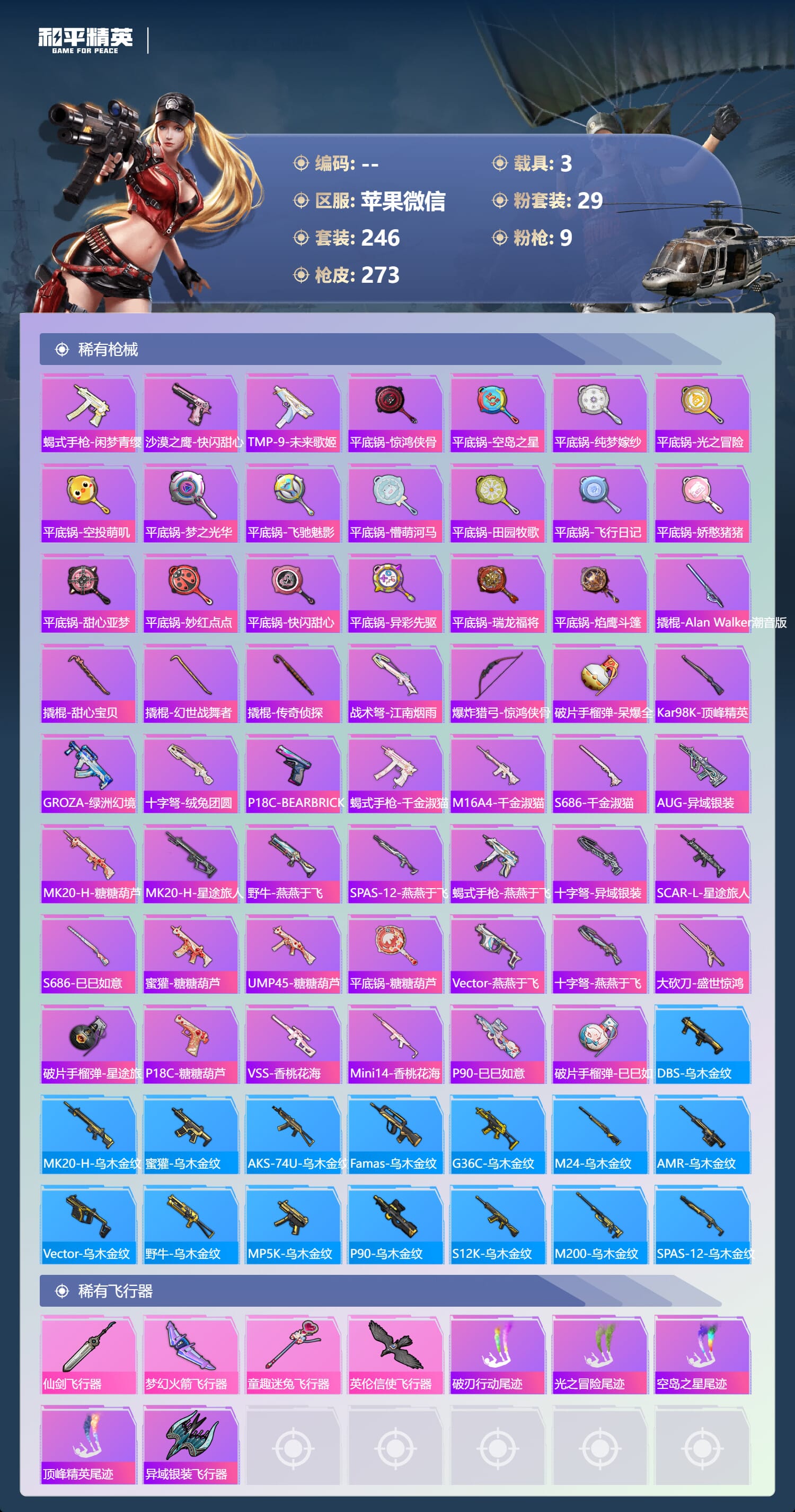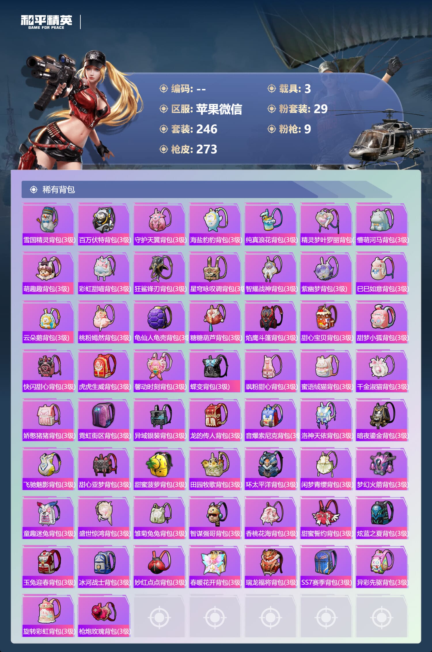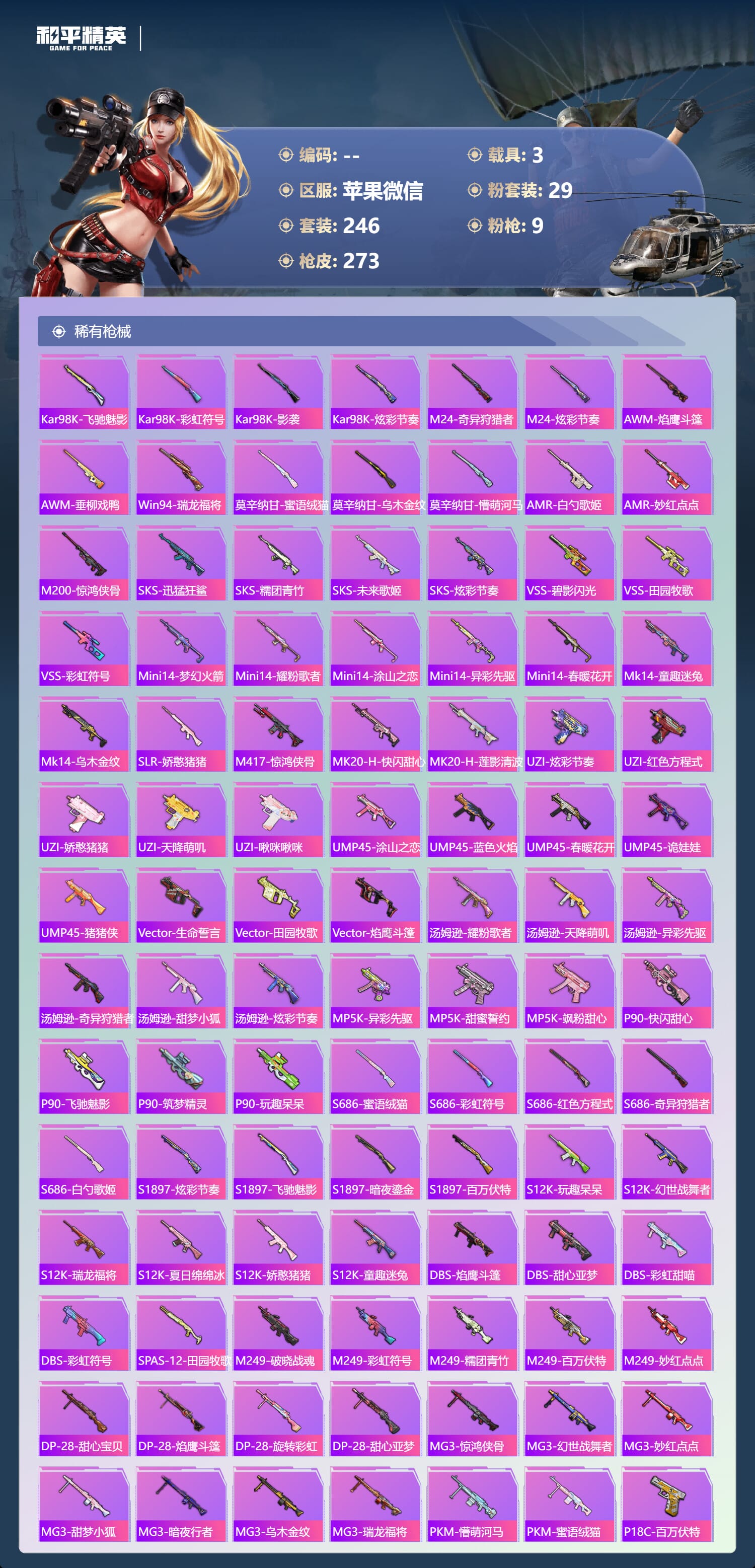 a3885/苹果v/-17王牌印记-29粉装-9特效枪-3载具-106545热力值-246套装-2