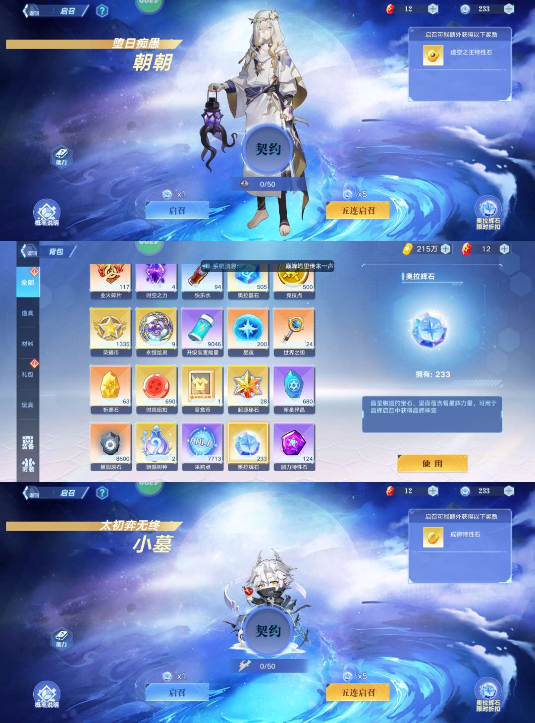 背包必有500晶石233辉石,辉石可得戒律、时空王;晶石可获得克希拉无冕之王愚者乾坤等神宠