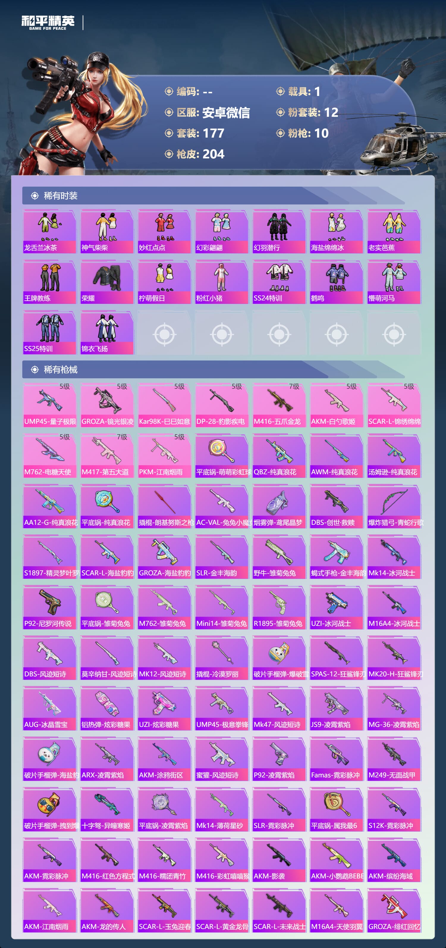 a4177/安卓微/-12王牌印记-12粉装-10特效枪-1载具-71112热力值-177套装-2