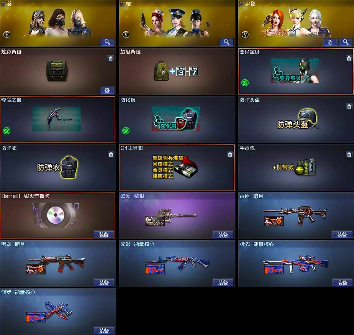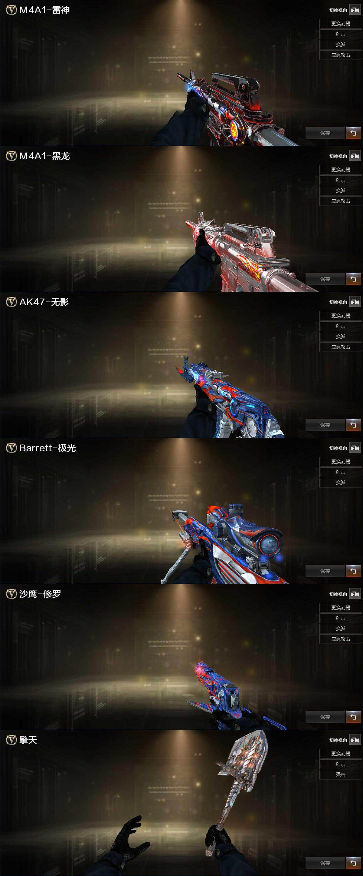 【皮肤】:雷神-暗月,黑龙-暗月,无影-能量核心,极光-能量核心,修罗-能量核心,擎天-秘银
