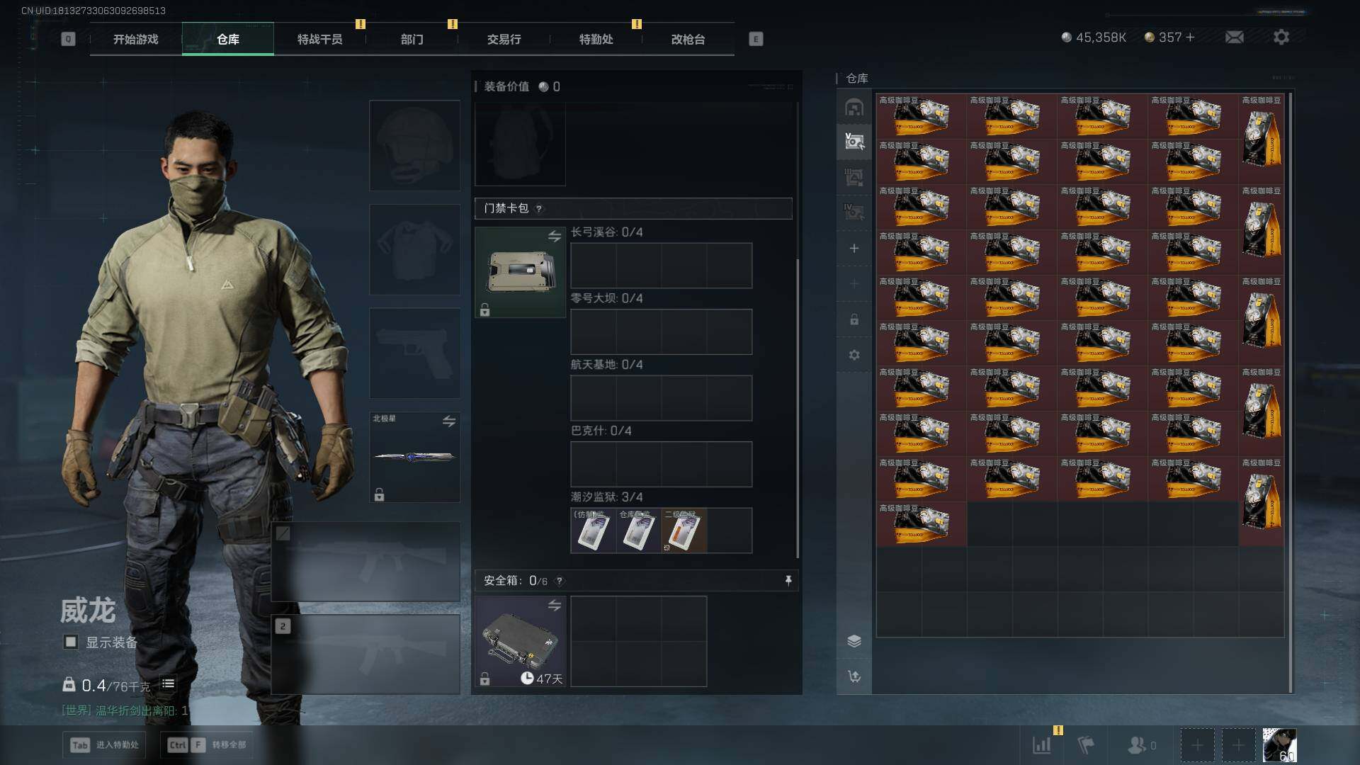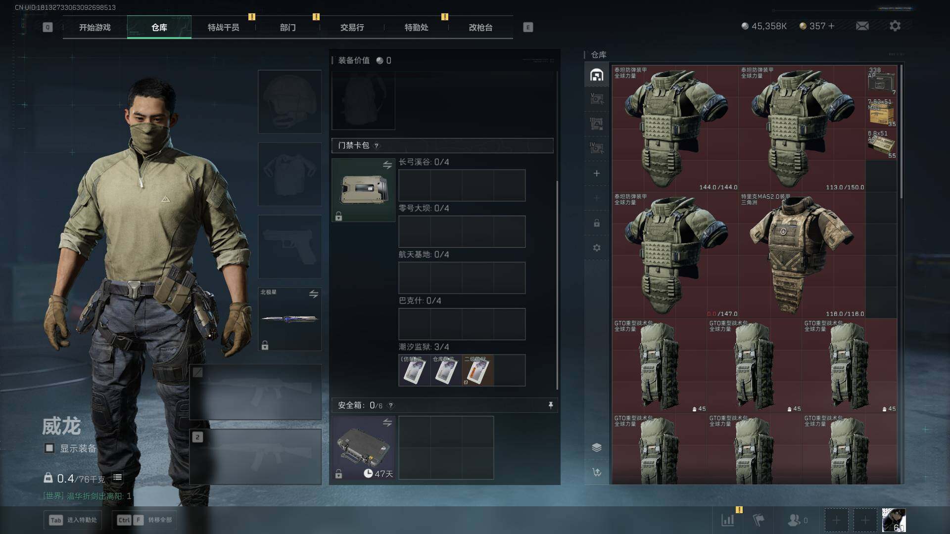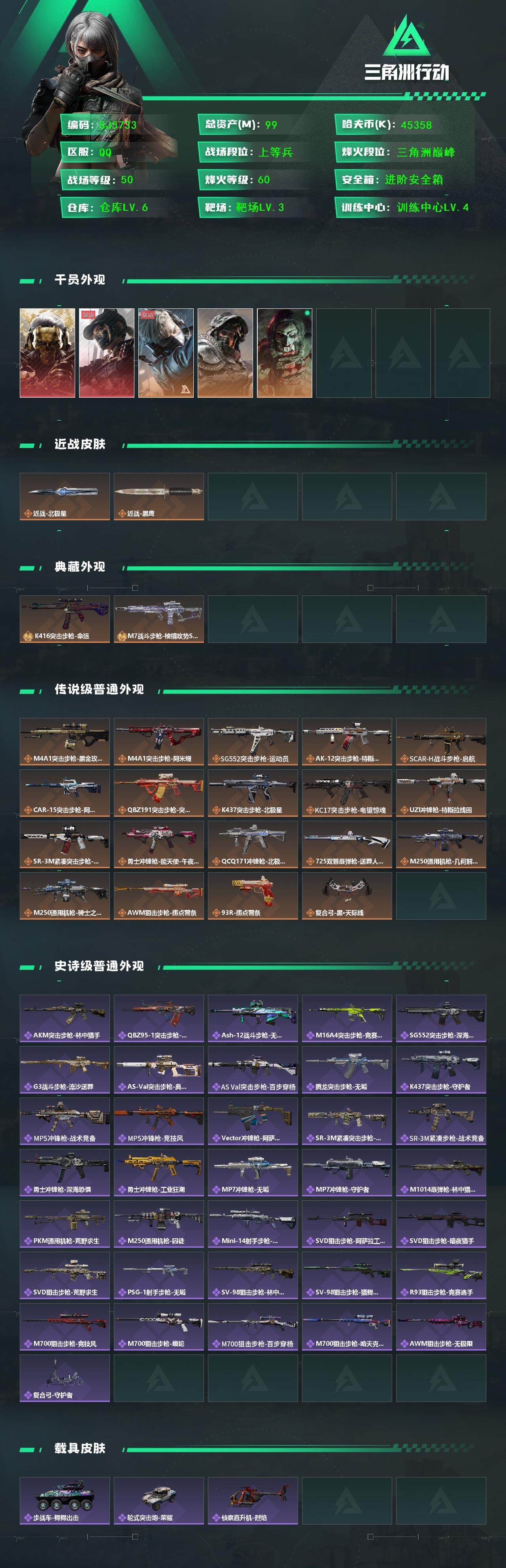 总资产(M):99M/哈夫币(K):45358K/哈夫币(K):45358K/传说枪皮数:21/全面