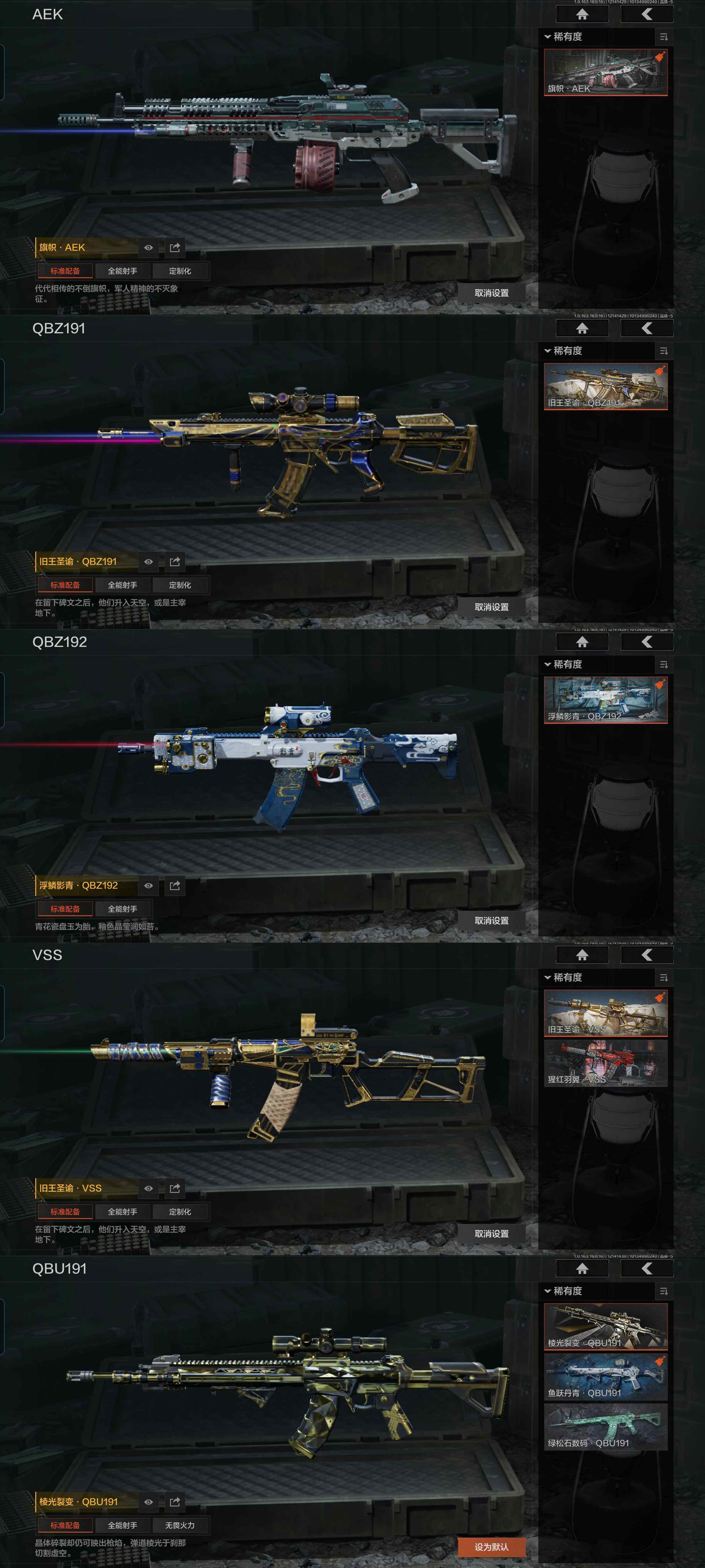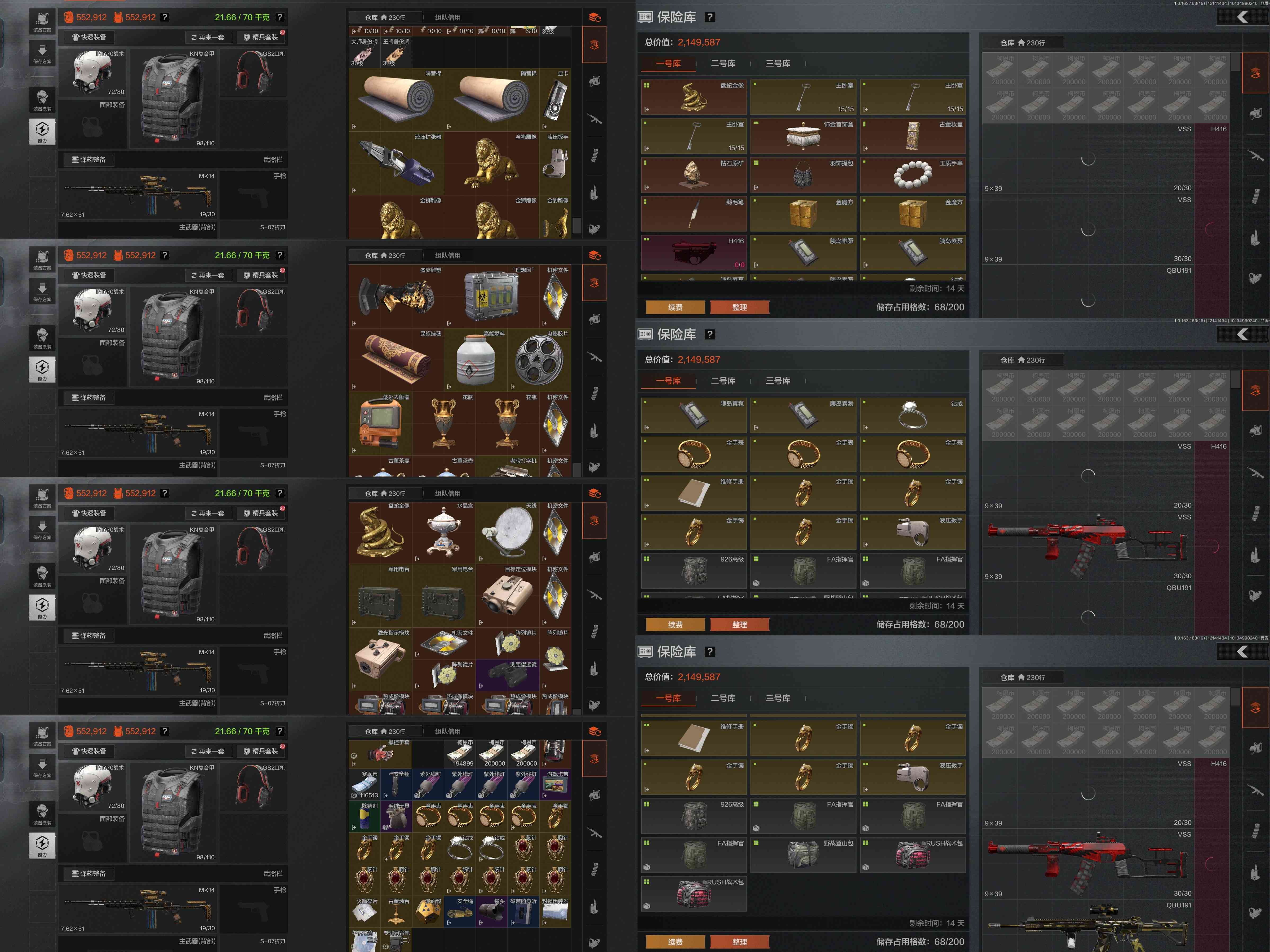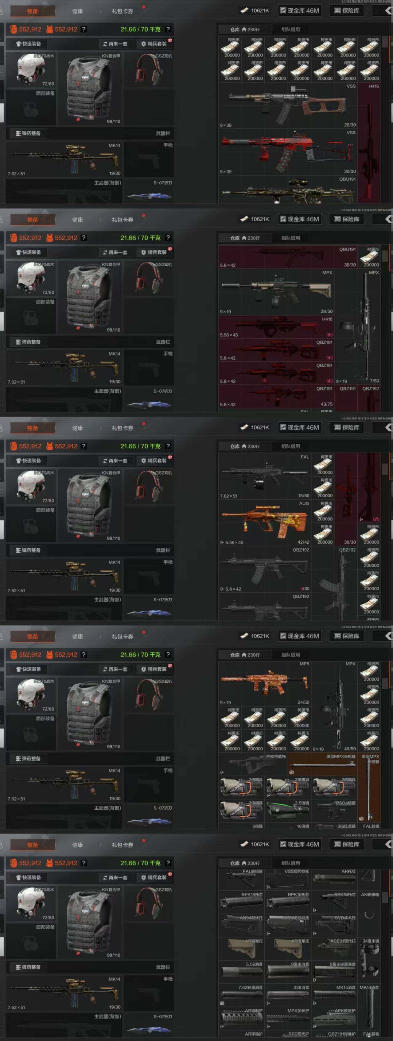 w86,仓库130.3M,科恩币56648K,3把刀S-07折刀,5黄枪,3外观,42紫皮枪,闪光弹MK2手榴弹,旗帜旧王圣谕浮鳞影青棱光裂变,多金小金等,S-07折刀,旗帜AEK,旧王圣谕QBZ191,浮鳞影青QBZ192,旧王圣谕VSS,棱光裂变QBU191