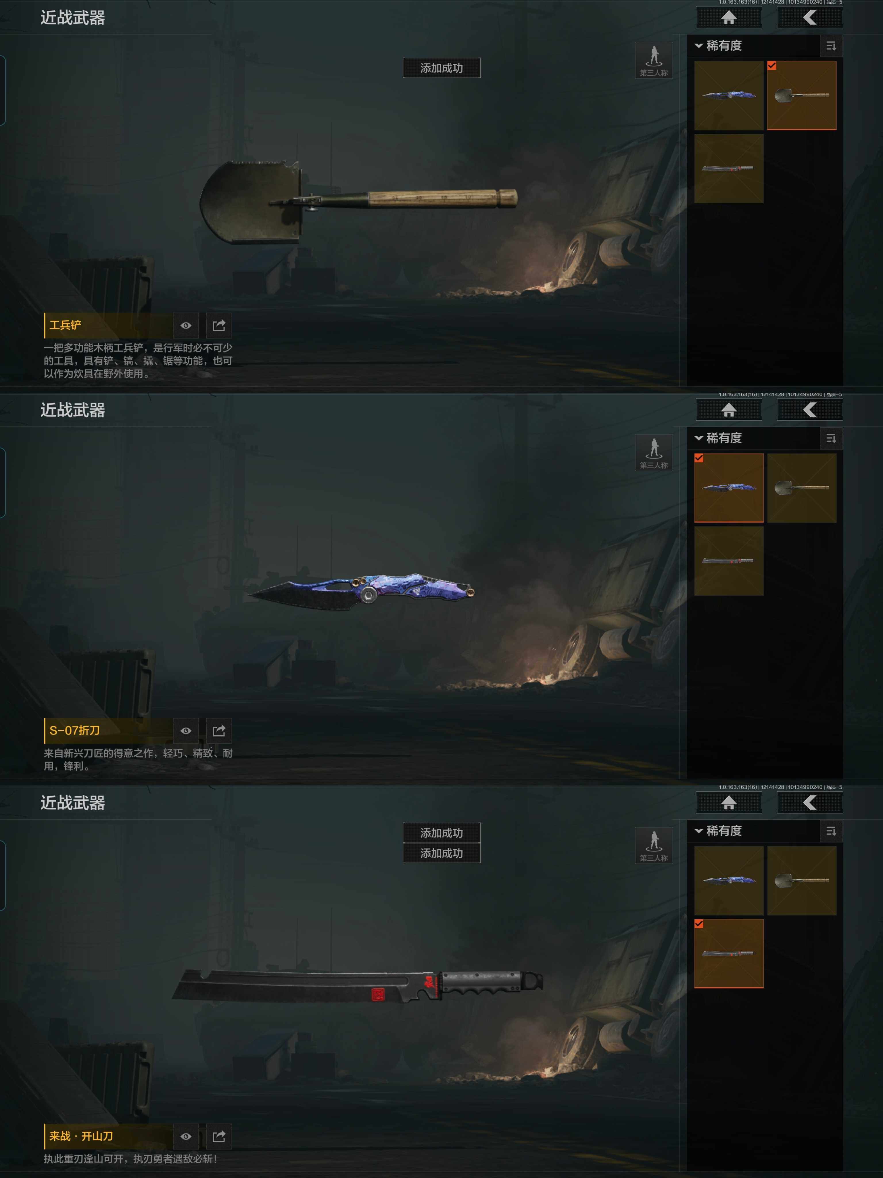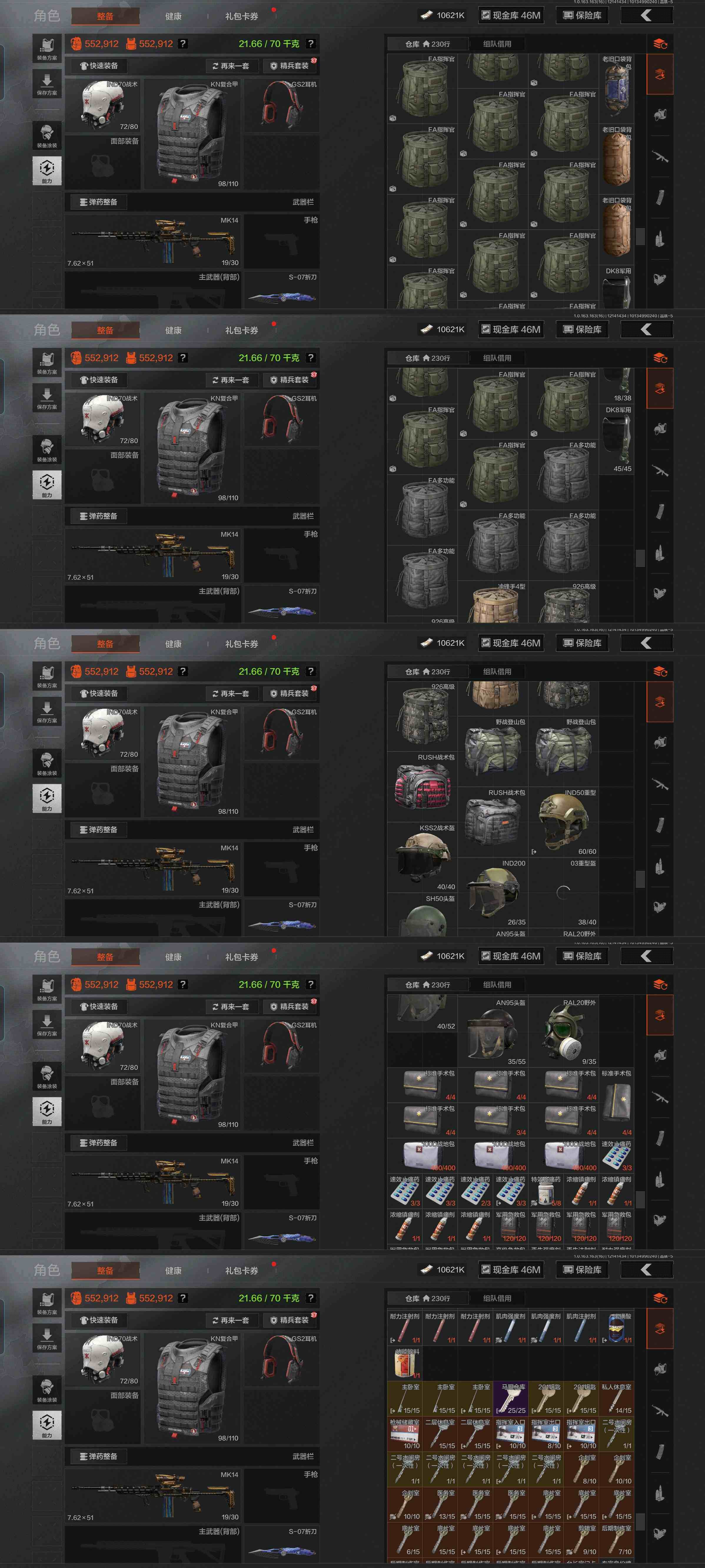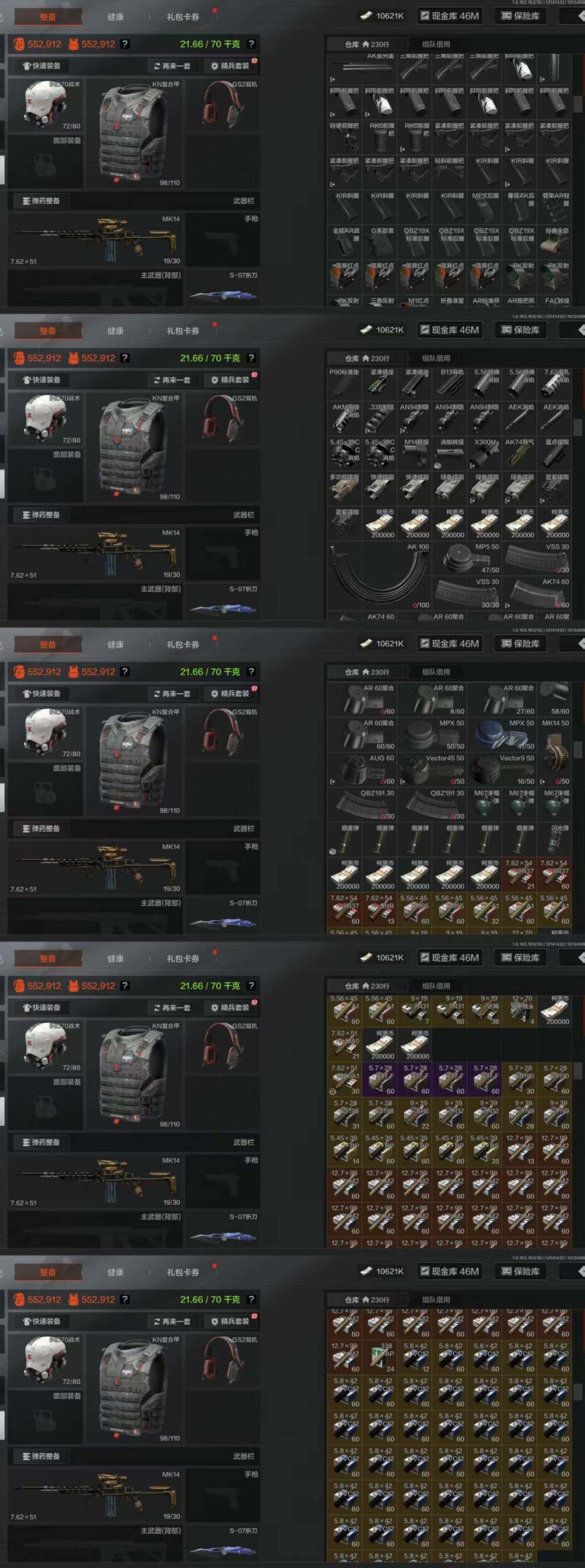 w86,仓库130.3M,科恩币56648K,3把刀S-07折刀,5黄枪,3外