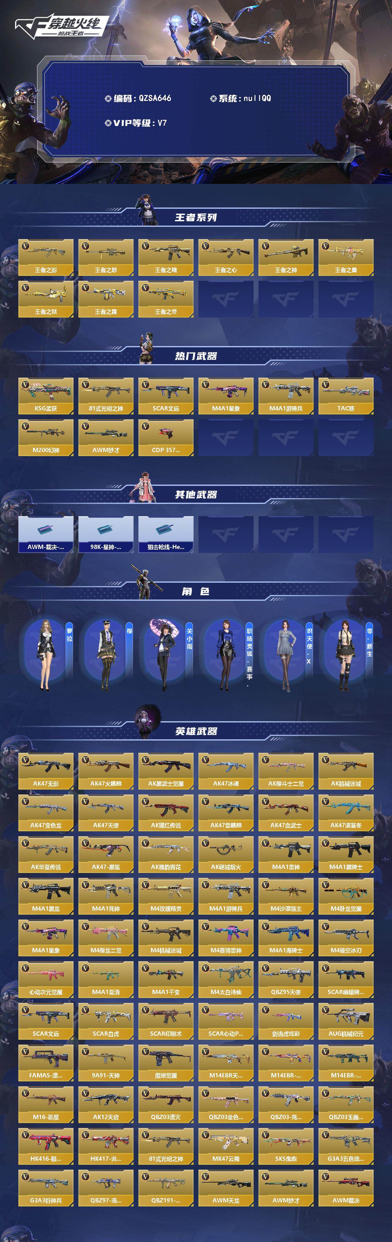 【QZSA646】VIP7/297V/9王者/王者之影/王者之怒/王者之魄/王者之心/王者之神/王者之兽/王者之狱/王者之霆/王者之誉/KSG-孟获/81式-光明之神/SCAR-文远/M4A1-星象/M4A1-游骑兵/TAC-慈/M200-幻神/AWM-妙才/COP 357-堕天神/AWM-裁决-流光之线/98K-星神-漫游之线/狙击枪线-HeartShot/萝拉/樱/关小雨/职场灵狐赛事经理/炽天使-X/零-新生/AK47-无影/AK47-火麒麟/AK47-黑武士觉醒/AK47-冰魂/AK47