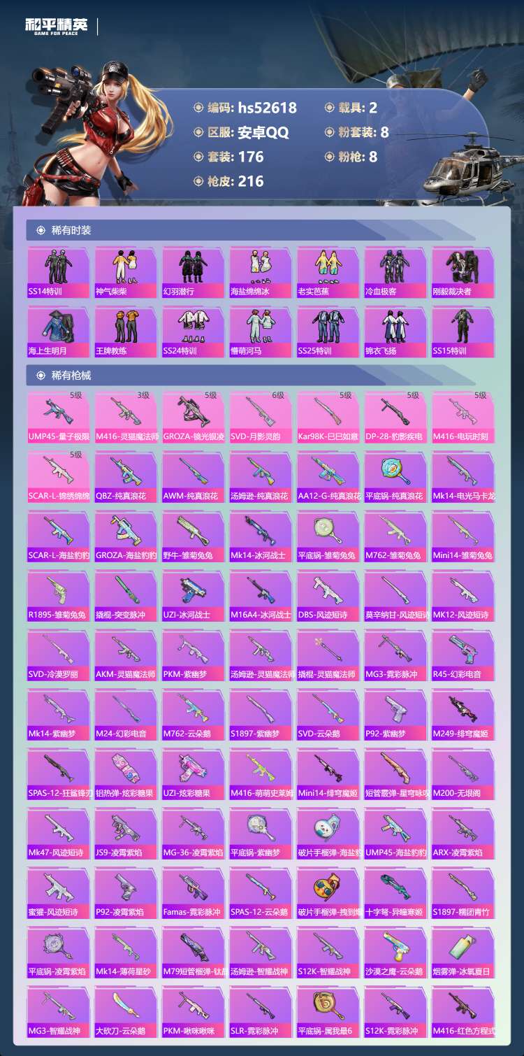 hs52618 安卓手Q-12王牌印记-有战神框-8粉装-8特效枪-2载具-热力值-176