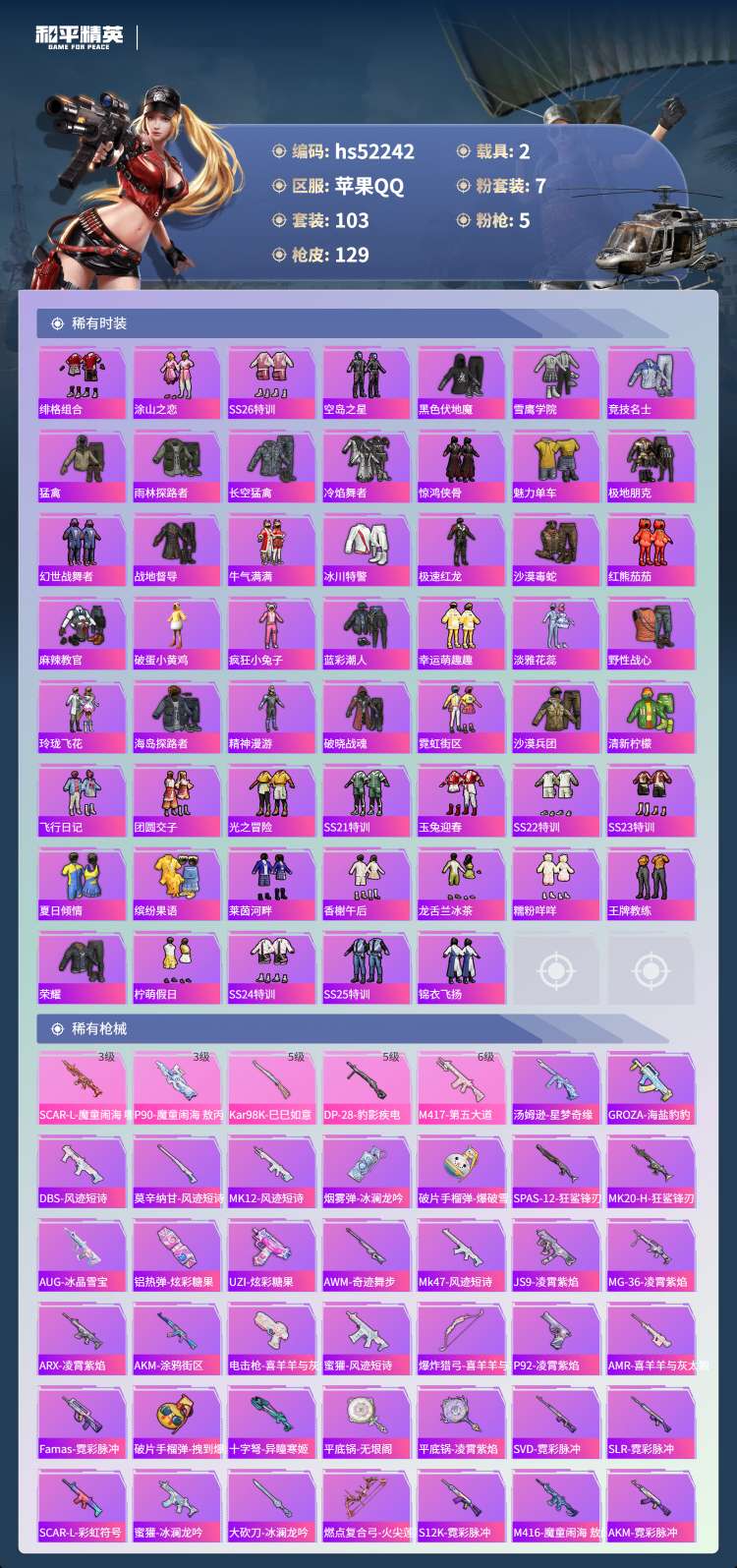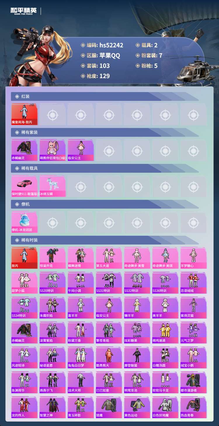 hs52242 苹果手Q-8王牌印记-1红装-7粉装-5特效枪-2载具-热力值-103套装