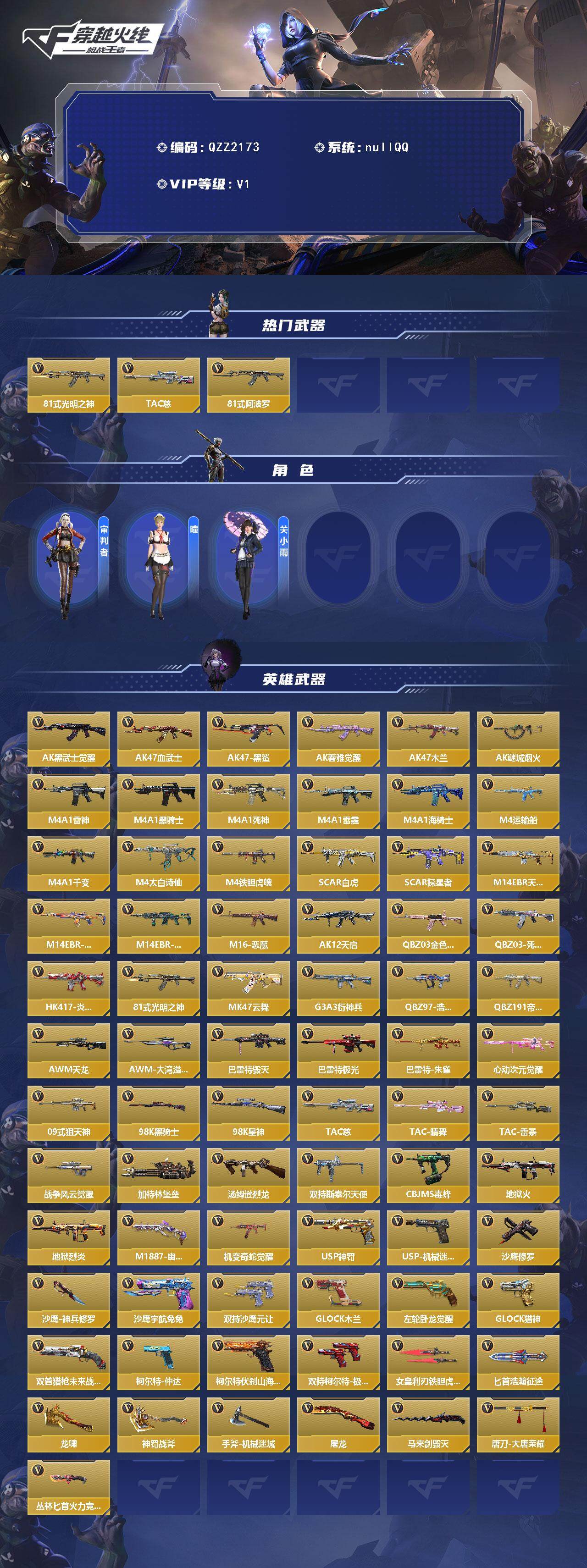 【QZZ2173】VIP1/165V/81式-光明之神/TAC-慈/81式-阿波罗/审判者/瞳/关小雨/AK47-黑武士觉醒/AK47-血武士/AK47-黑鲨/AK47-春雅觉醒/AK47-木兰/AK47-谜城烟火/M4A1-雷神/M4A1-黑骑士/M4A1-死神/M4A1-雷霆/M4A1-海骑士/M4A1-运输船/M4A1-千变/M4A1-太白诗仙/M4A1-铁胆虎魄/SCAR Light-白虎/SCAR-探星者/M14EBR-天神/M14EBR-拂影/M14EBR-玄武/M16-恶魔/AK1