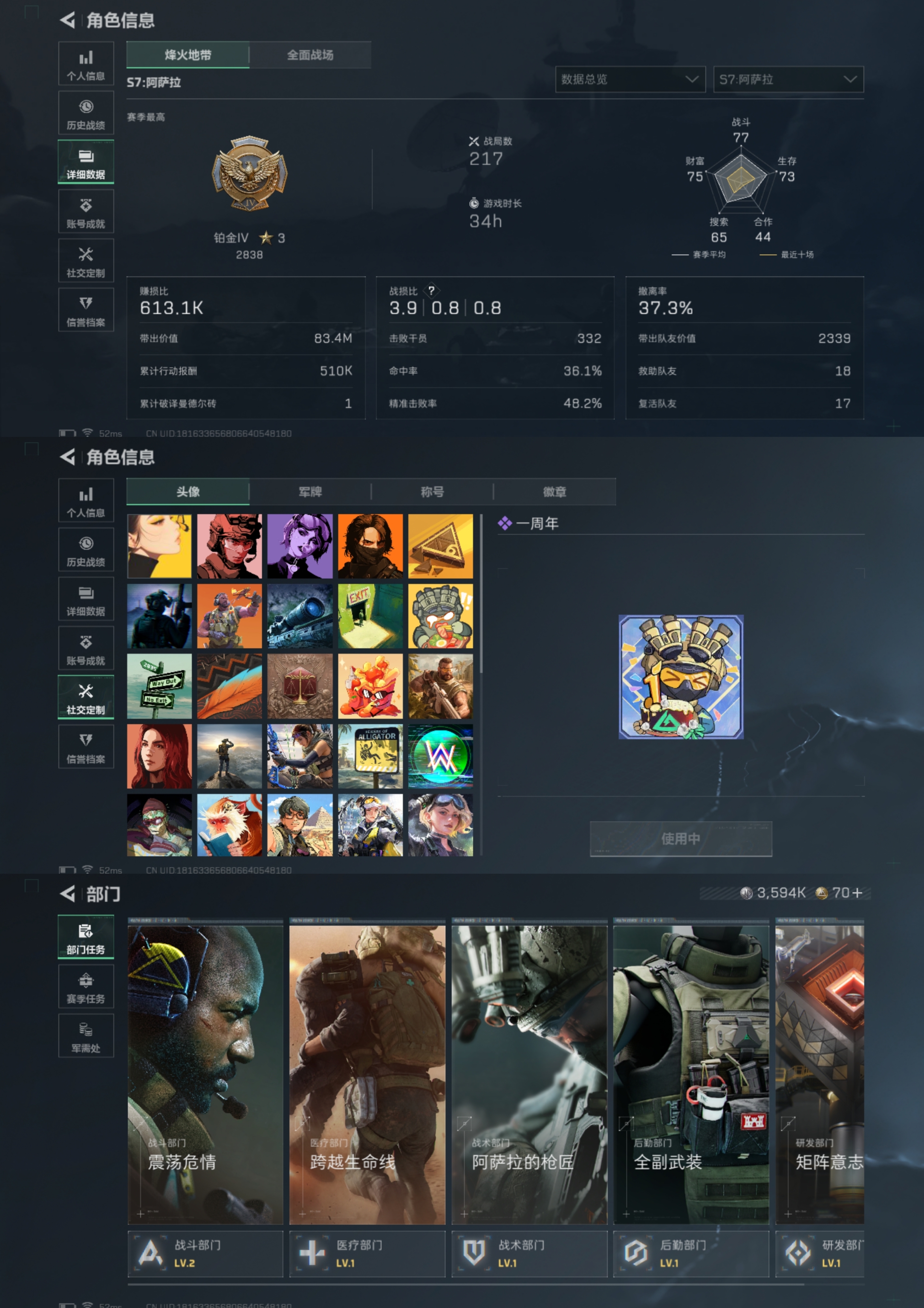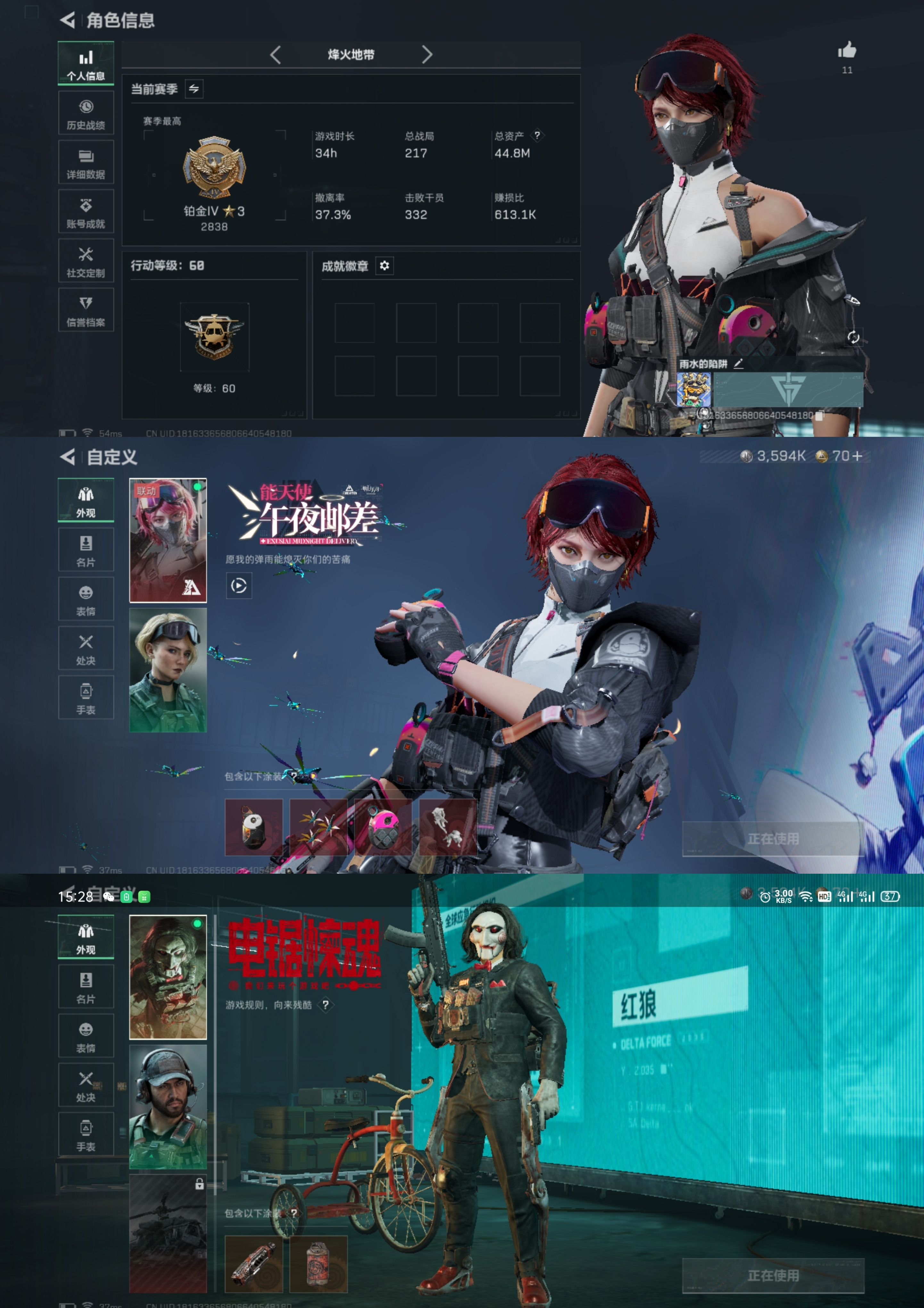 DD418【1红皮1金皮能天使-午夜邮差】总资产44.8M 烽火等级60级 3594K哈夫币【干员皮肤】能天使-午夜邮差 红狼-电锯惊魂 烽火段位-铂金Ⅳ【传说枪皮】CAR15突击步枪-阿米娅 Vector冲锋枪-狩猎时刻 Vector冲锋枪-能天使 KC17突击步枪-电锯惊魂 勇士冲锋枪-能天使 G3战斗步枪-狩猎时刻 M16A4突击步枪-狩猎时刻 SC
