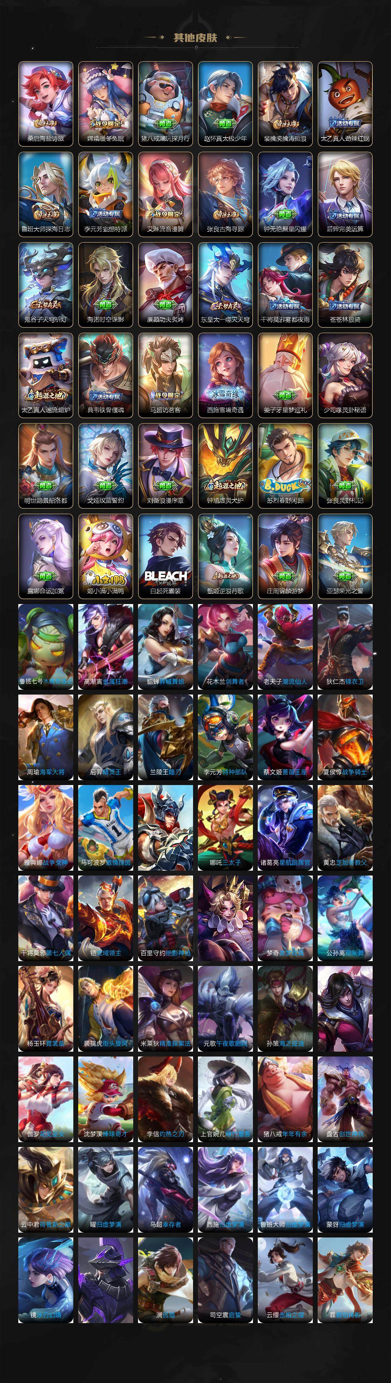 【传说皮肤】:澜愿照九州拓,云缨幻光神枪,桑启鸣野蒿,露娜霜月吟,曜云鹰飞将,伽罗太华,孙尚香末日机甲,宫本武藏地狱之眼,狄仁杰超时空战士