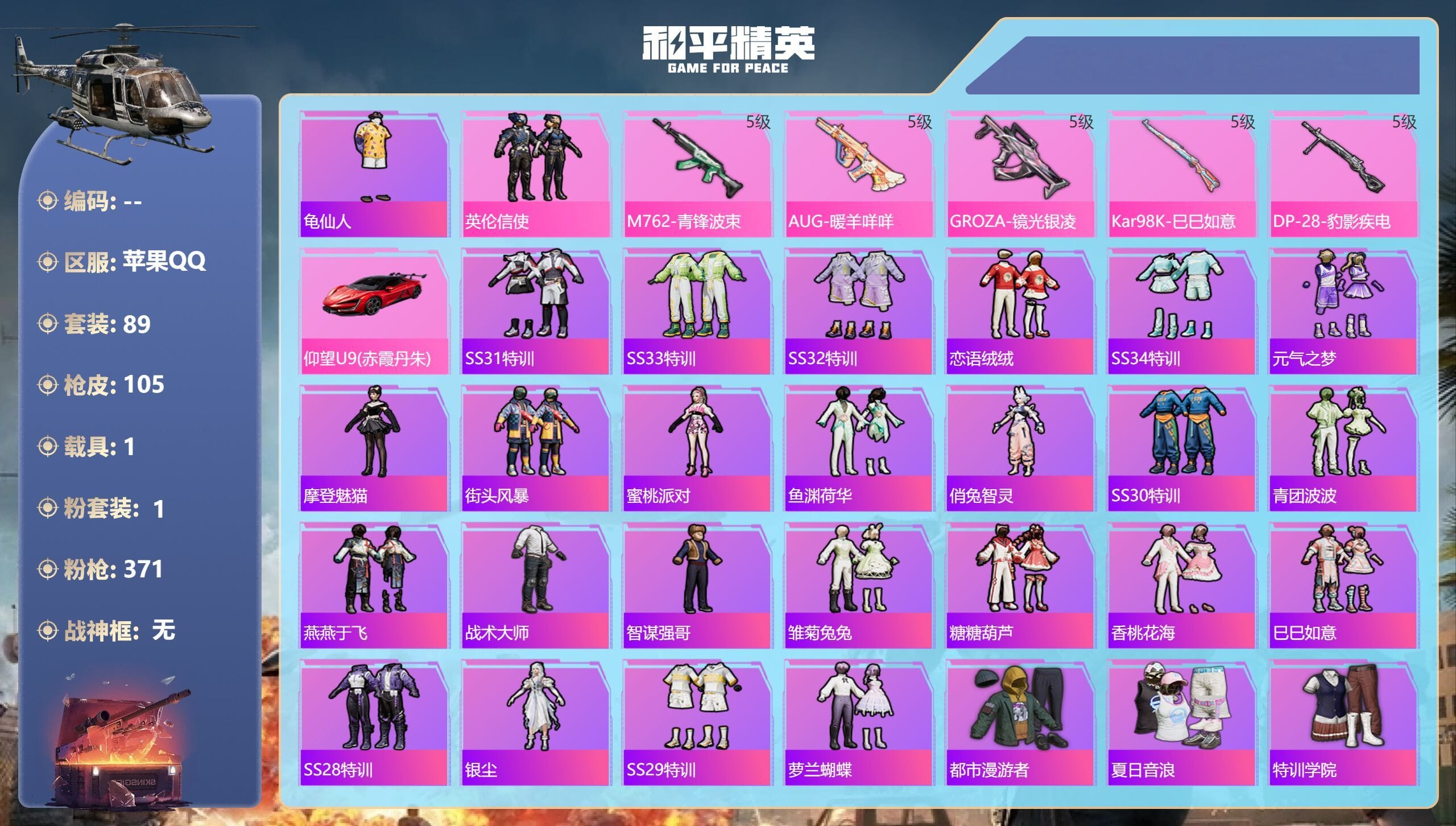 a4063/苹果QQ/-3王牌印记-1粉装-5特效枪-1载具-32182热力值-89套装-105枪皮