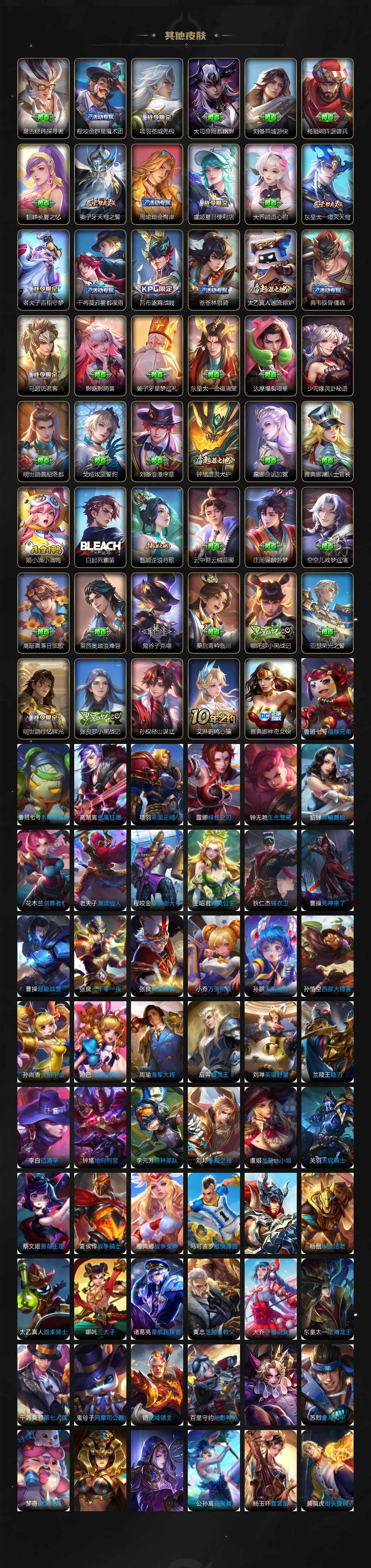 【英雄全皮】:墨子全皮,高渐离全皮,阿轲全皮,扁鹊全皮,吕布全皮,夏侯惇全皮,典韦全皮,狄仁杰全皮,达摩全皮,露娜全皮,姜子牙全皮,刘邦全皮,孙权全皮,花木兰全皮,娜可露露全皮,橘右京全皮,刘备全皮,李元芳全皮,钟馗全皮,苍全皮,哪吒全皮,雅典娜全皮,太乙真人全皮,东皇太一全皮,鬼谷子全皮,黄忠全皮,百里玄策全皮,梦奇全皮,明世隐全皮,狂铁全皮,