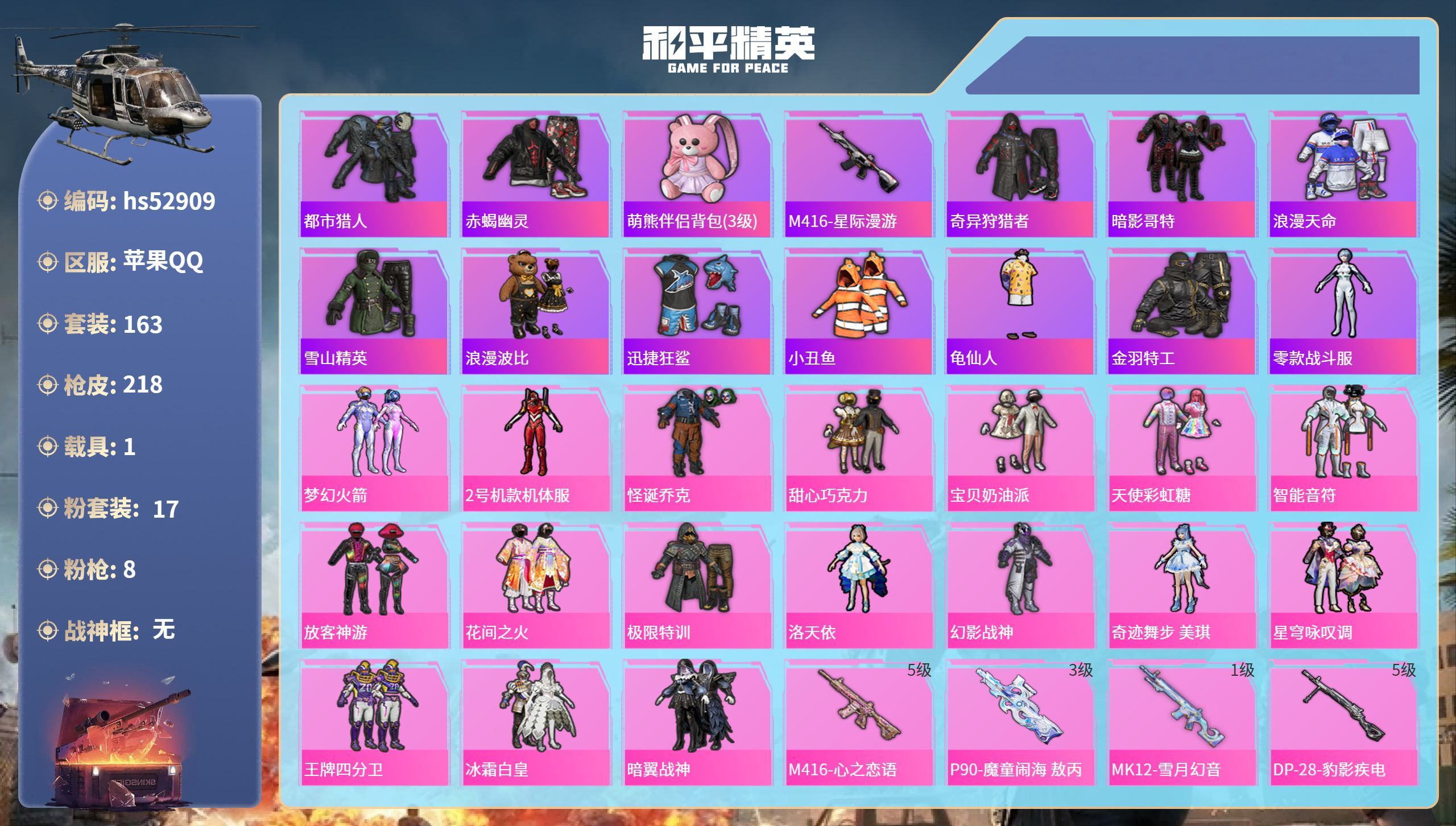 hs52909 苹果手Q-6王牌印记-17粉装-8特效枪-1载具-74474热力值-163套装-21