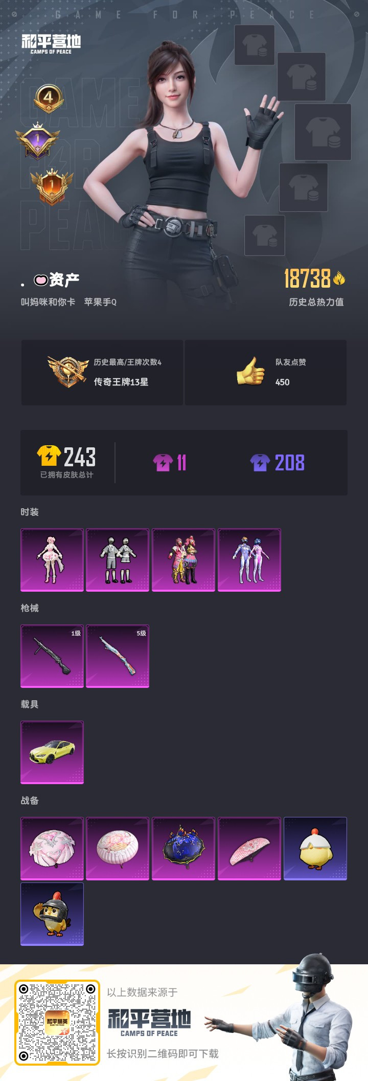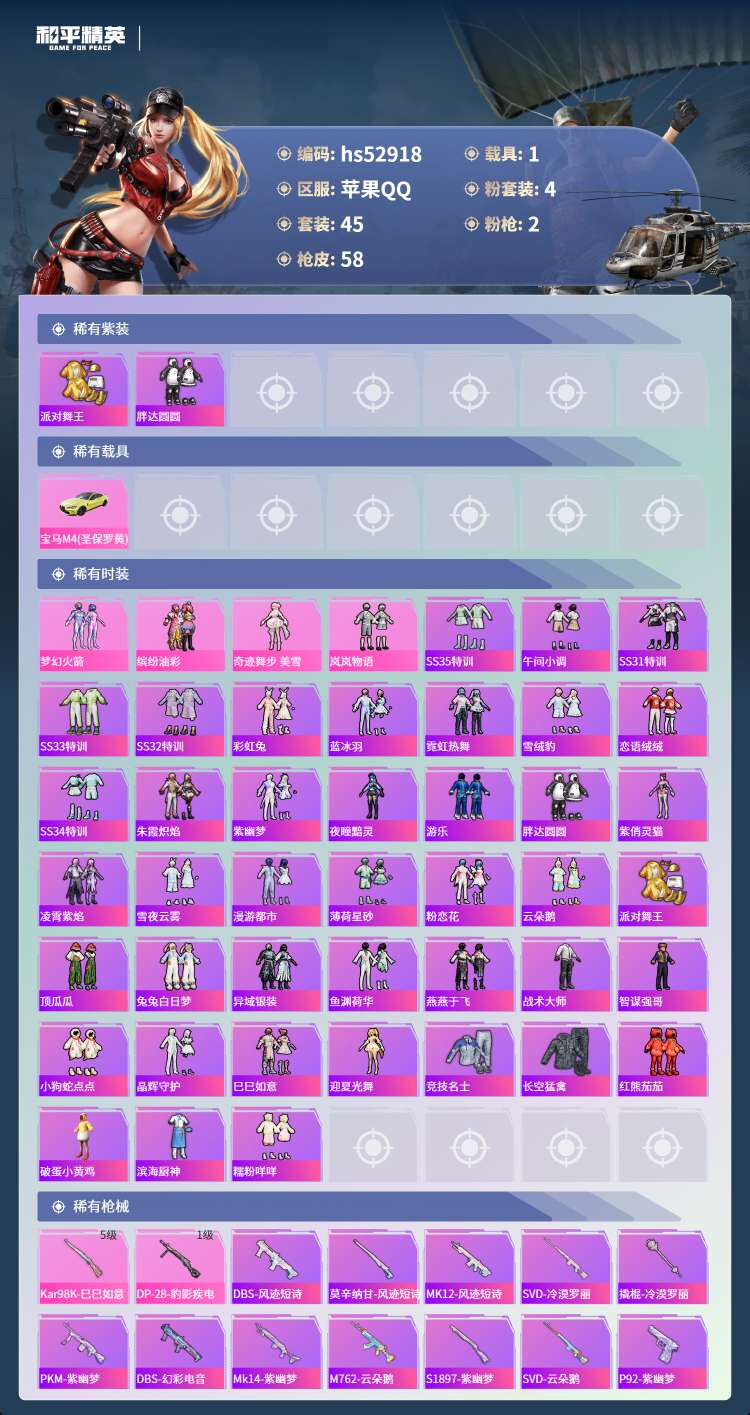 hs52918 苹果手Q-4王牌印记-4粉装-2特效枪-1载具-18738热力值-45套装-58枪皮