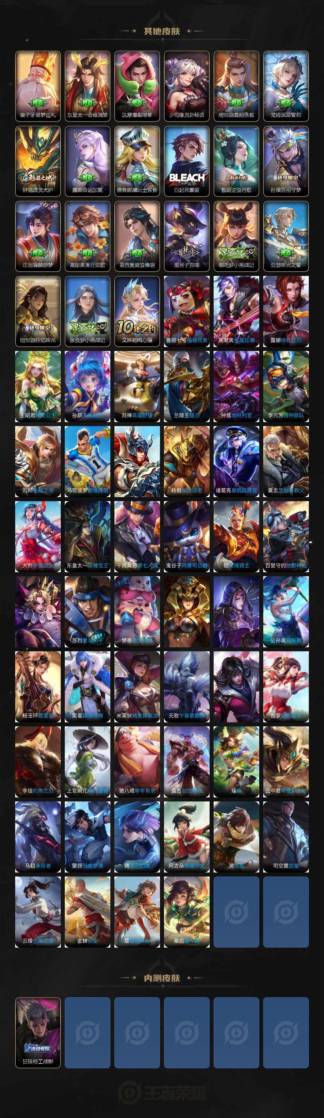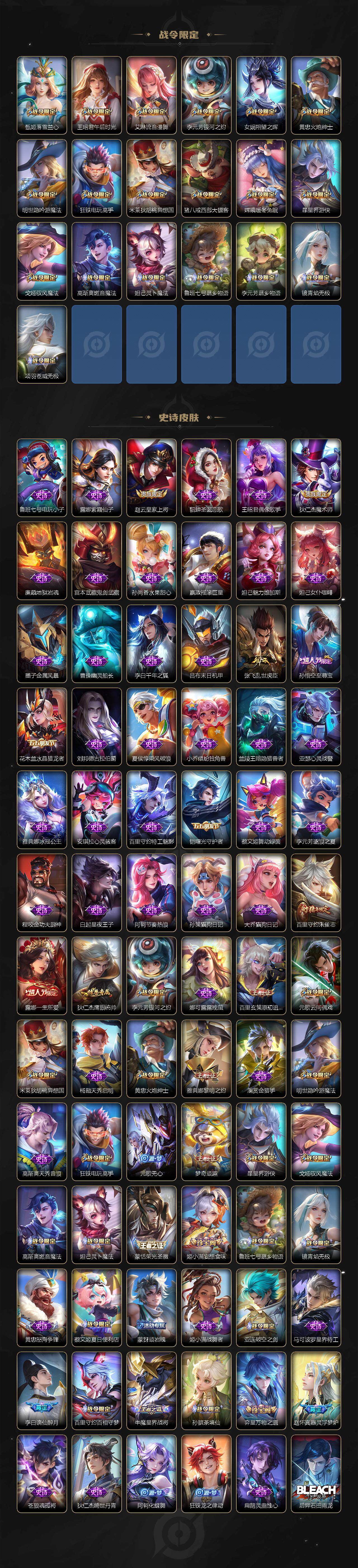 【限定皮肤】:蒙犽顽岩魄,蔡文姬夏日便利店,虞姬夏日便利店,姜子牙天穹之誓,李白谪仙醉月,狄仁杰阴阳师,赵云皇家上将,鲁班七号寅虎瑞焰,白起夜都怪侠,芈月幻夜卜梦,周瑜赤莲之焰,元歌云间偶戏,元歌无心,甄姬落雪兰心,狄仁杰魔
