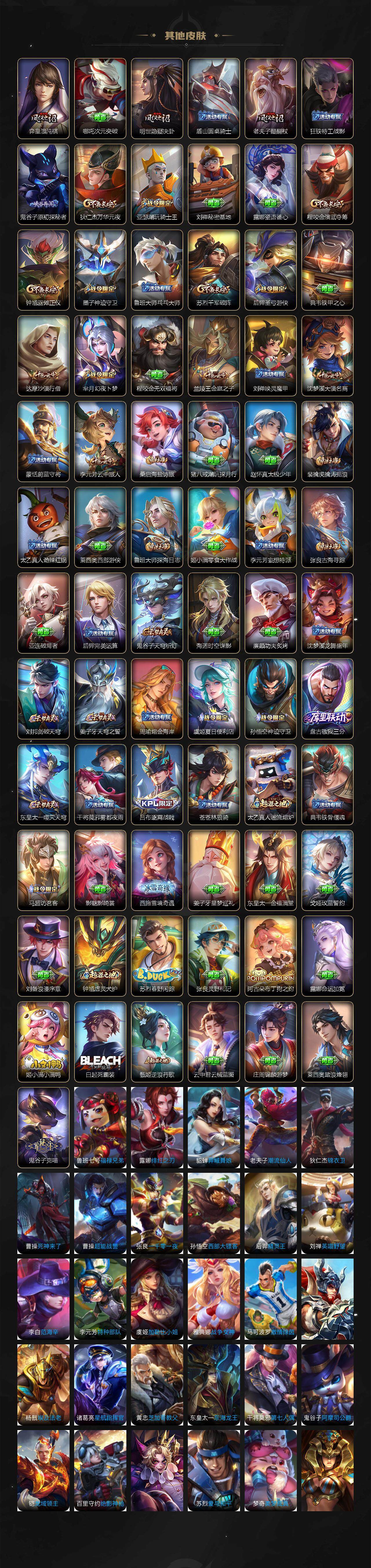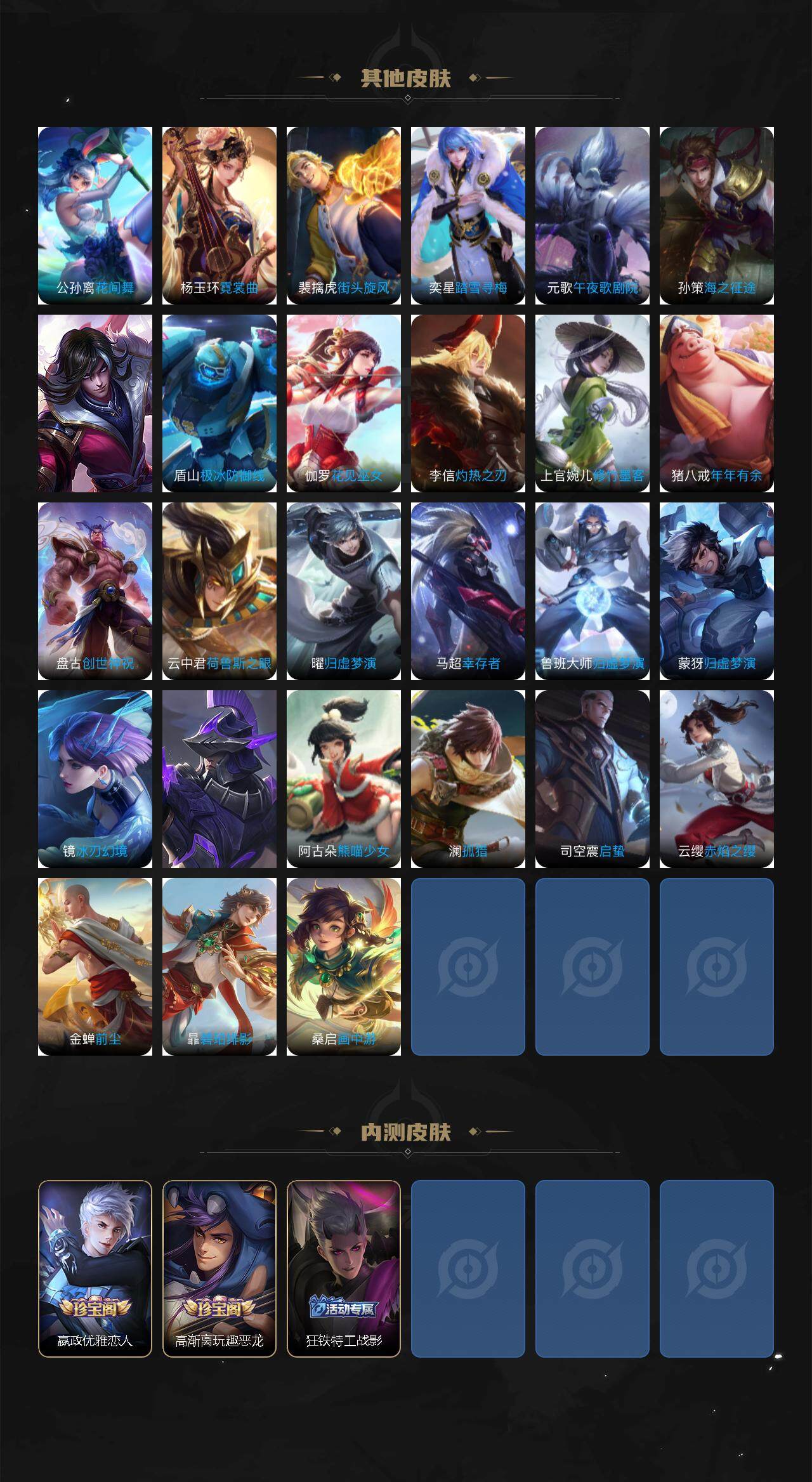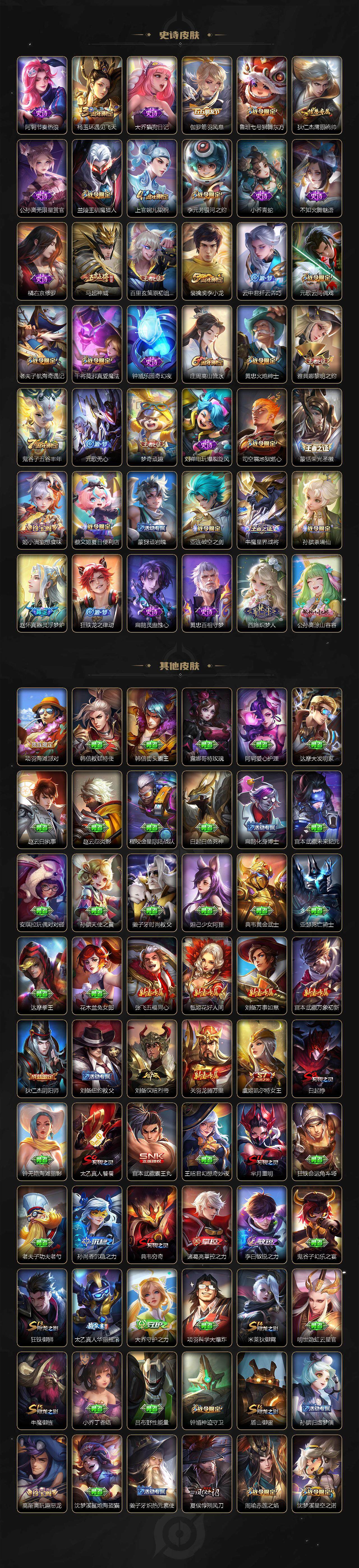 【传说皮肤】:桑启鸣野蒿,马超无双飞将,孙策末日机甲,赵云淬星耀世,曜李逍遥 ,铠绛天战甲,镜炽阳神光,张良黄金白羊座,后羿黄金射手座,宫本武藏地狱之眼,狄仁杰超时空战士