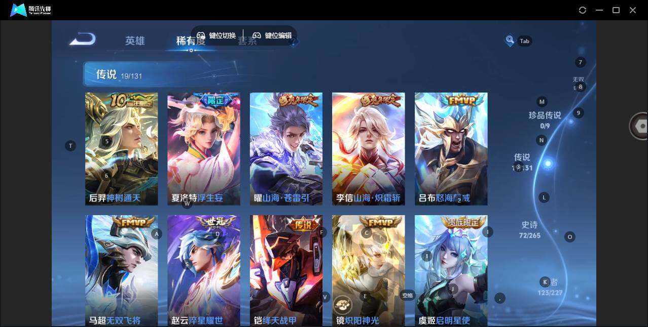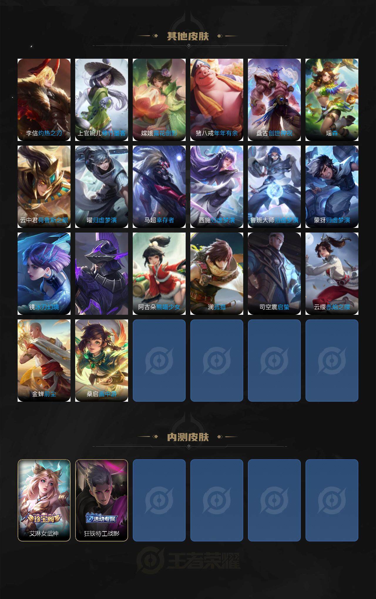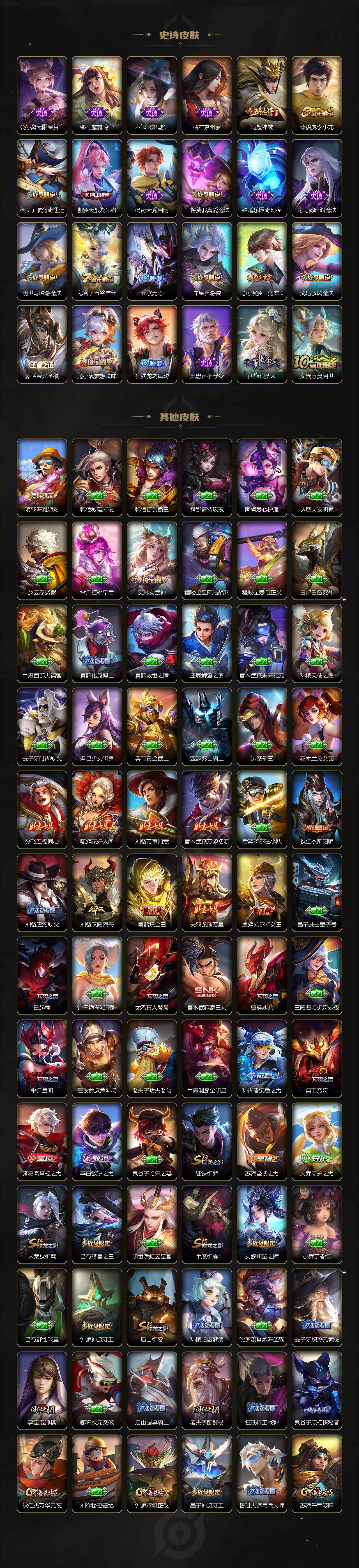 【传说皮肤】:后羿神树通天,夏洛特浮生妄,曜山海苍雷引,李信山海炽霜斩,吕布怒海麟威,马超无双飞将,赵云淬星耀世,铠绛天战甲,镜炽阳神光,虞姬启明星使,曜云鹰飞将,干将莫邪久胜战神,诸葛亮武陵仙君,貂蝉仲夏夜之梦,李白凤求凰,孙尚香末日机甲,宫本武藏地狱之眼,孙悟空地狱火,
