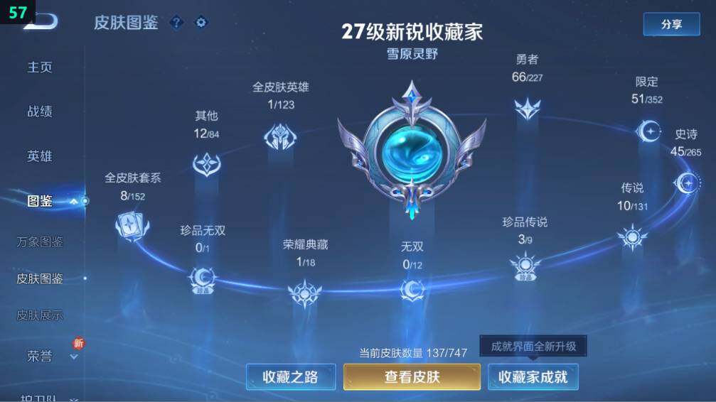 安卓WX-V7-最强王者段位-124英雄-137皮肤-1典藏皮肤-3珍品传说-10传说-45史诗