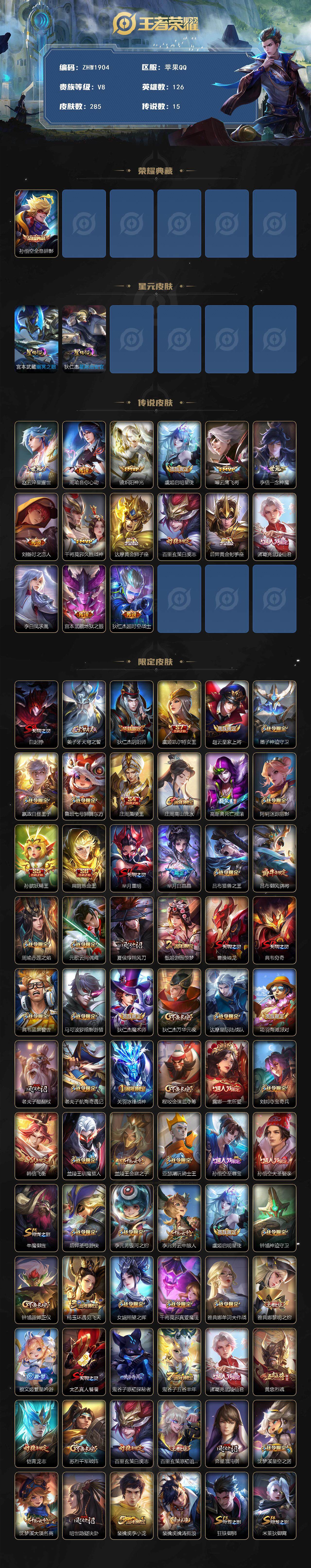 苹果QQ-1典藏-15传说-285皮肤-126英雄-非凡王者-