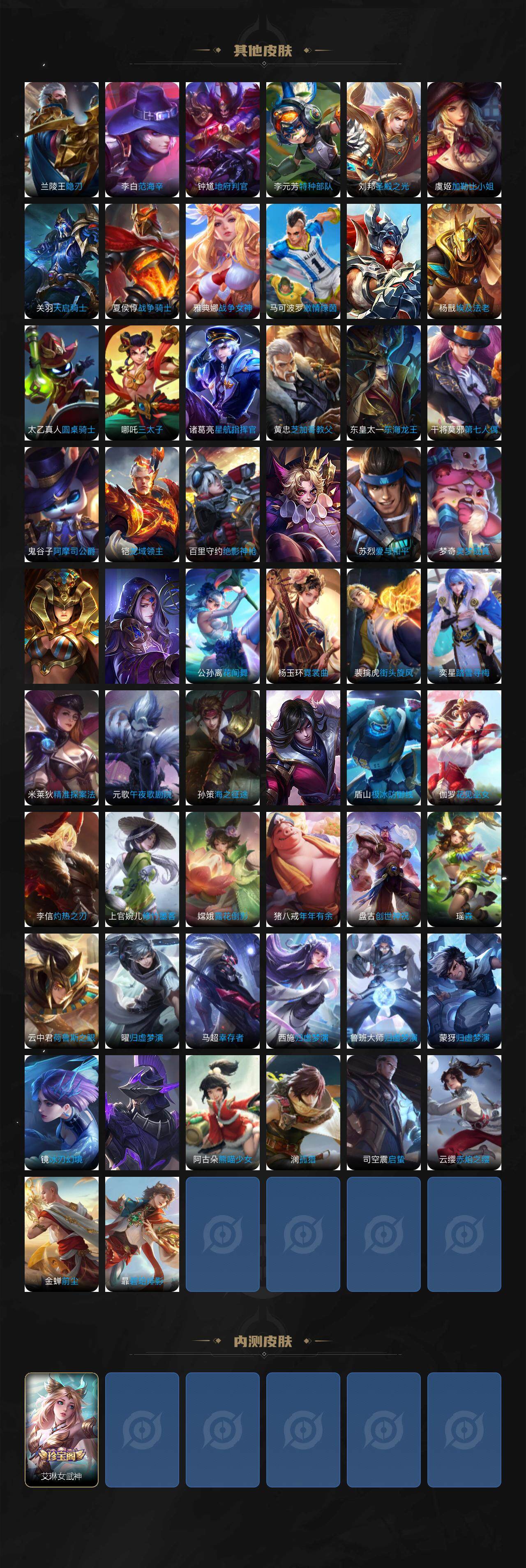 【传说皮肤】:赵云淬星耀世,周瑜音你心动,镜炽阳神光,虞姬启明星使,曜云鹰飞将,李信一念神魔,刘备时之恋人,干将莫邪久胜战神,达摩黄金狮子座,百里玄策白虎志,后羿黄金射手座,诸葛亮武陵仙君,李白凤求凰,宫本武藏地狱之眼,狄仁杰超时空战士