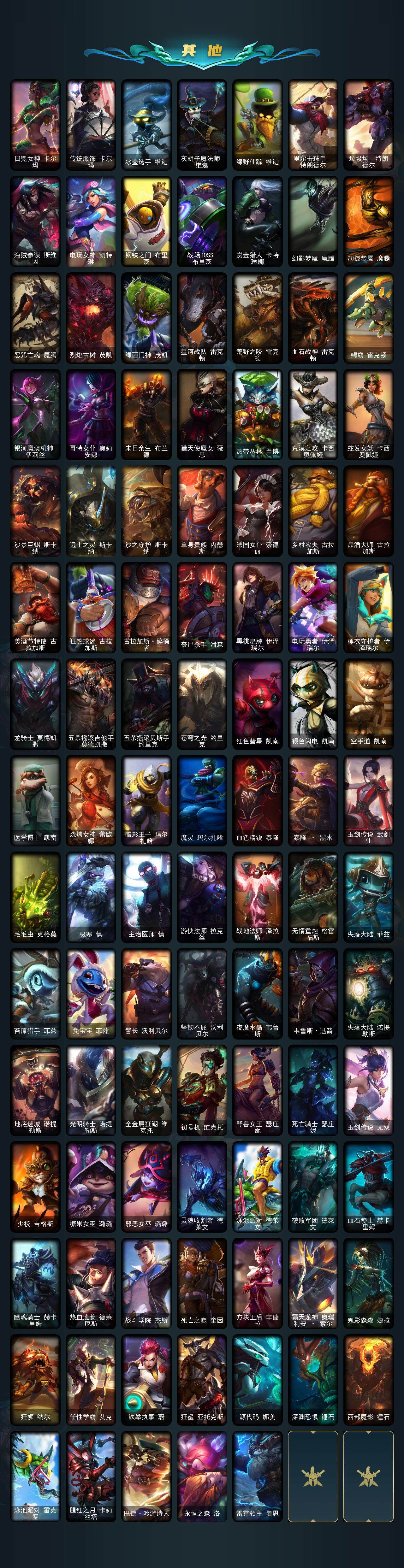 【冰雪限定】:幸福女神乐芙兰,冰雪风暴希维尔,圣诞开心鬼提莫,圣诞精灵崔丝塔娜,圣诞狂欢基兰,阿木木“主人不要我了”,平安夜女神娑娜,喜庆之树茂凯,圣诞玩偶波比,圣诞老人古拉加斯,圣诞驯鹿克格莫,冰雪节辛吉