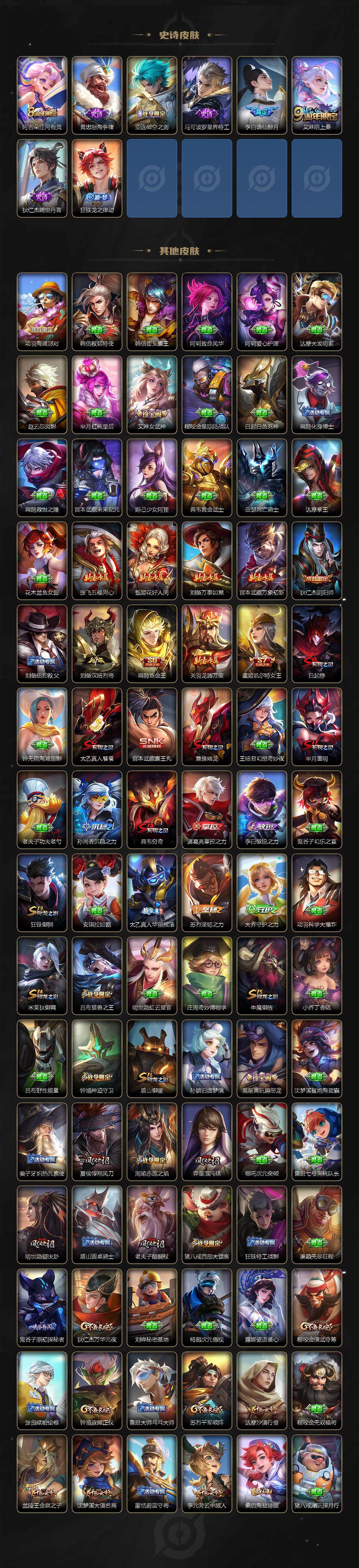 【限定皮肤】:白起狰,姜子牙天穹之誓,杨戬破阵退雄兵,李白谪仙醉月,狄仁杰阴阳师,虞姬凯尔特女王,赵云皇家上将,嬴政白昼王子,鲁班七号狮舞东方,庄周高山流水,高渐离玩趣恶龙,扁鹊炼金王,芈月重