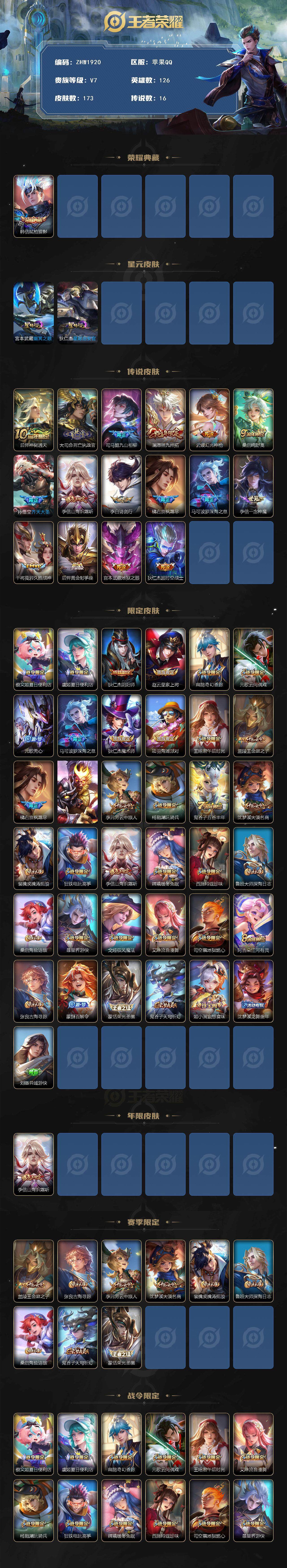 苹果QQ-1典藏-16传说-173皮肤-126英雄-永恒钻石-