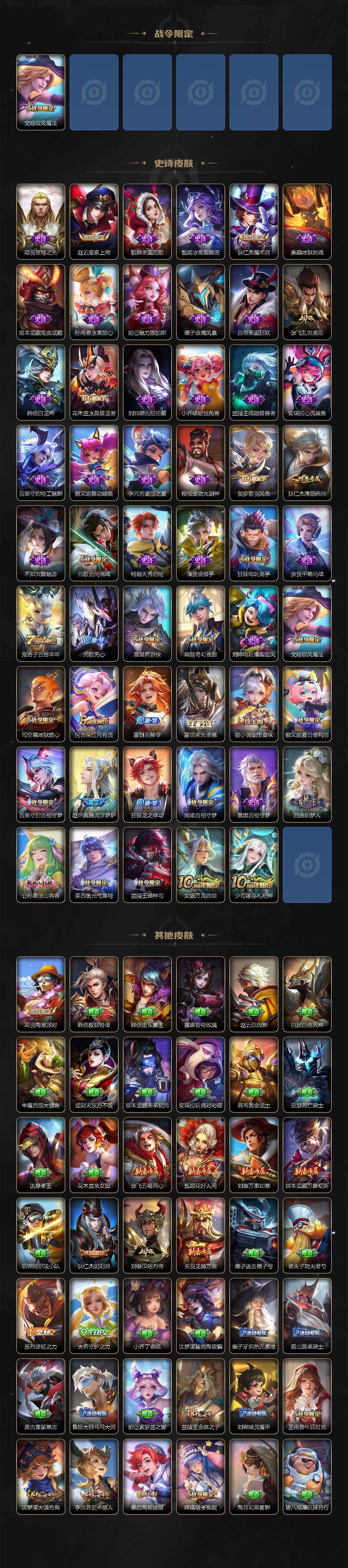 【传说皮肤】:后羿神树通天,大司命死亡执政官,司马懿九山相柳,澜愿照九州拓,云缨幻光神枪,桑启鸣野蒿,孙悟空齐天大圣,李信山海炽霜斩,李白诗剑行,橘右京枫霜尽,马可波罗深海之息,李信一念神魔,干将莫邪久胜战神,后羿黄金射手座,宫本武藏地狱之眼,狄仁杰超时空战士