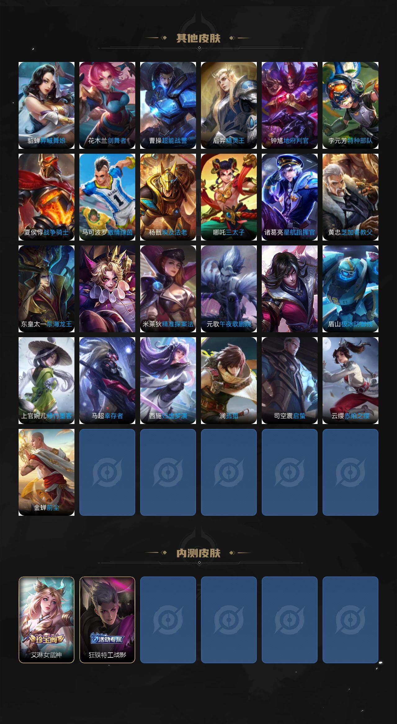 【限定皮肤】:姜子牙天穹之誓,狄仁杰阴阳师,赵云皇家上将,高渐离死亡摇滚,夏侯惇朔风刀,典韦岱宗,狄仁杰魔术师,狄仁杰万华元夜,项羽海滩派对,老夫子醍醐杖,程咬金演武夺筹,韩信逐梦之影,韩信飞衡,孙悟空至尊宝,李元芳银河之约,钟馗驱傩正仪,鬼谷子原初探秘者,弈星混沌棋,沈梦溪星空之诺,明