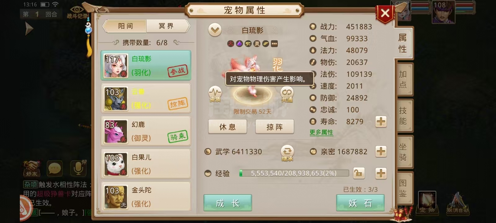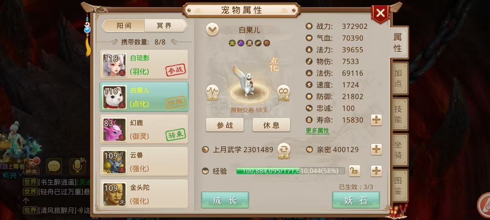 白流影强8/点化,羽化完成,飞升完成共生鬼将。宠物8个,鬼将一个输出能力突出.10万加输出白流影,