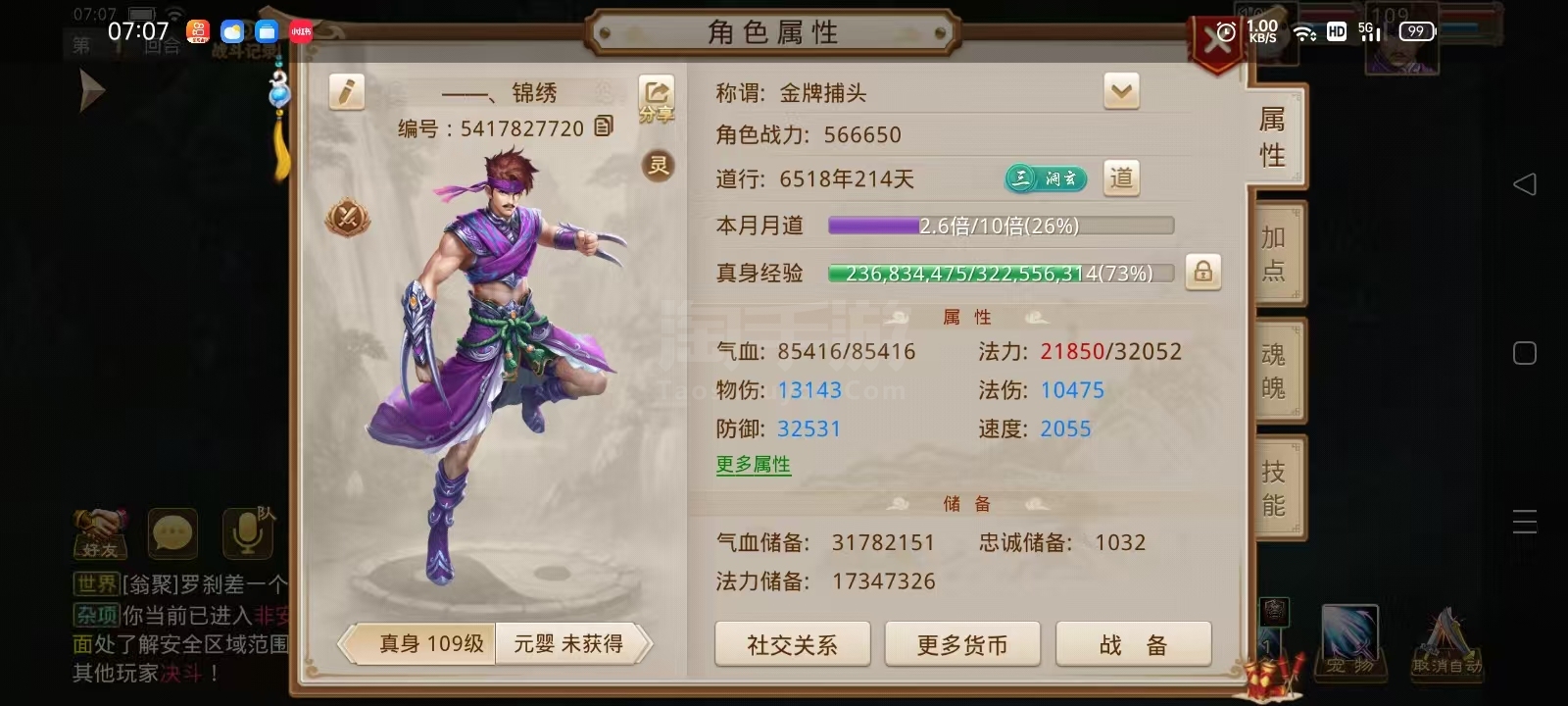 极品账号出售 宠物成长850,输出能力强,角色属性为,体木,气血72000,法力26000防御32000排行榜29