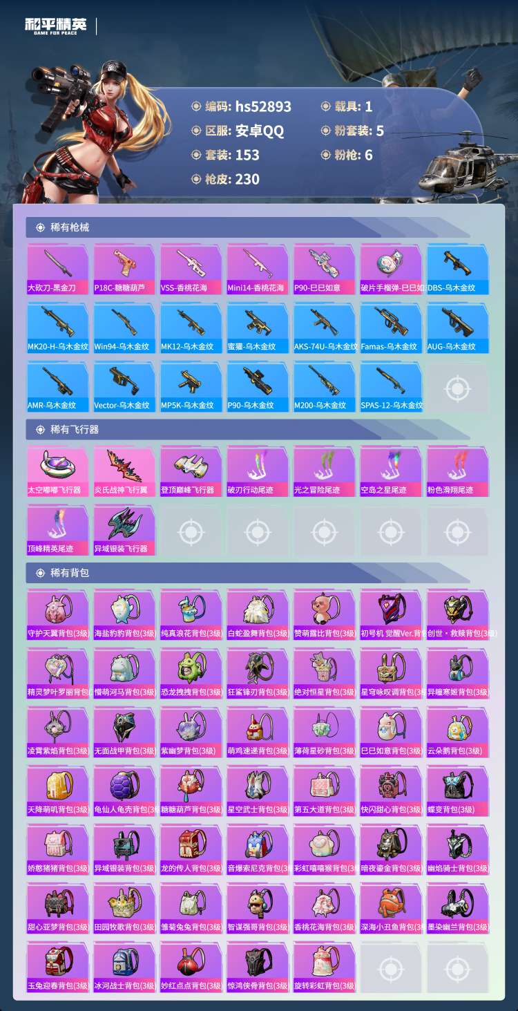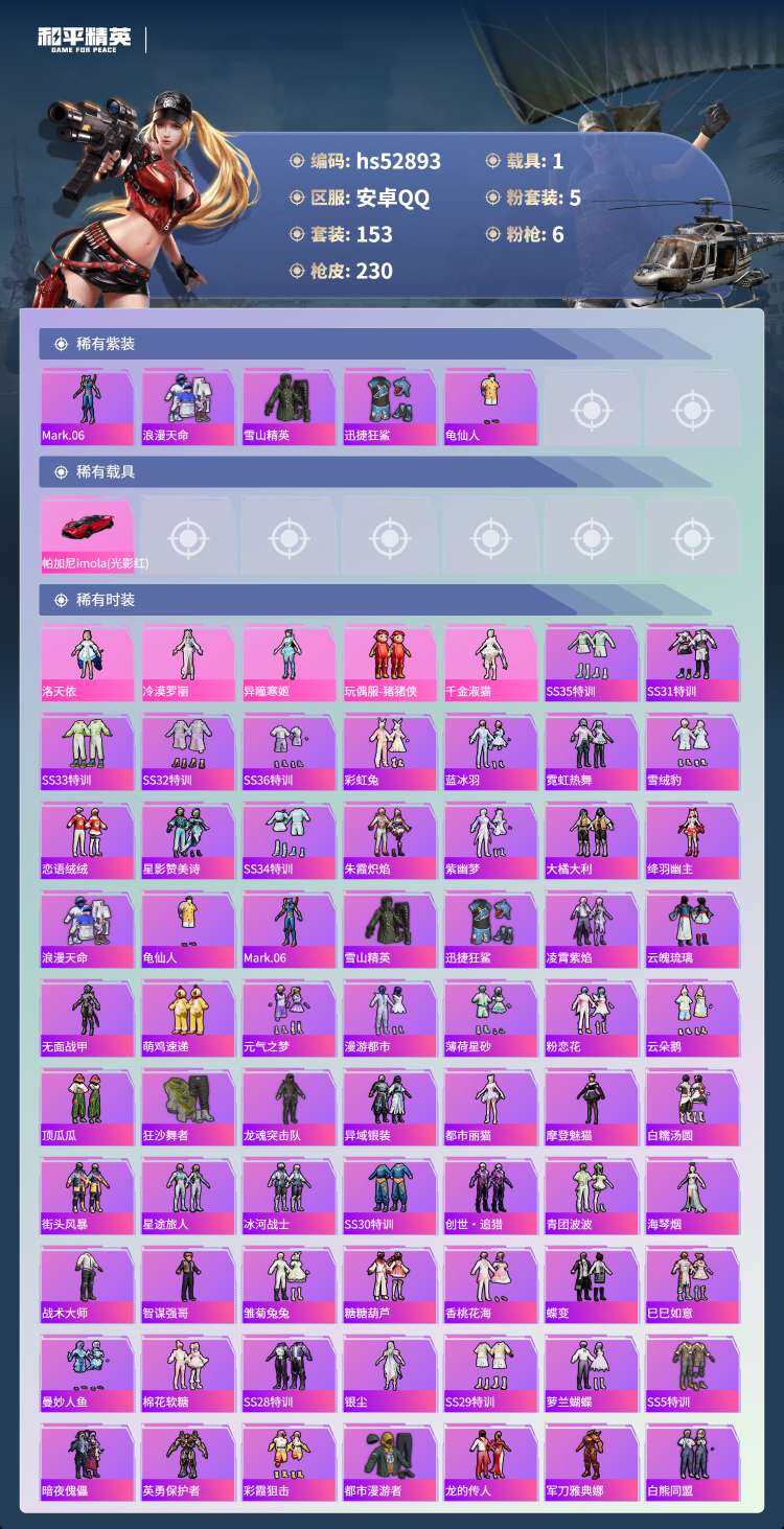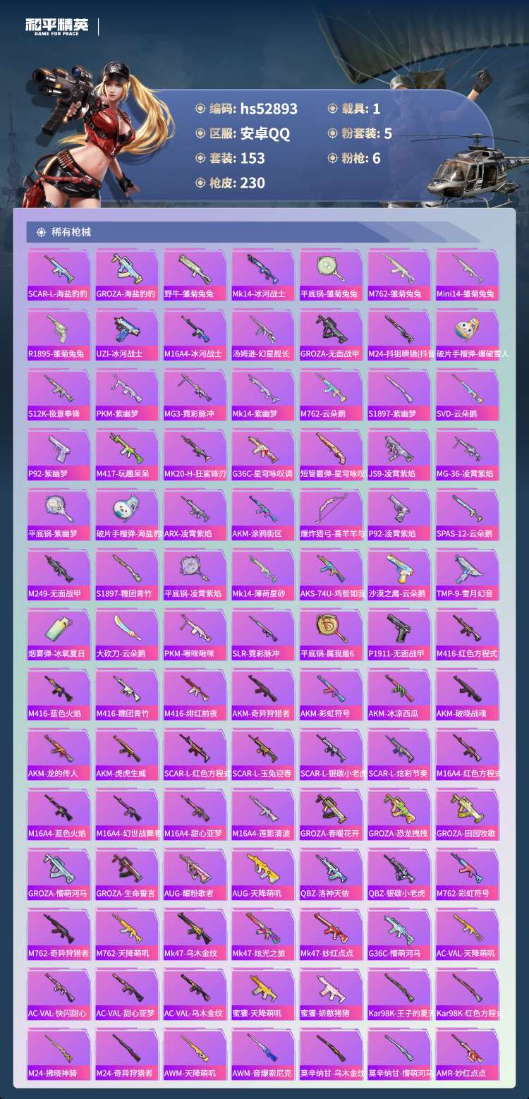 hs52893 安卓手Q-15王牌印记-5粉装-6特效枪-1载具-68326热力值-153套装-23
