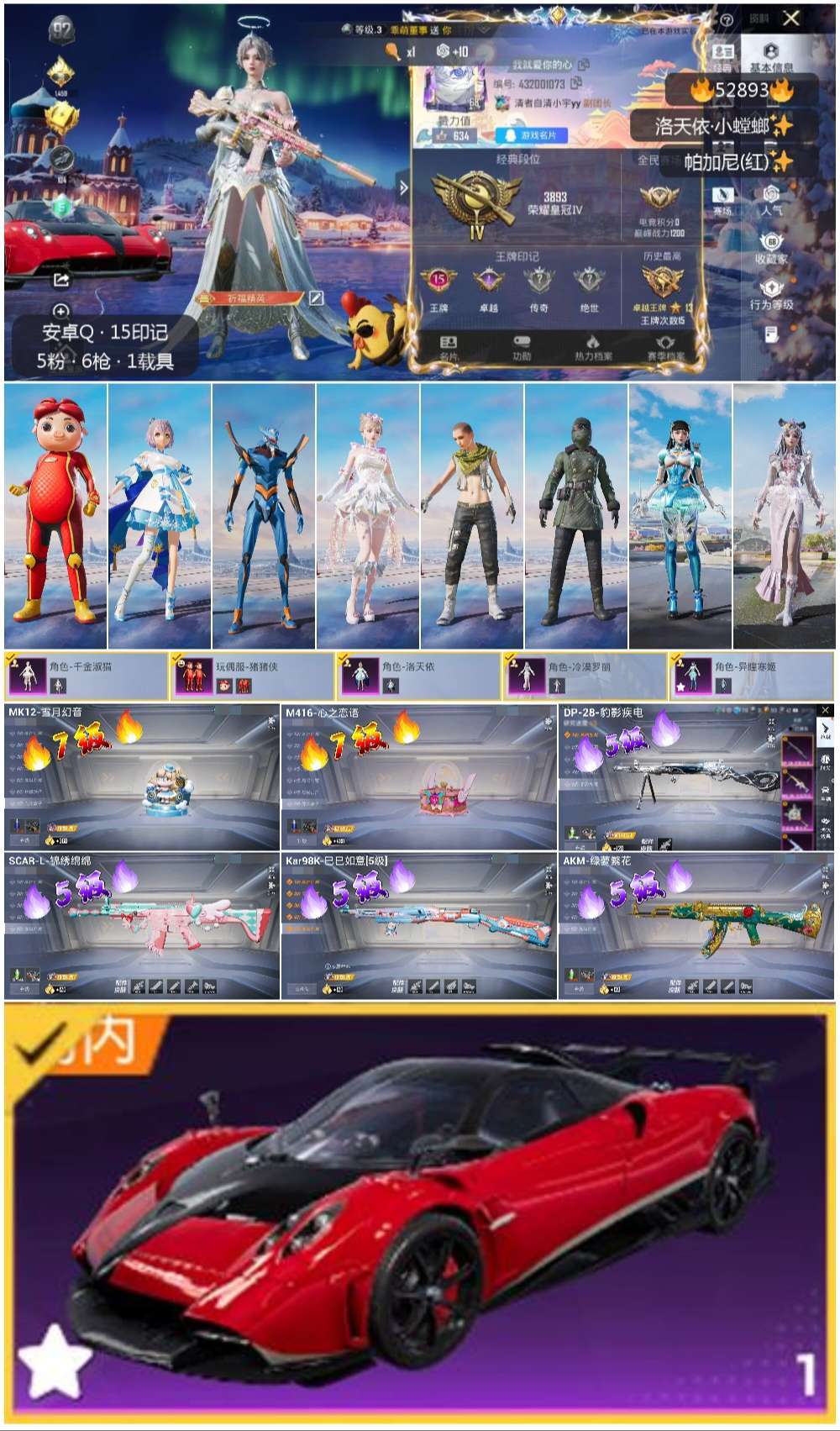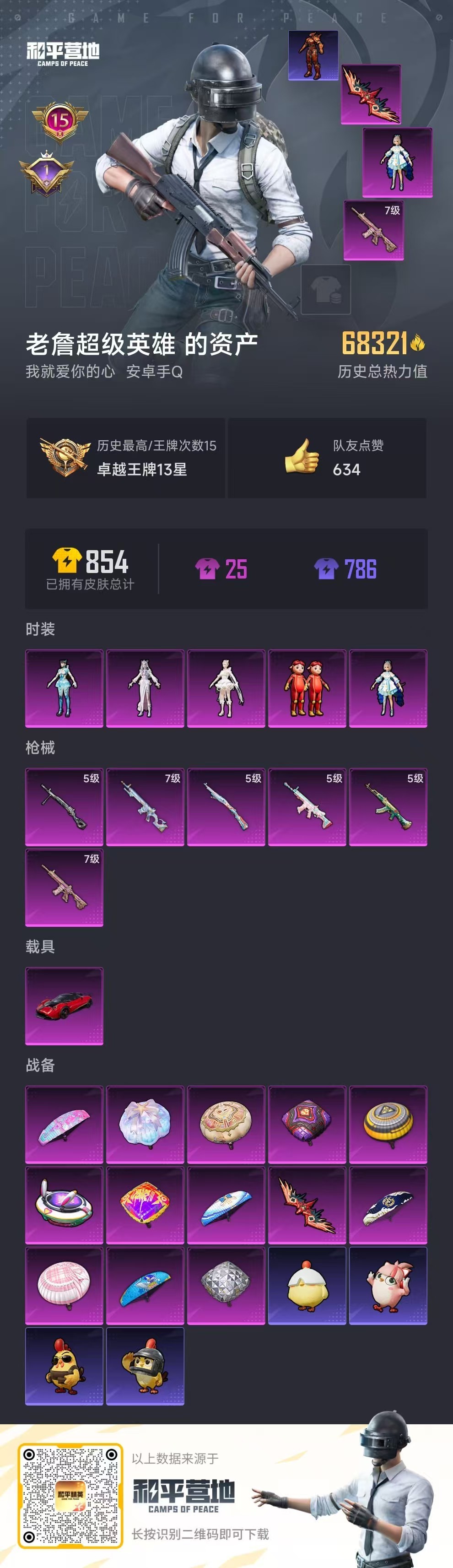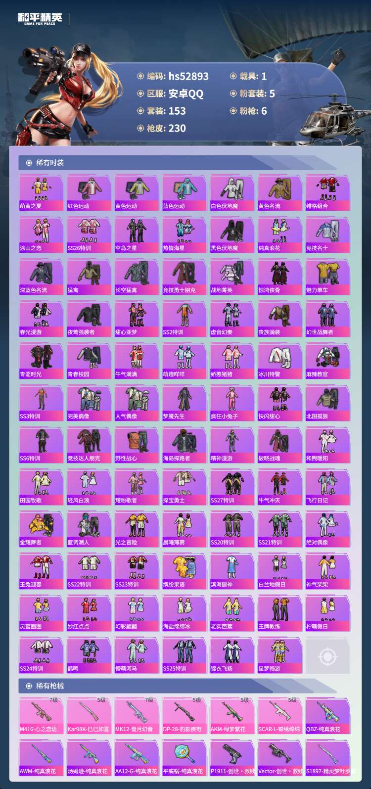 hs52893 安卓手Q-15王牌印记-5粉装-6特效枪-1载具-68326热力值-153套装-23