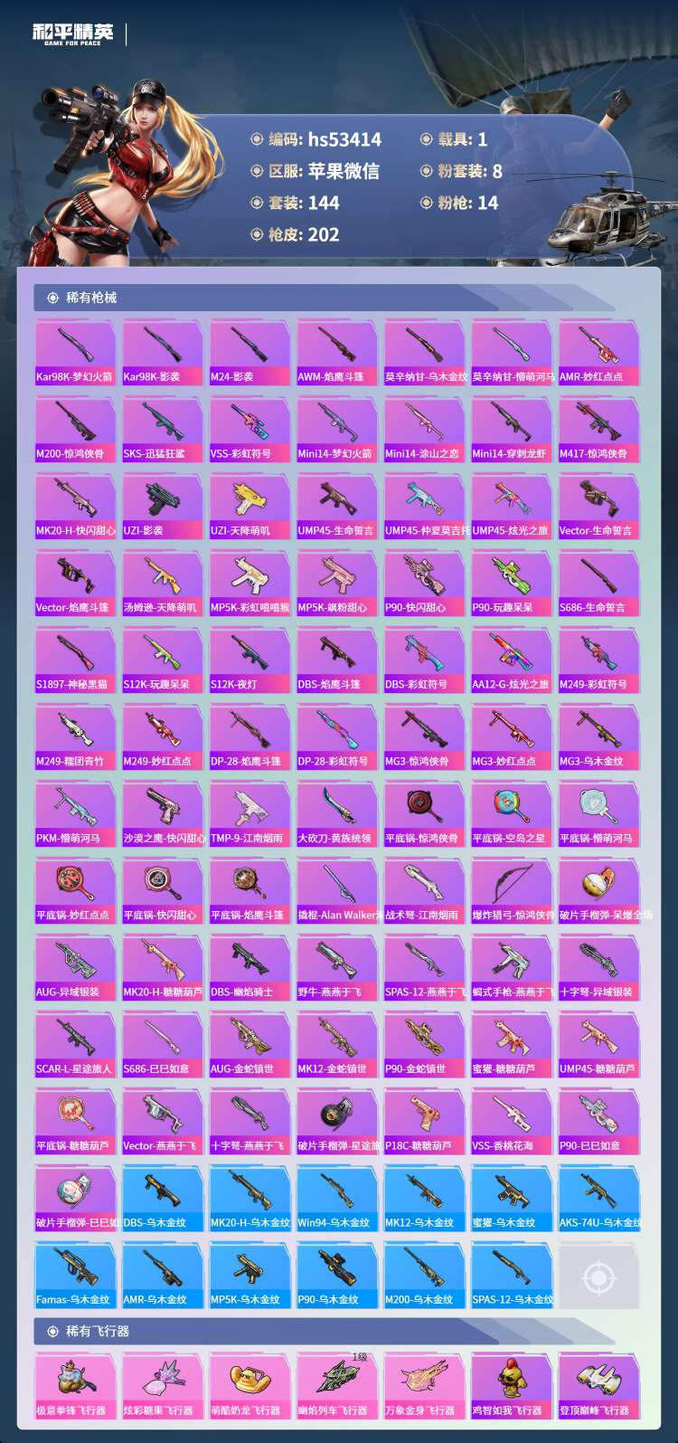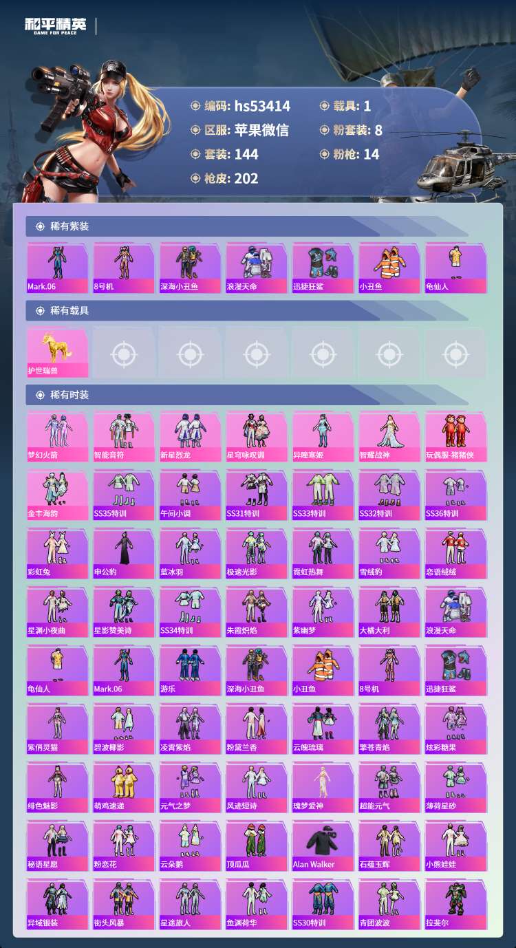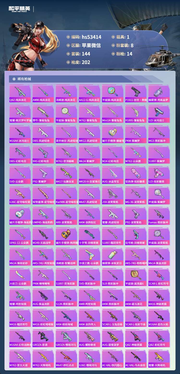 hs53414 苹果微-10王牌印记-8粉装-14特效枪-1载具-70342热力值-144套装-2