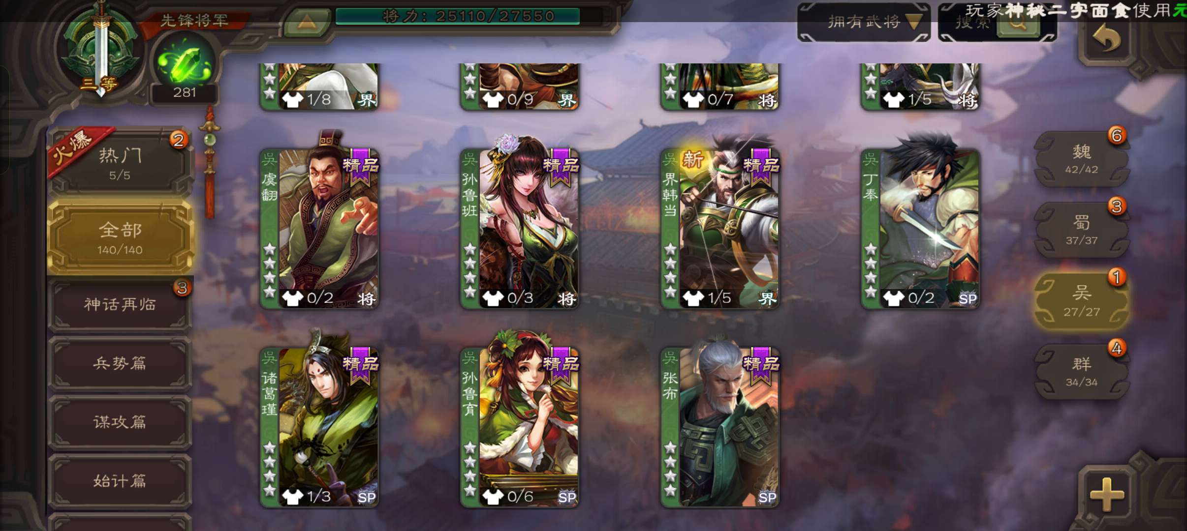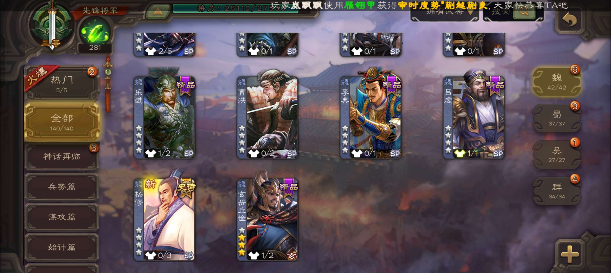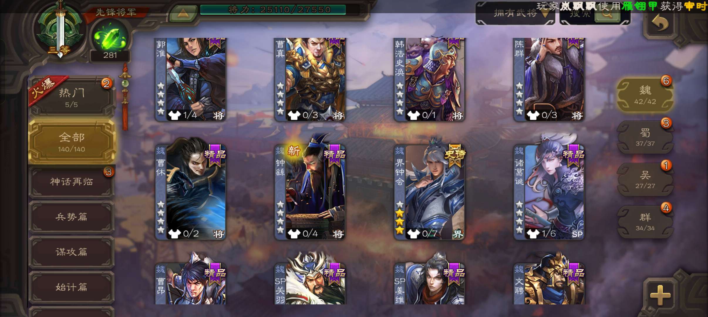 5史诗先锋,带皮天工玄母丘倹,界钟会沙摩柯谯周董允杨修,真动孙尚香甘夫人谋高顺谋小乔桥公张布140将