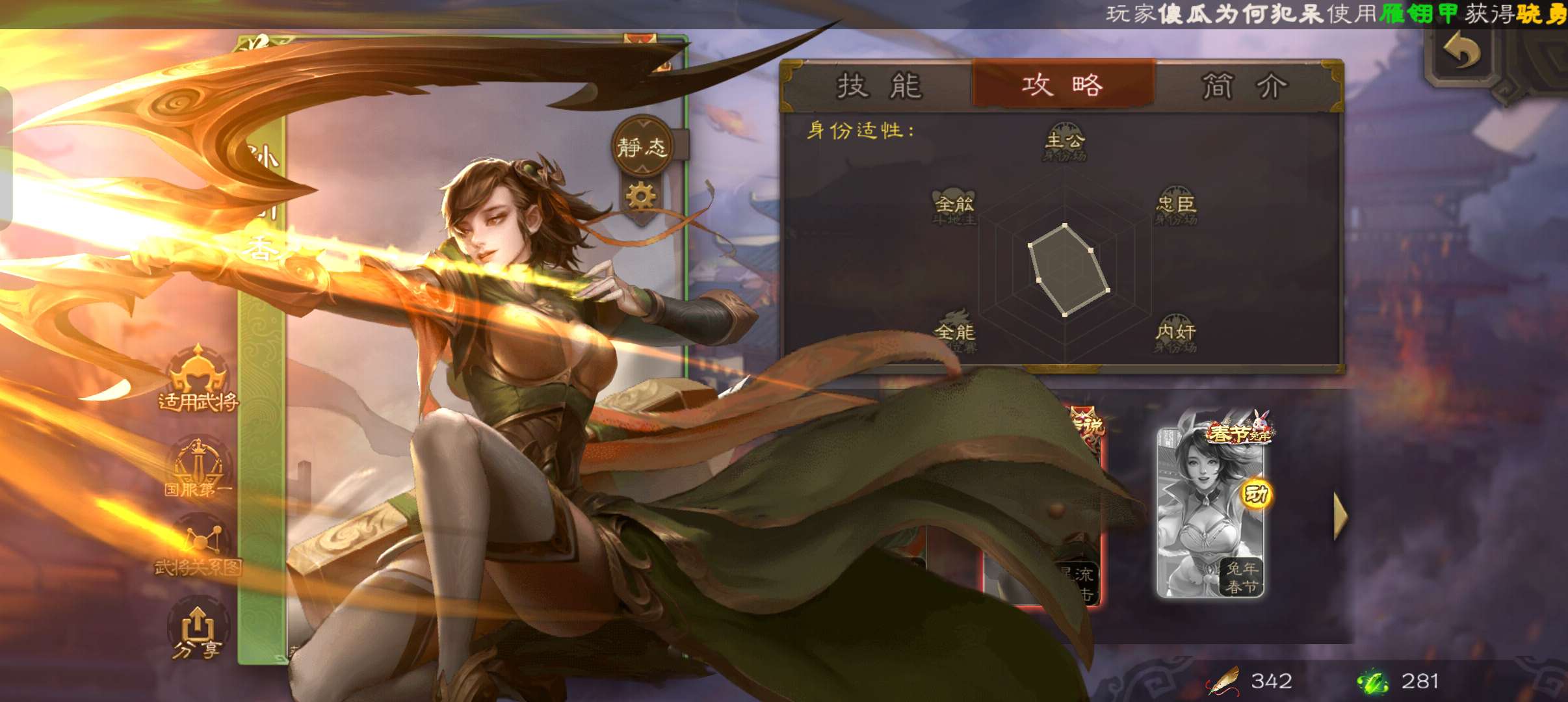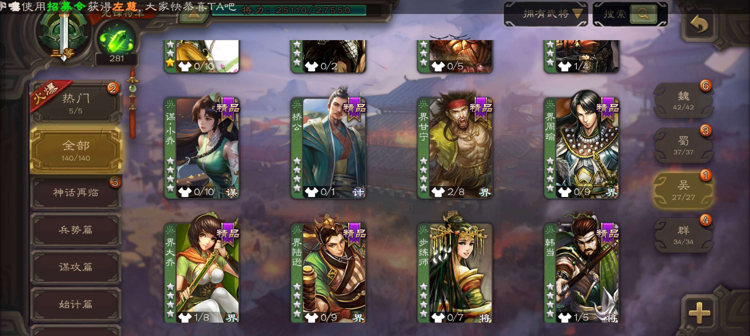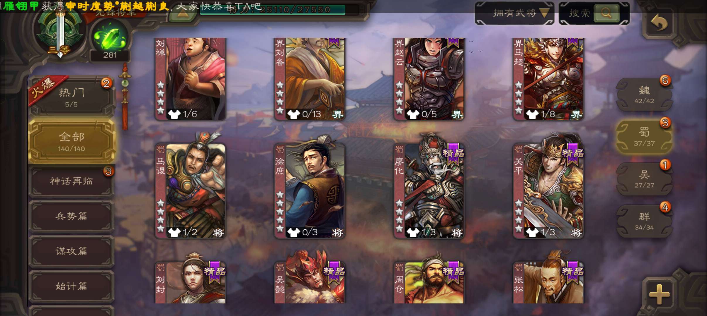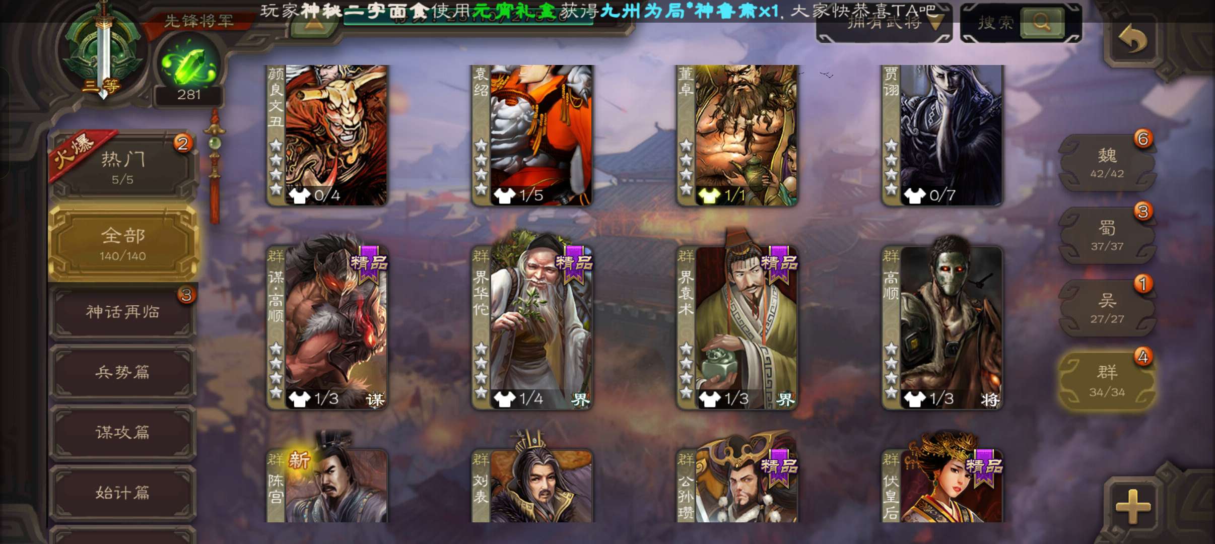 5史诗先锋,带皮天工玄母丘倹,界钟会沙摩柯谯周董允杨修,真动孙尚香甘夫人谋高顺谋小乔桥公张布140将
