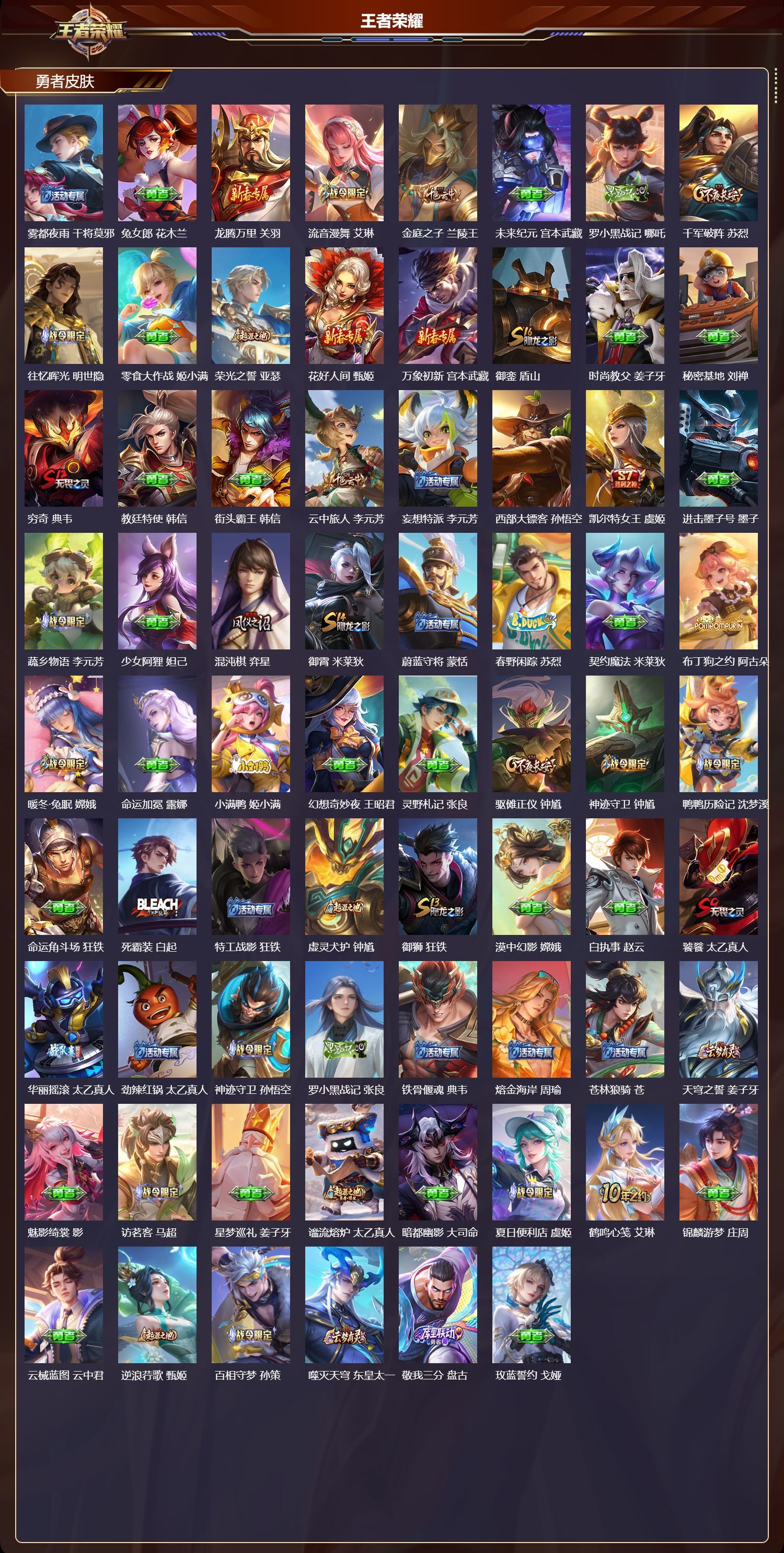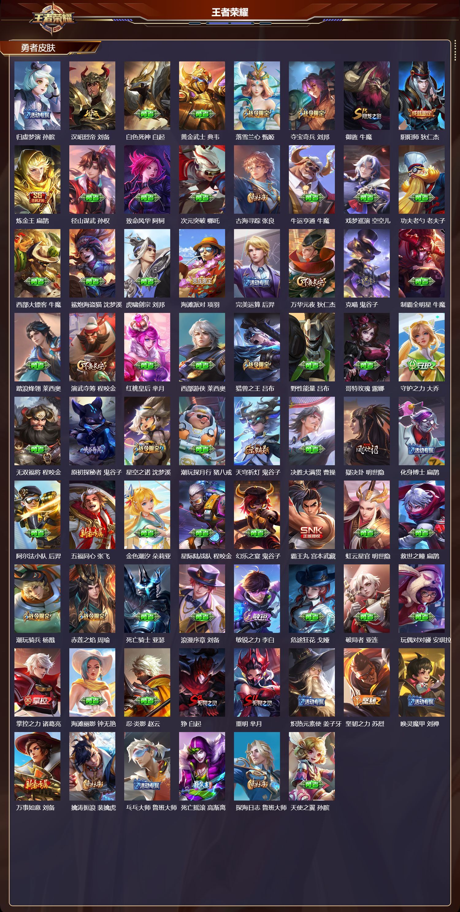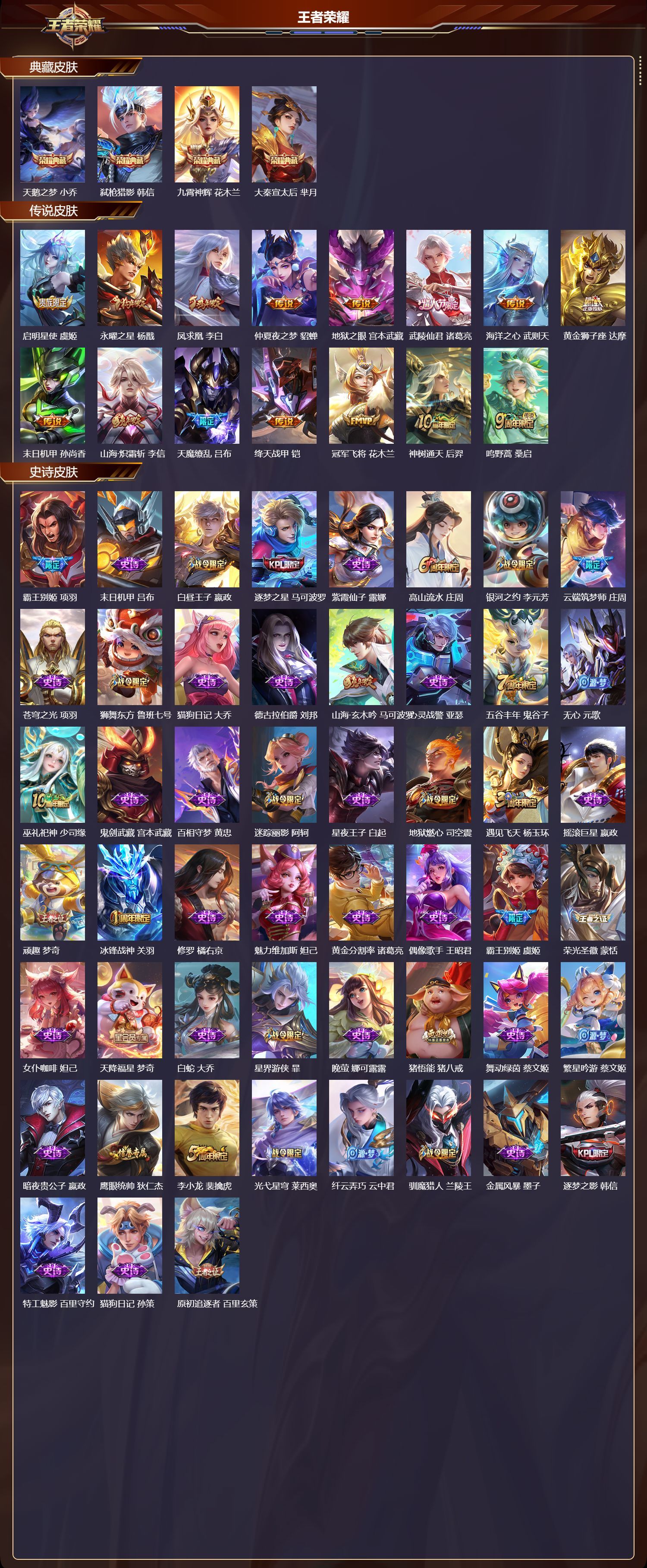 苹果QQ/荣耀王者/365皮肤/128英雄/4典藏/0珍品无双/0无双/0珍品传说/15传说/101