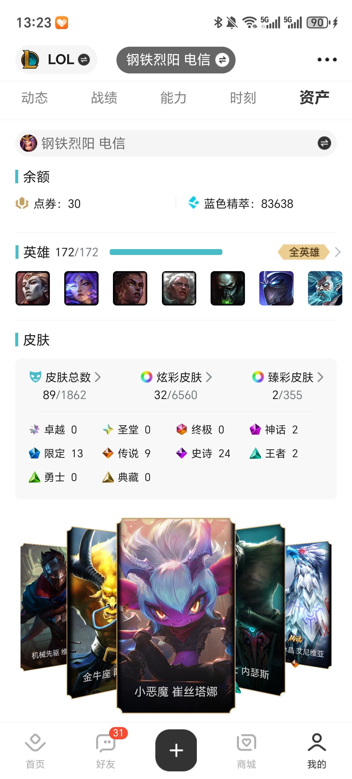 三个区160个皮肤 一区上赛季大师 目前钻二